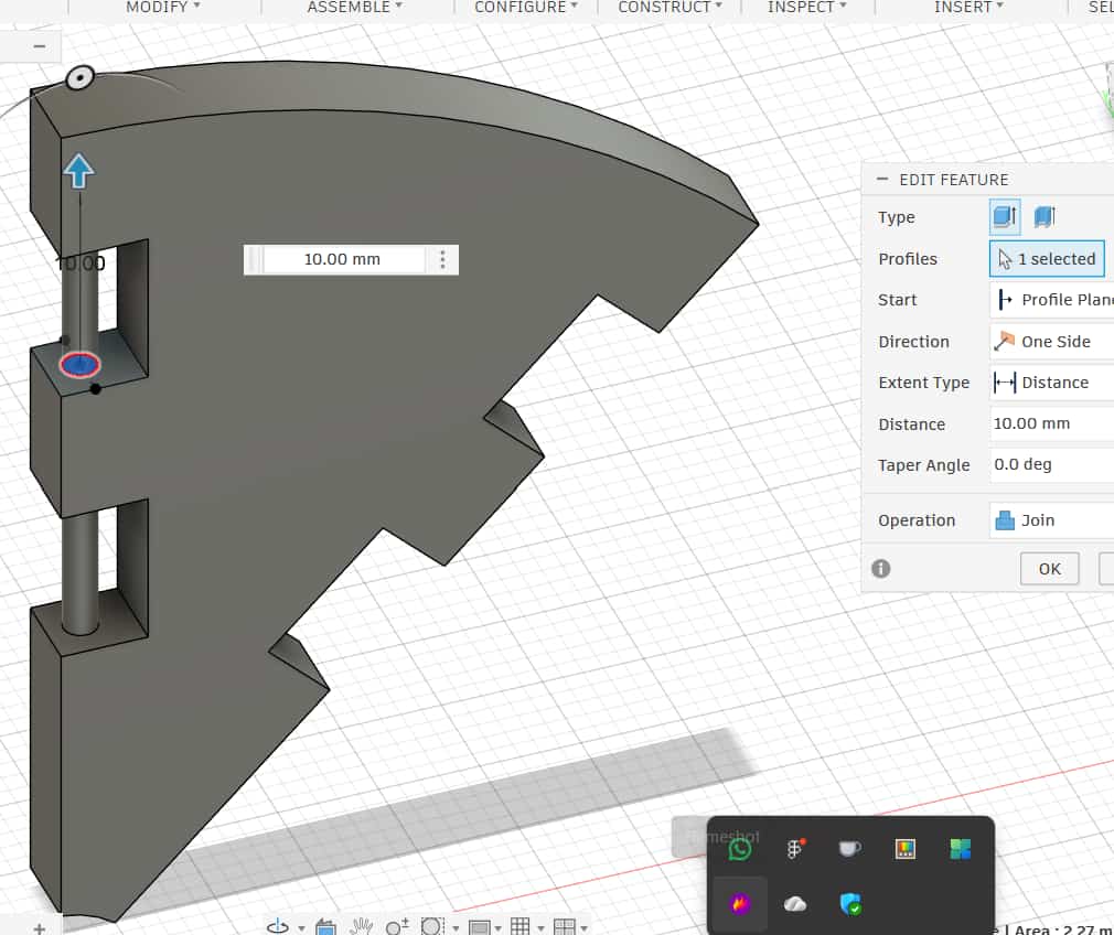 I started by drawing a circle and sketching a 45° triangle inside it. Then used the Offset Tool with a value of 0.5 mm. The first sketch line was converted into a construction line using the X Key, and created a slot profile. After completing the sketch, used Extrude to form the flap body.