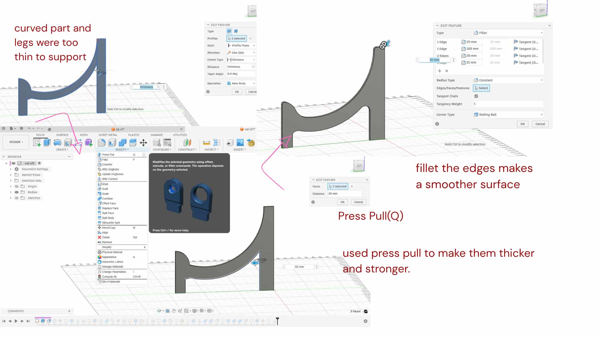 The curved part and legs were too thin to support the chair properly, so I used Press Pull to make them thicker and stronger.