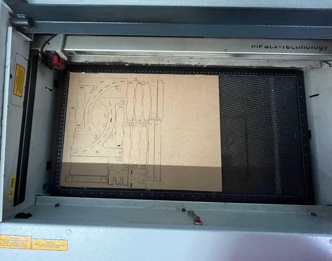 Before cutting the final plywood model on the ShopBot, tested the design using cardboard on the Trotec laser cutter. To check the fit of joints, dimensions, and overall assembly. This helped identify design errors early, saved material, reduced machining time, and prevented costly mistakes on the final plywood.