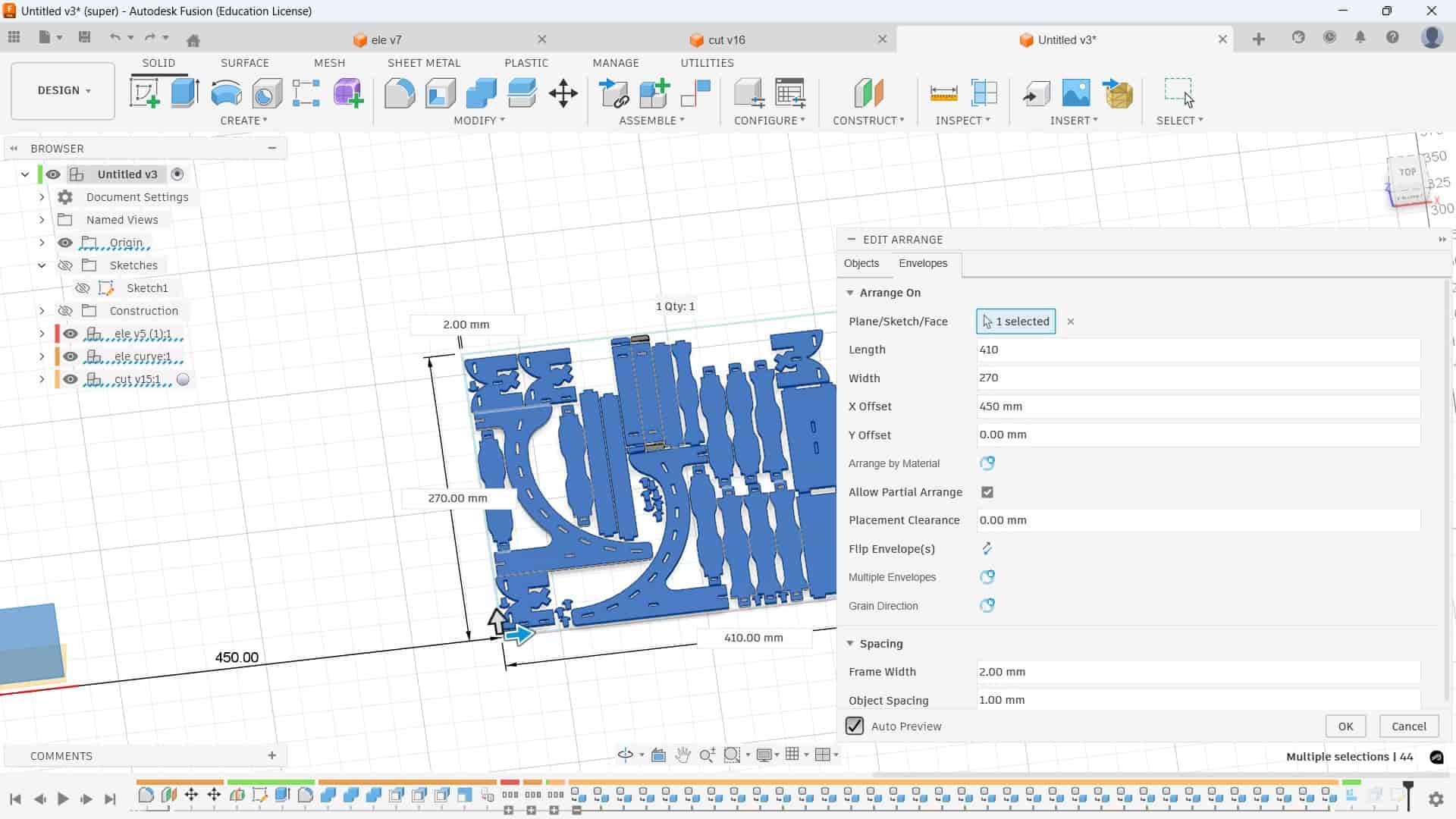 To make the slots on the curved part, I drew an arc between the legs and created a 45 mm curved slot. The slot width was set to material thickness minus 0.1 mm clearance. Using a circular pattern, I made 9 slots along the curve, and added 35 mm slots at the bottom of the legs.
