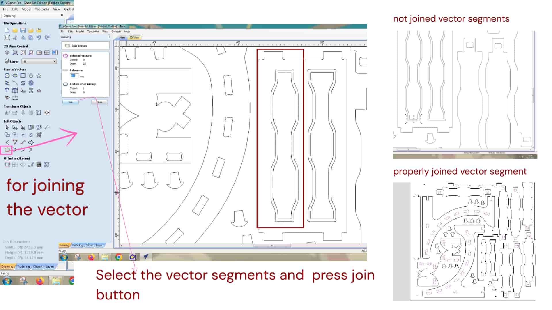 In VCarve, all vector sketches need to be joined and closed because toolpaths follow the vector boundaries.