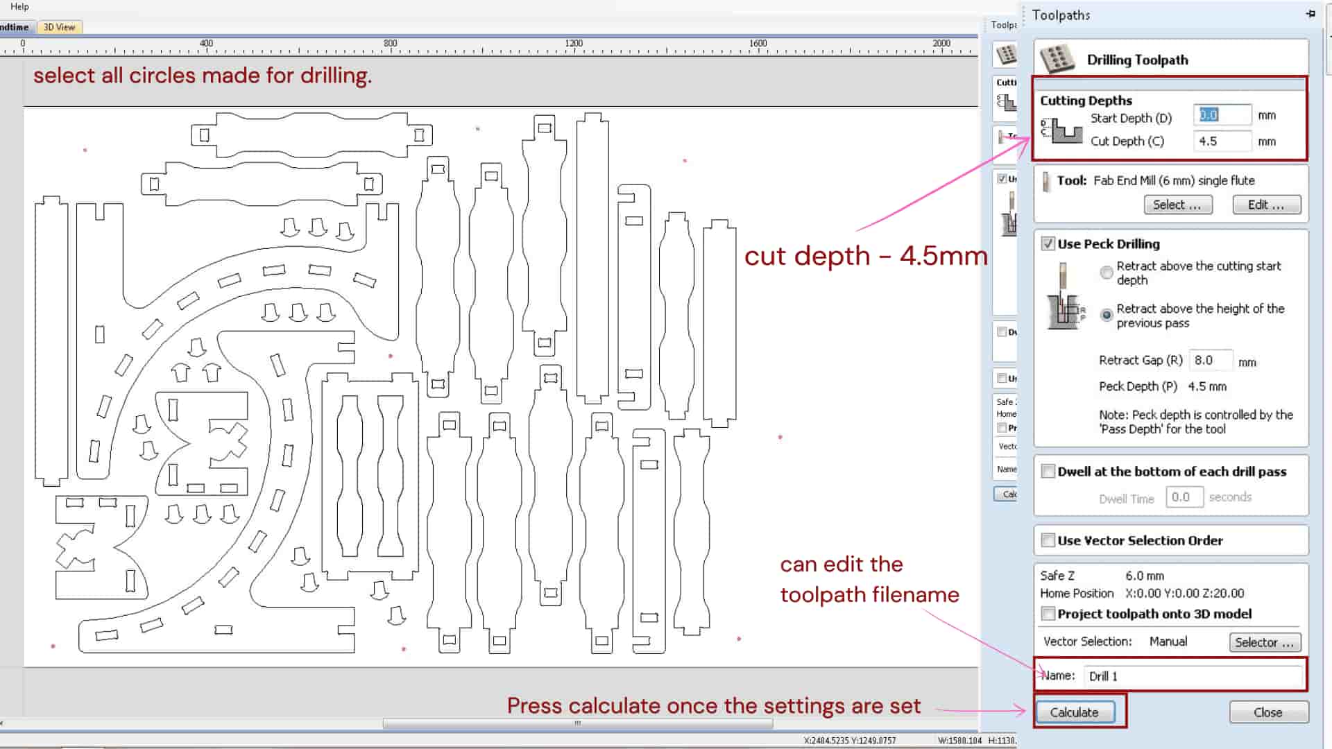 We mark circles in the file where screws are needed and generate drill paths using the Drilling toolpath with a specific cut depth. As i gave 4.5mm as cut depth