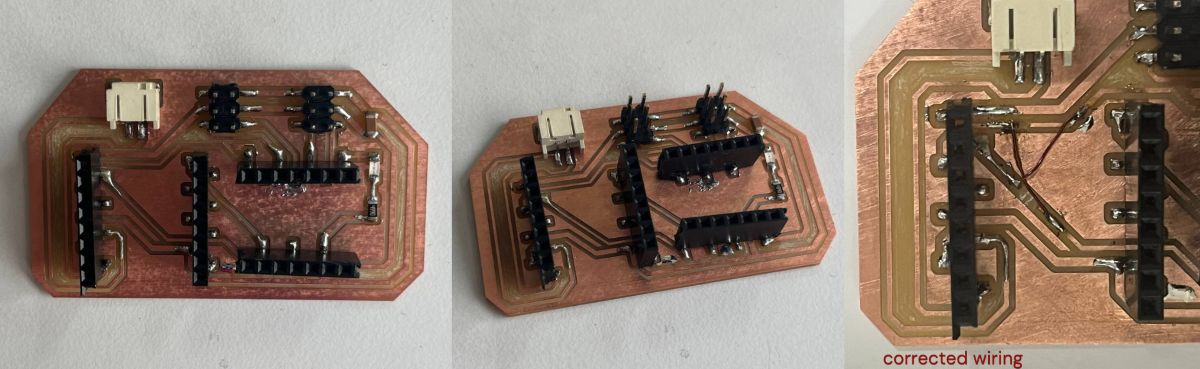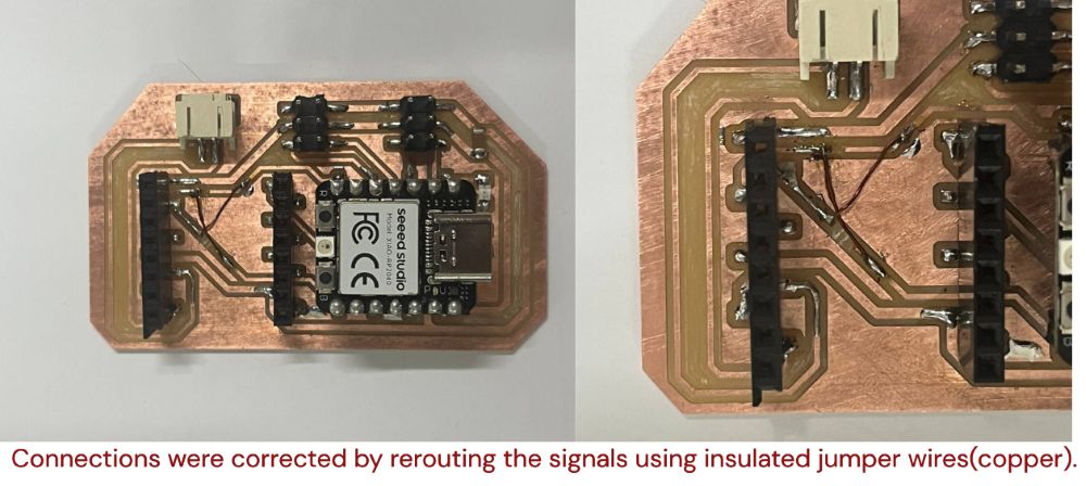 To fix this issue, the connections were corrected by rerouting the signals using insulated jumper wires(copper). The development board's TX pin was connected to the module's RX pin, and the development board's RX pin was connected to the module's TX pin.