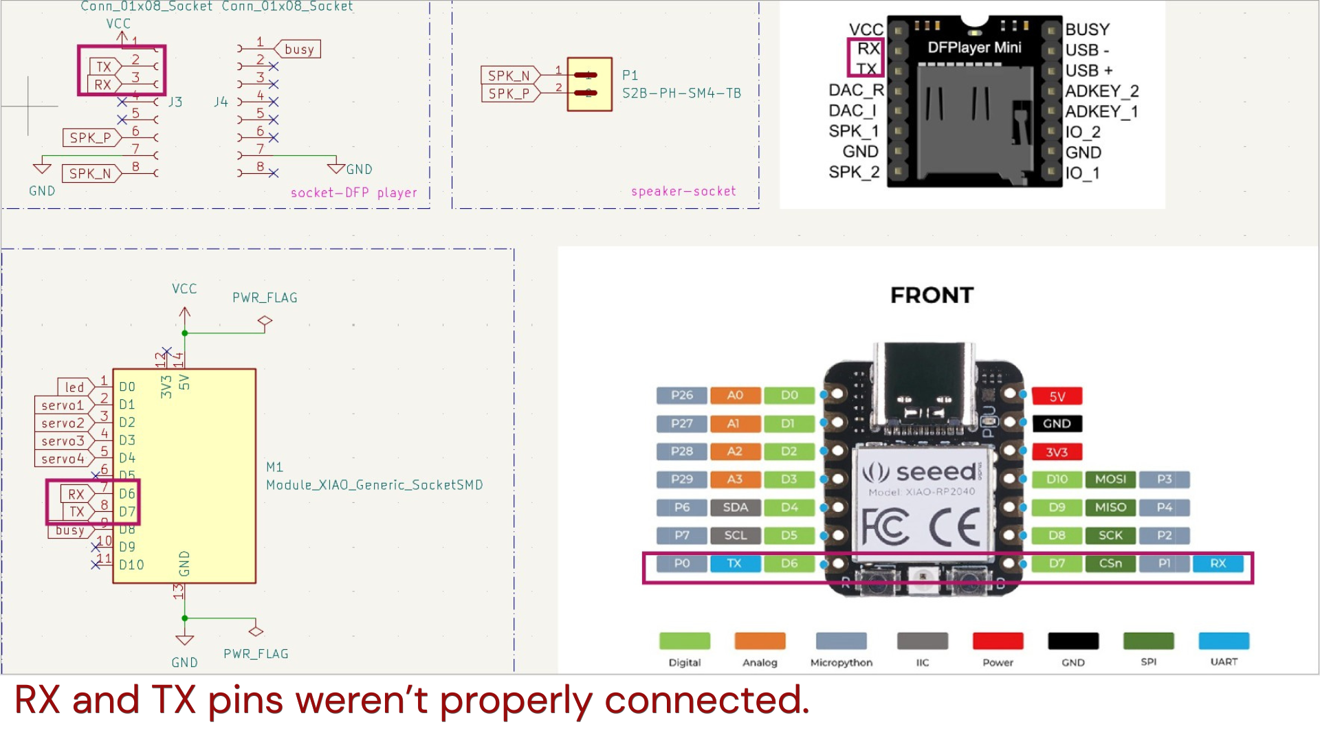 I accidentally swapped the connections on both the DFPlayer and the XIAO RP2040 during PCB design.