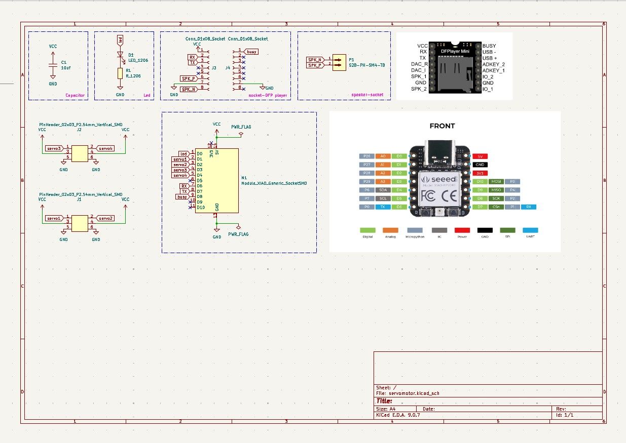 a servo motor connected to D1, and a DFPlayer Mini module