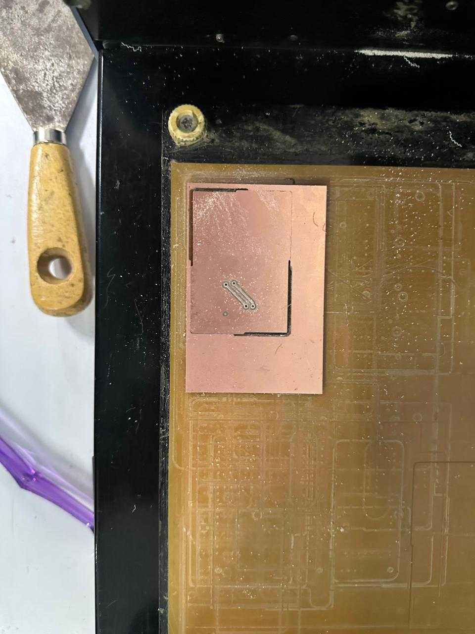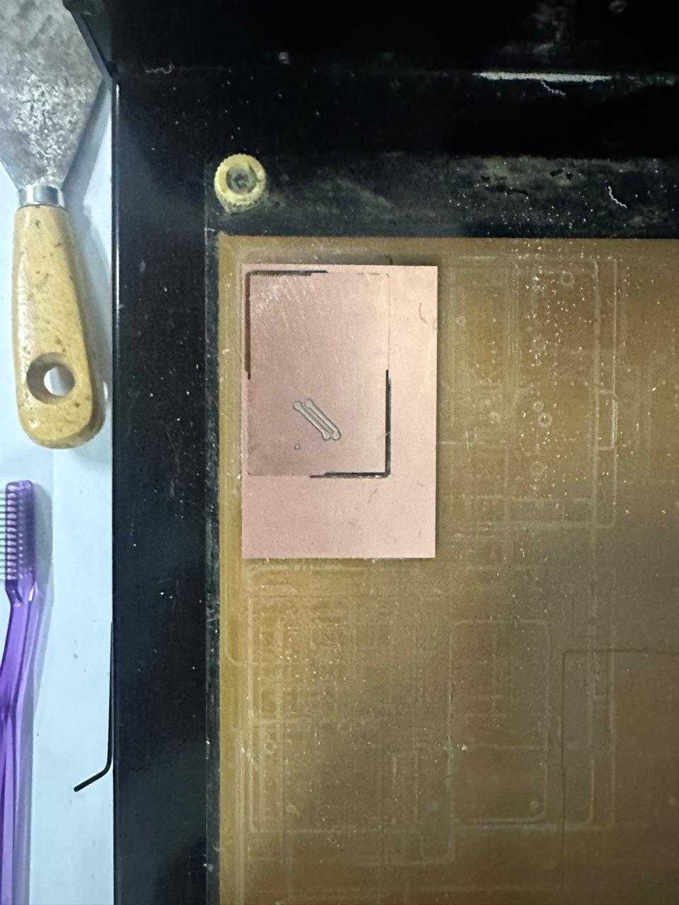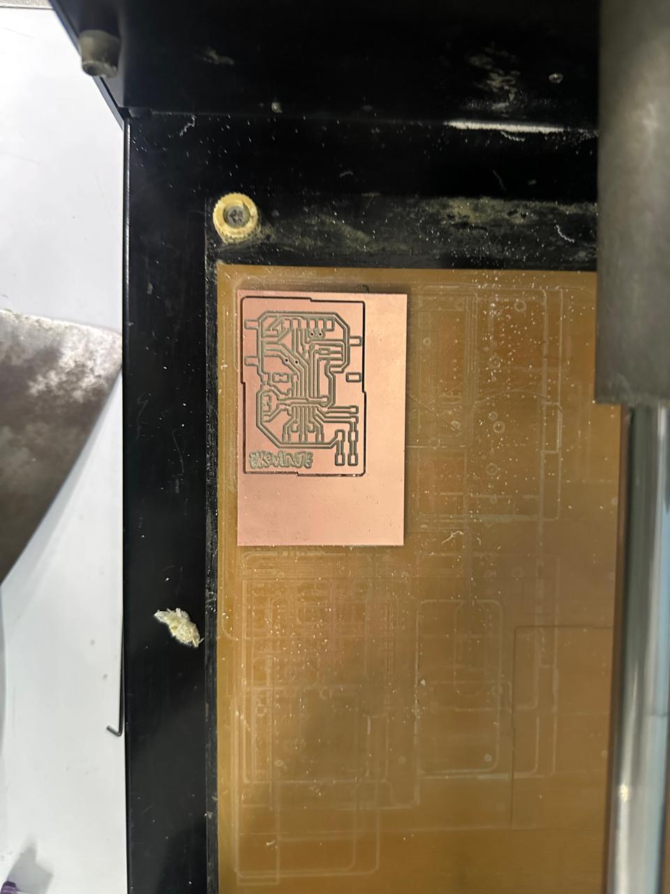 We will etch the traces first. Work from inside to outside: traces → drills → outline.