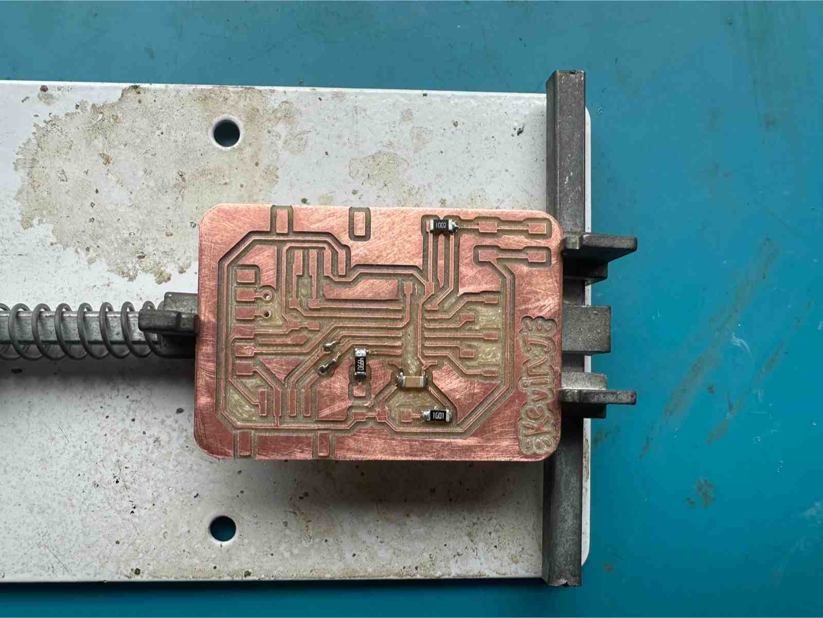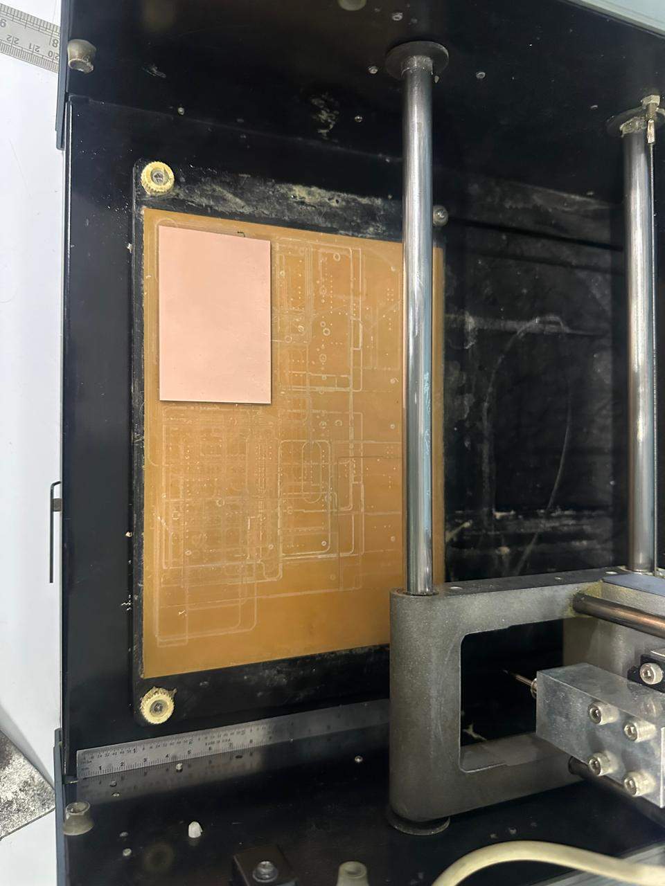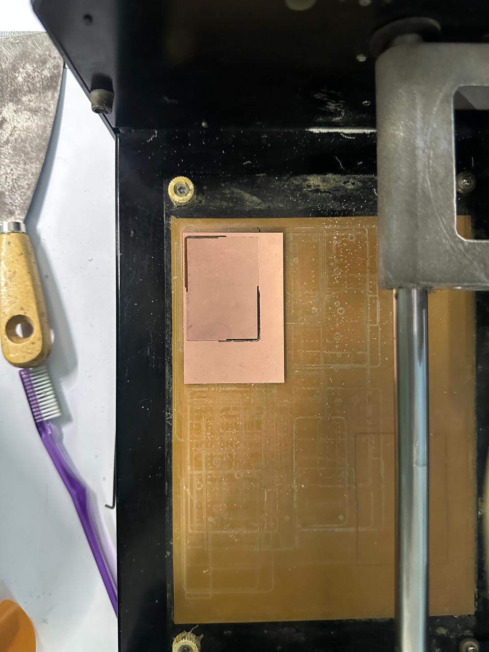 We will etch the traces first. Work from inside to outside: traces → drills → outline.