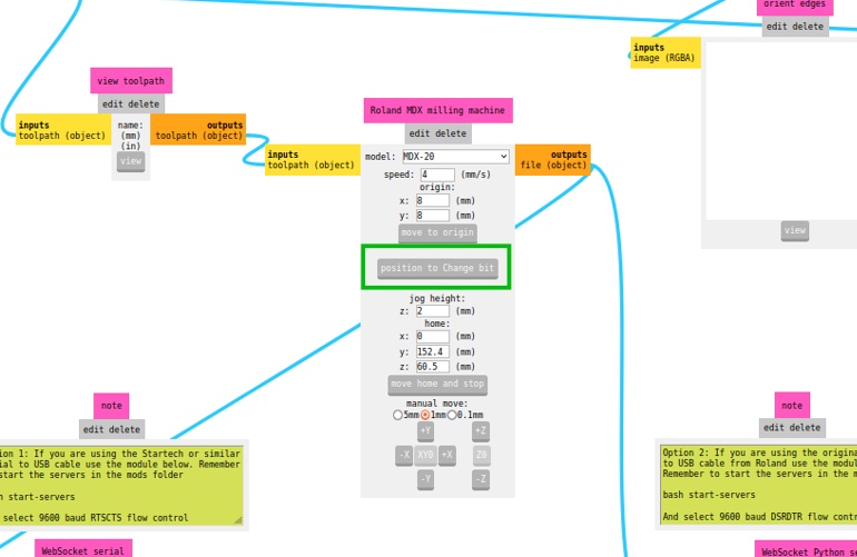To change bits, move the spindle to a safe position using MODS.