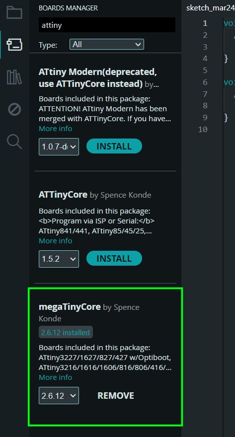 Now, in Boards Manager, install MegaTinyCore to your local libraries.