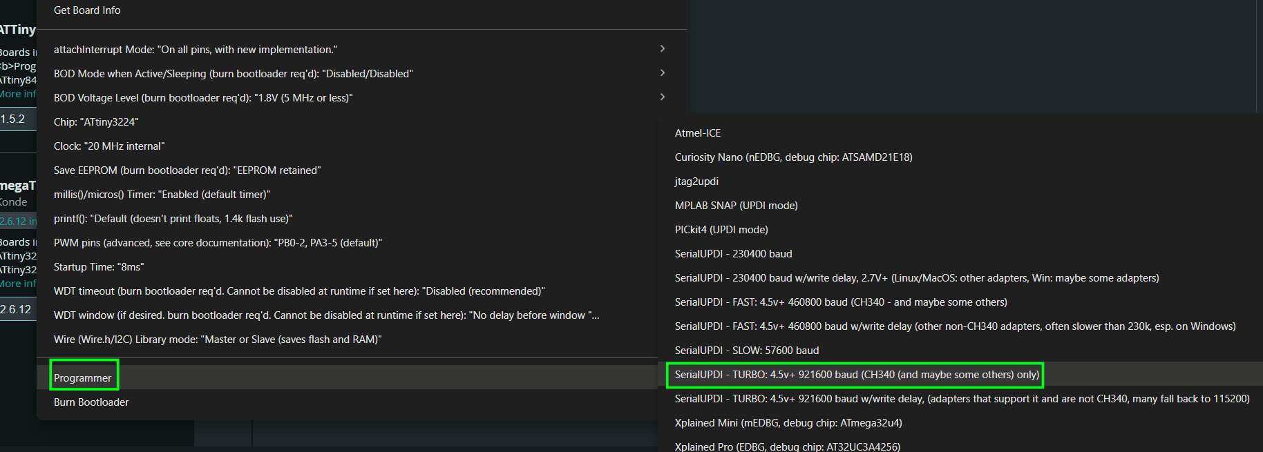Then select the UPDI programmer. Everything should work; I chose the fastest option (Turbo).