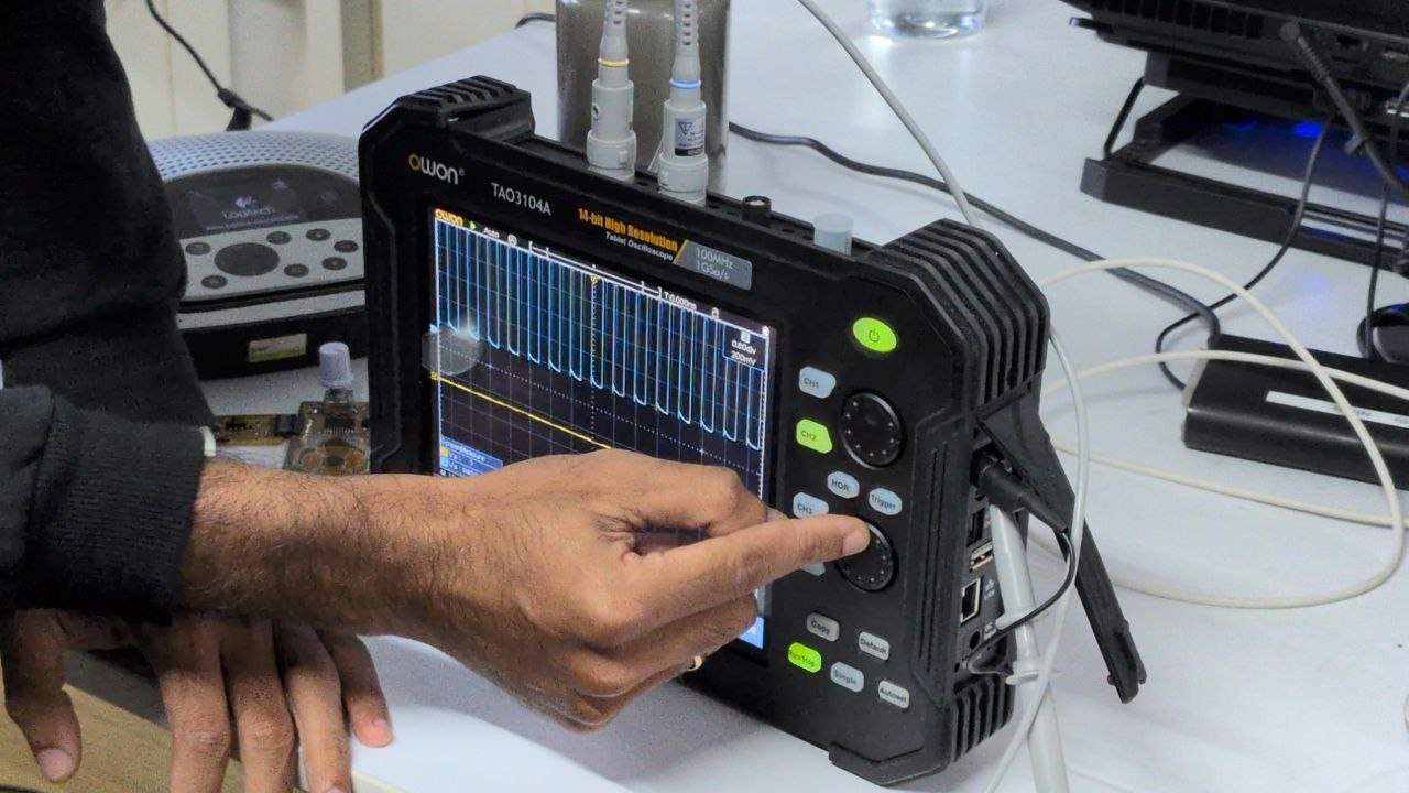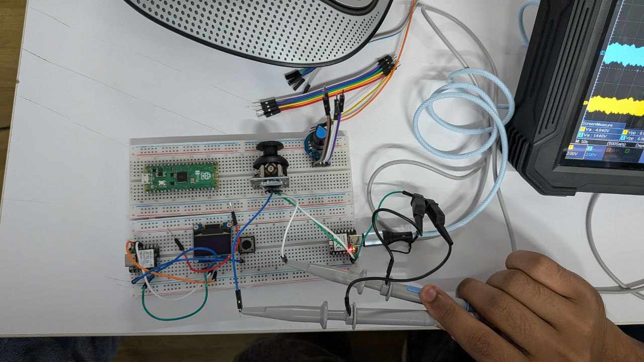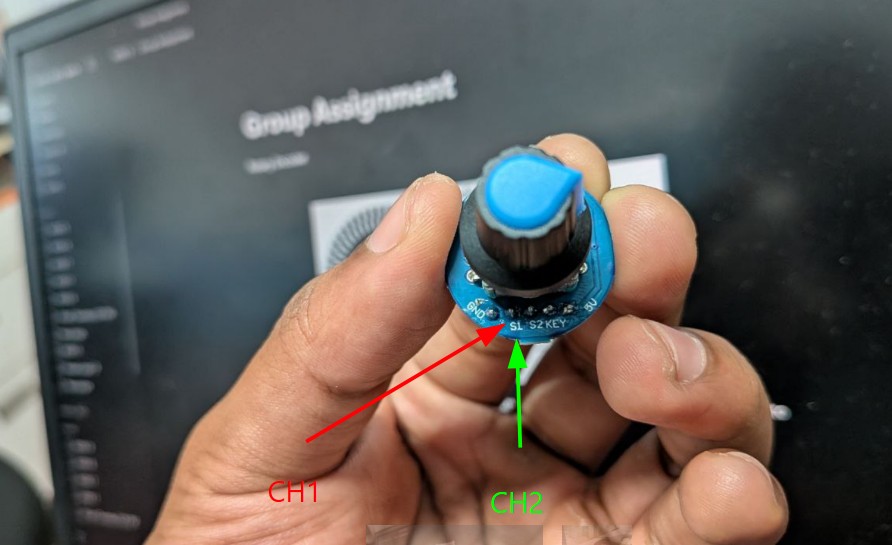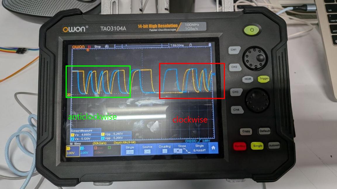 In this setup, the S1 and S2 output pins of the encoder were probed using Channel 1 and Channel 2 of the oscilloscope, with a common ground connection.