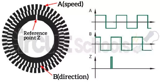 The encoder generates two signals that are offset by 90 degrees, known as quadrature signals. This phase difference allows us to determine the direction of rotation, since one signal will lead or lag the other depending on how the shaft is turned.
