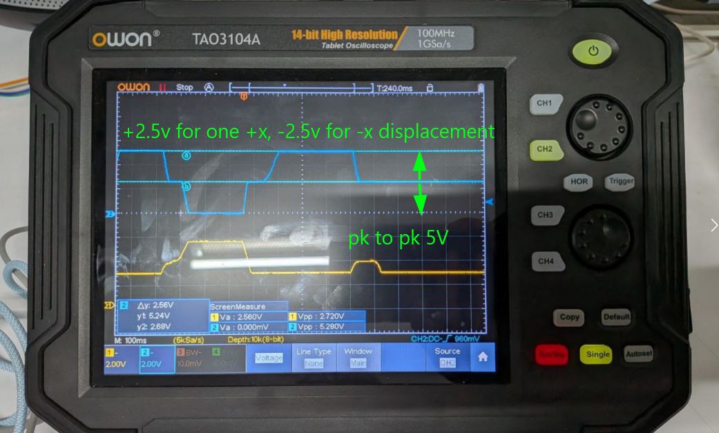 In this case, it uses two output pins, VRx and VRy, to represent horizontal and vertical positions. These were probed using Channel 2 and Channel 1 of the oscilloscope respectively, with a common ground connection.