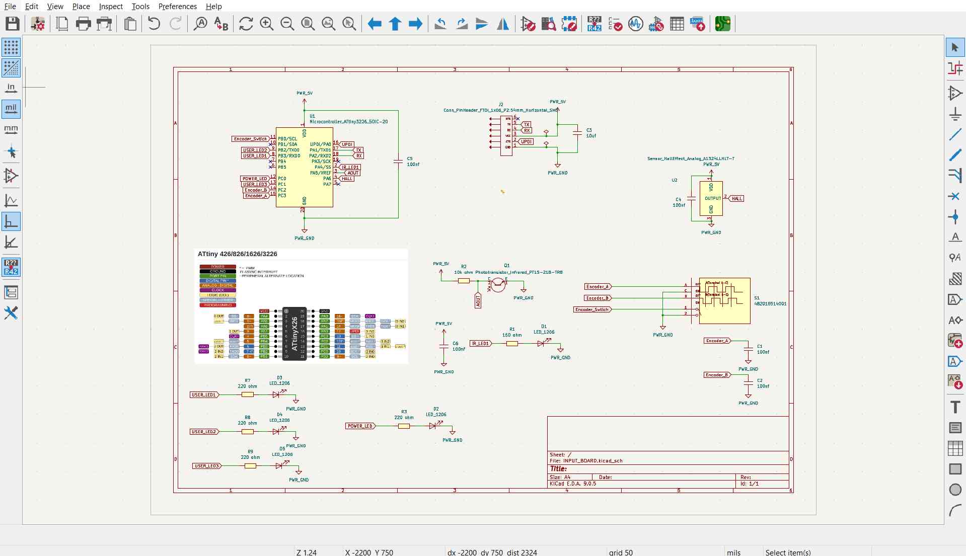 The ATtiny3226 was used as the main microcontroller. It provides enough GPIO pins for all the sensors and inputs in this setup. It also has PWM outputs, which are useful for driving the LED, and a 12-bit ADC, which gives better resolution when reading analog signals from the phototransistor. The chip runs at up to 20 MHz, which is more than sufficient for this application.