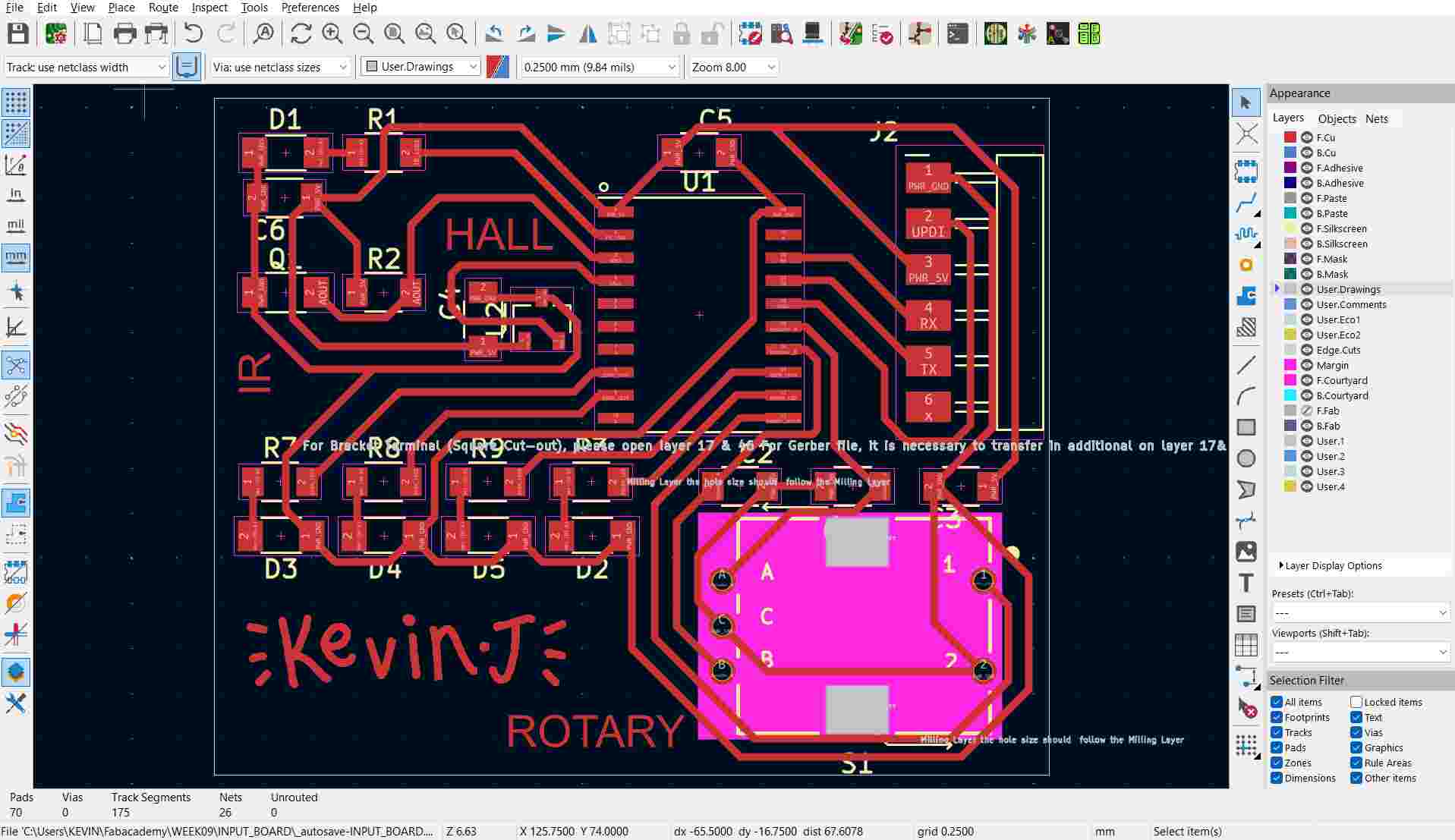 The PCB was designed as a single-sided board. At this stage, it was ready for fabrication, with plans to mill, solder, and test all input sensors.