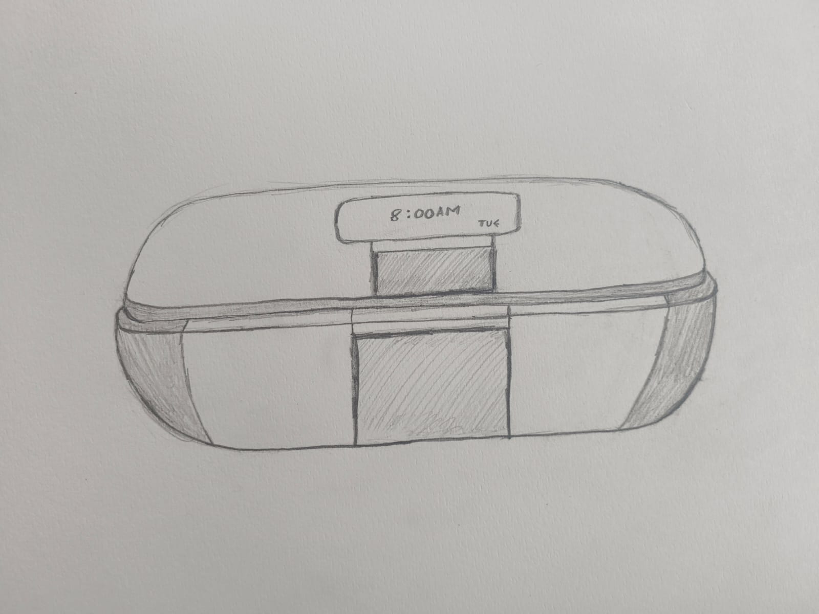 The shape is an oval,a big pill lying flat. It came from the sketch below. I started drawing it and realised that the body of the dispenser being pill-shaped was almost too obvious, and that meant it was probably right. The hand-drawn version shows the three key parts: the screen at the top, the horizontal seam that splits the body open for refilling, and the dispensing door at the bottom that opens downward to drop the pill out.