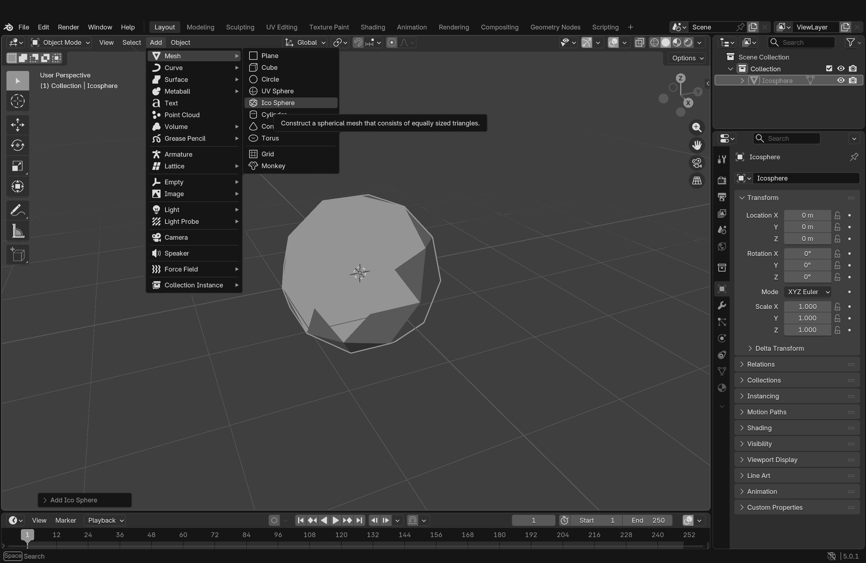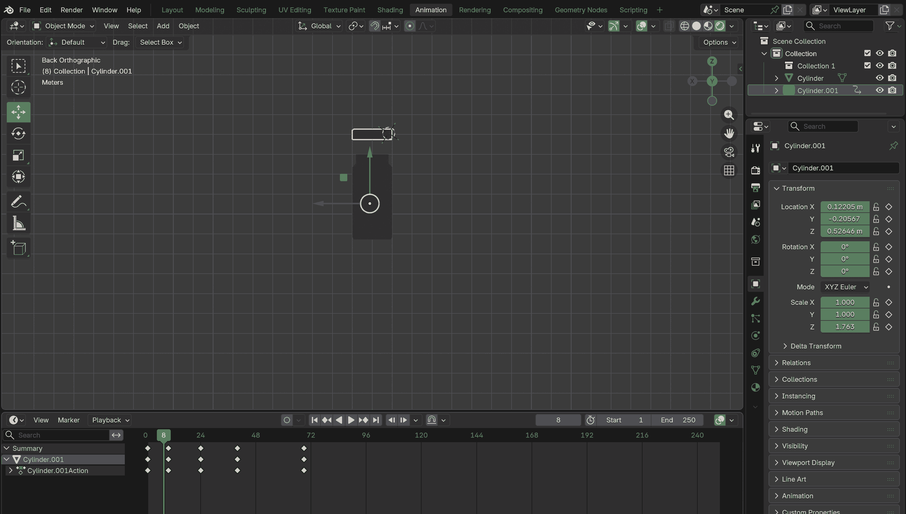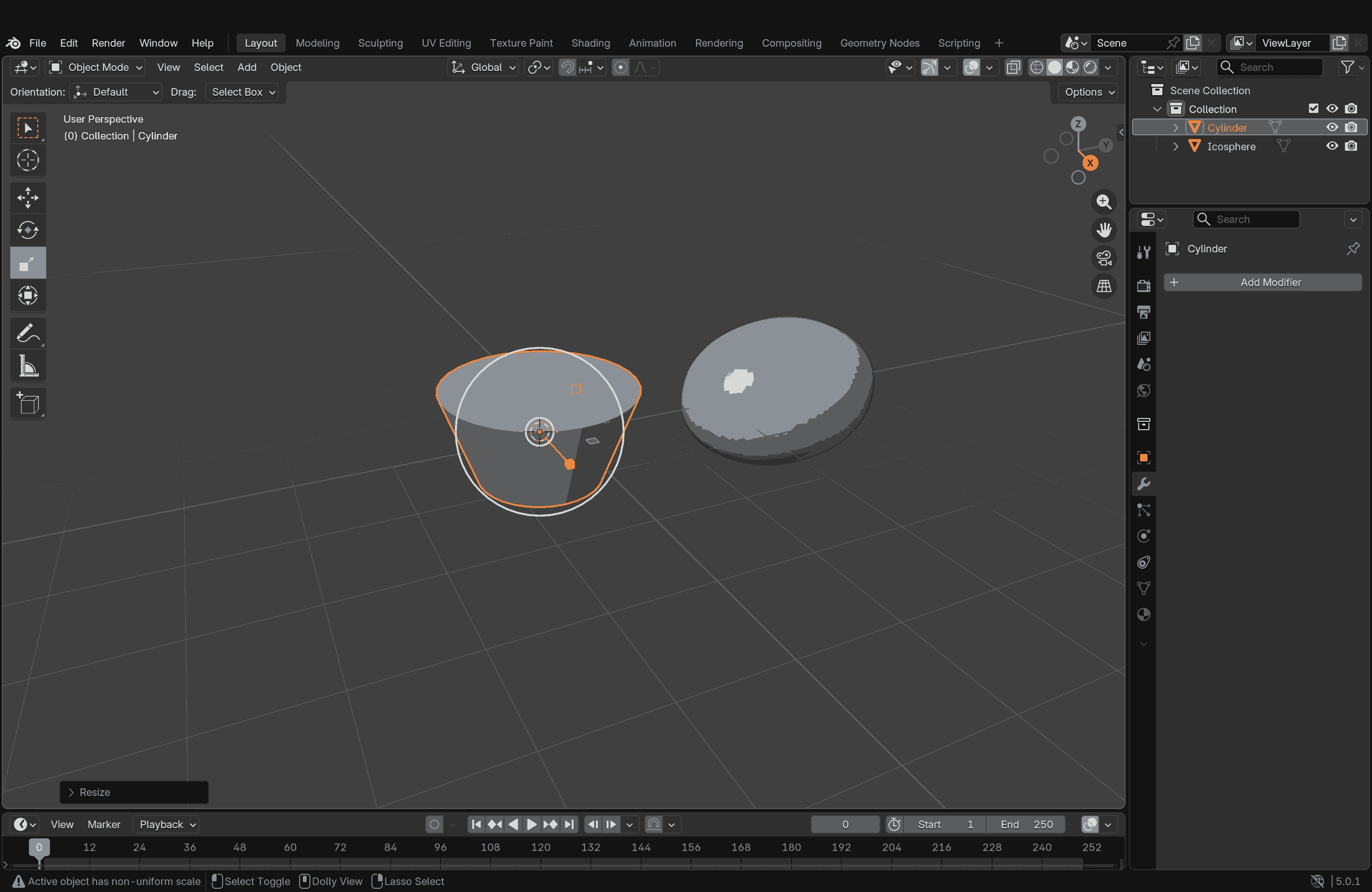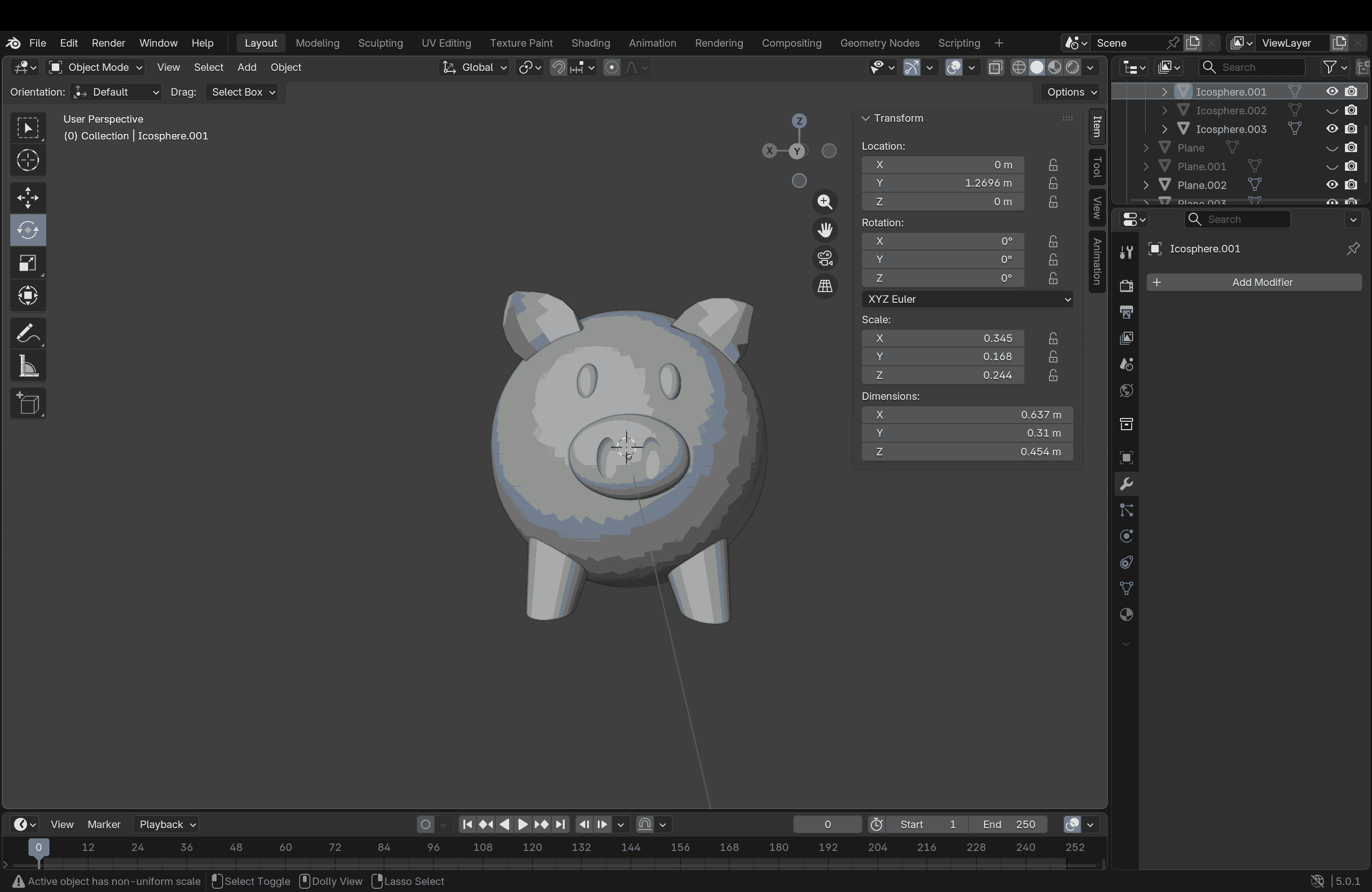 This time, I started with an Ico sphere and subdivided it for a smoother surface. I elongated the sphere along one axis, this formed the main body of the piggy bank. To give it legs, I started with a cylinder and, in Edit Mode, manipulated its diameter on one end to make it narrower, then scaled it down to match the piggy bank leg profile. Once I finished one leg piece, I used a Mirror modifier to replicate the second leg, keeping the main body (the elongated sphere) as the mirror object.