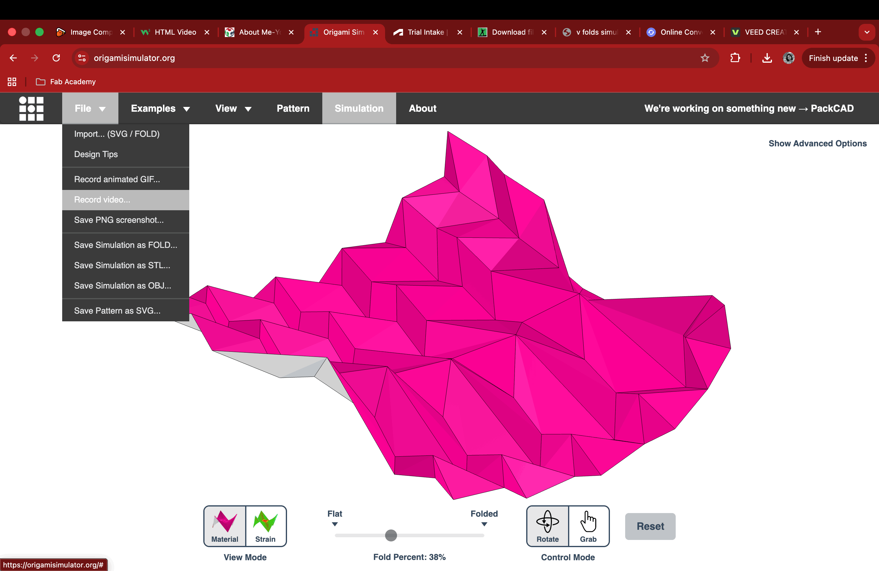 Then I finally uploaded my svg fold pattern on the Origami Simulator platform and it showed the folded version with a fold percent bar at the bottom to simulate the degree of folds.