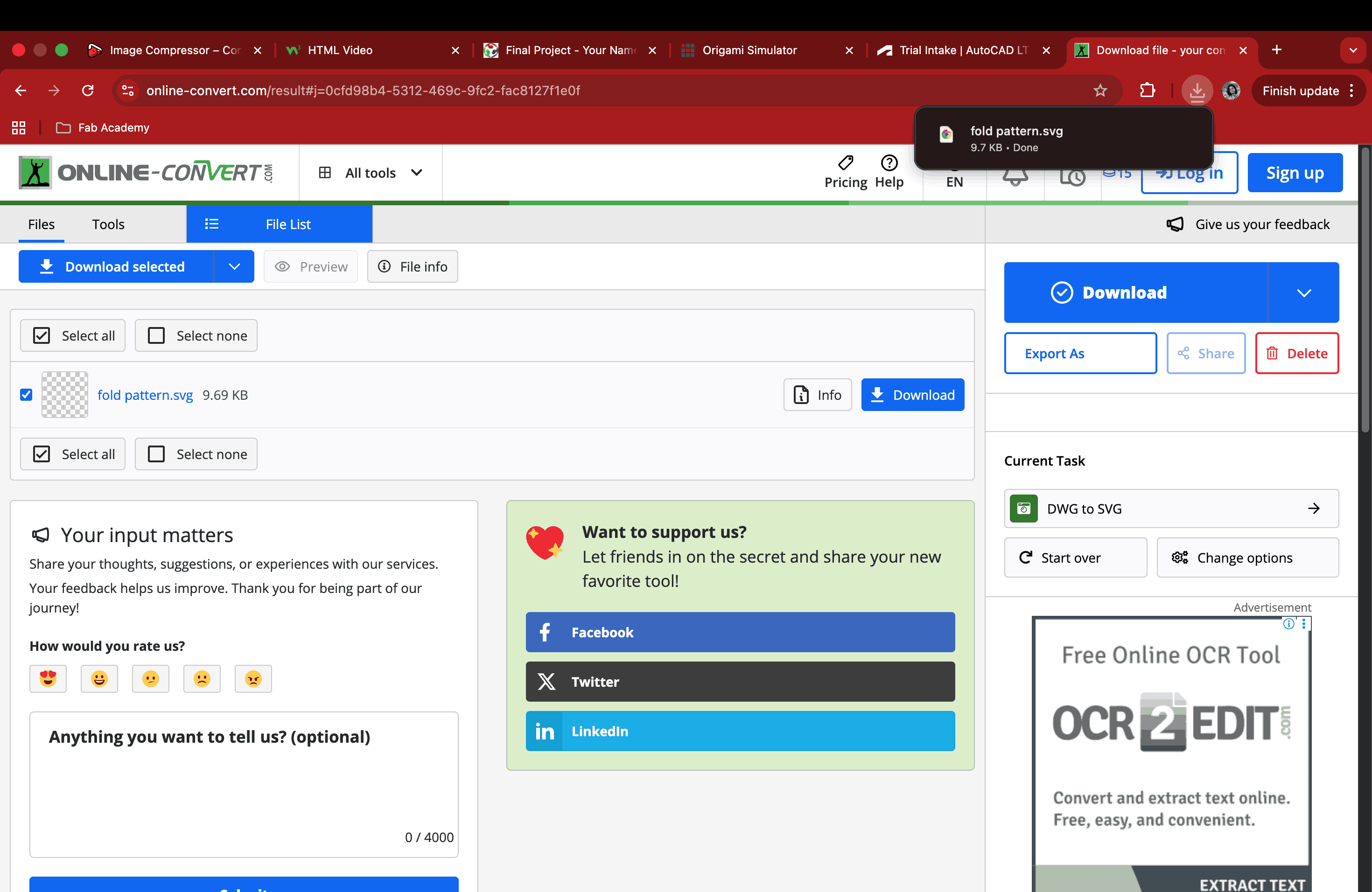 In terms of 2D software, although I could only use the trial version of AutoCAD, it felt like home because I had used it extensively during my college days. It was also very easy to assign colors to lines in AutoCAD, something I could not figure out in Inkscape or Fusion. Since this step was absolutely necessary for the origami simulation and would not work without color coding, I decided to download the trial version. Simulating the fold always feels like magic to me. I am usually a hands-on person, and I would normally sit, draw, and crease every single fold by hand to understand what works and what does not. Doing it this way, digitally, truly feels like magic.