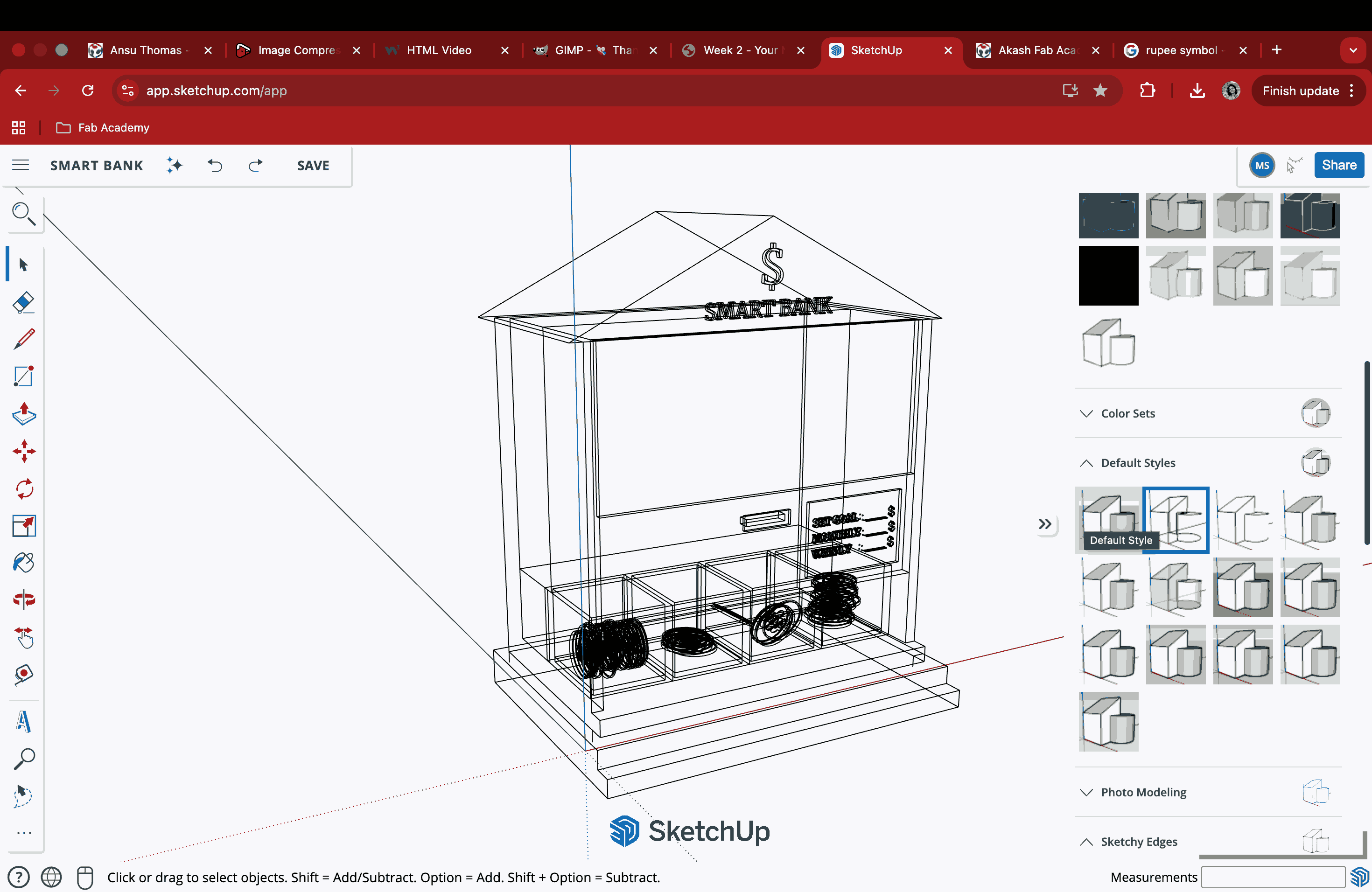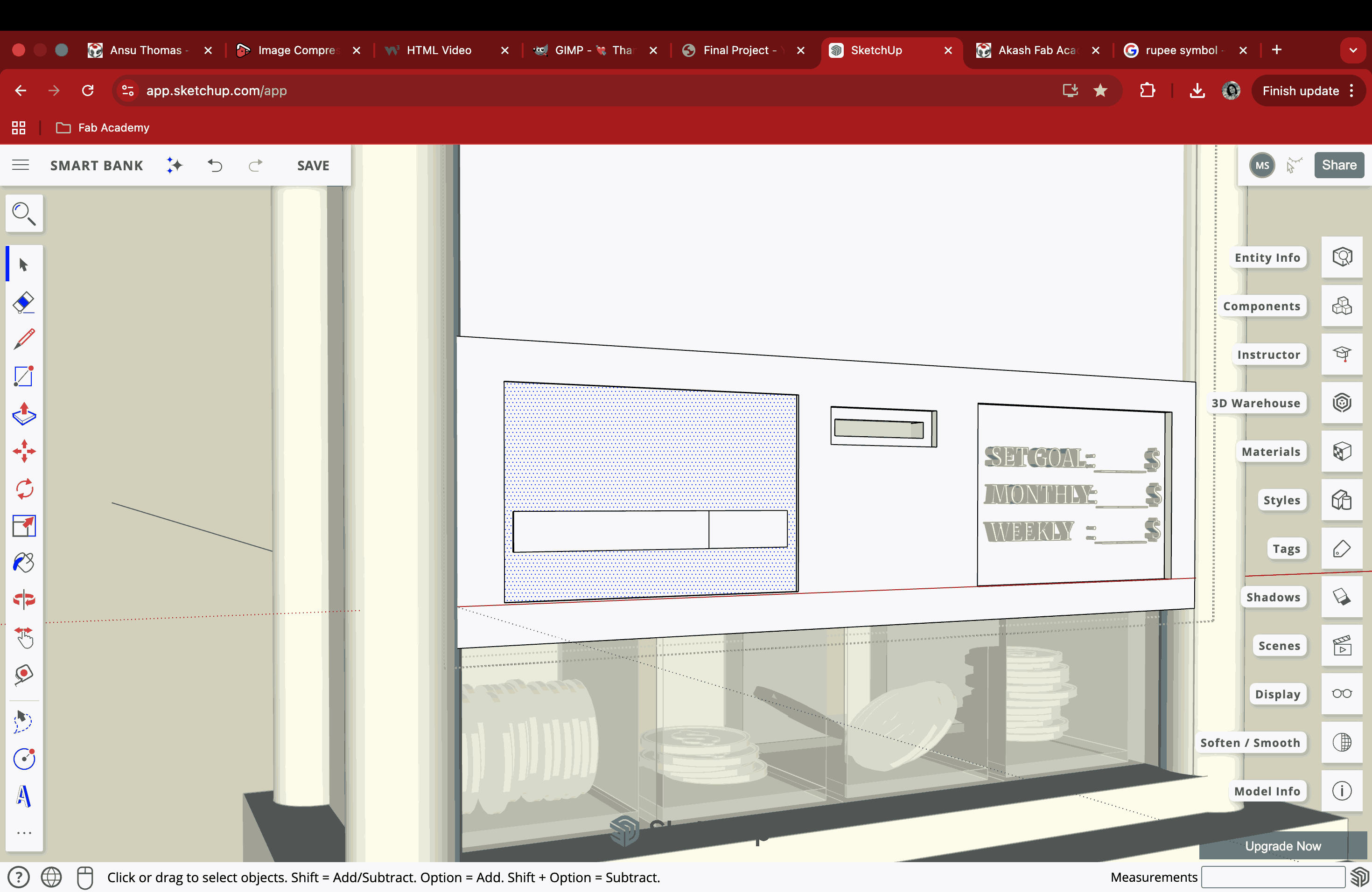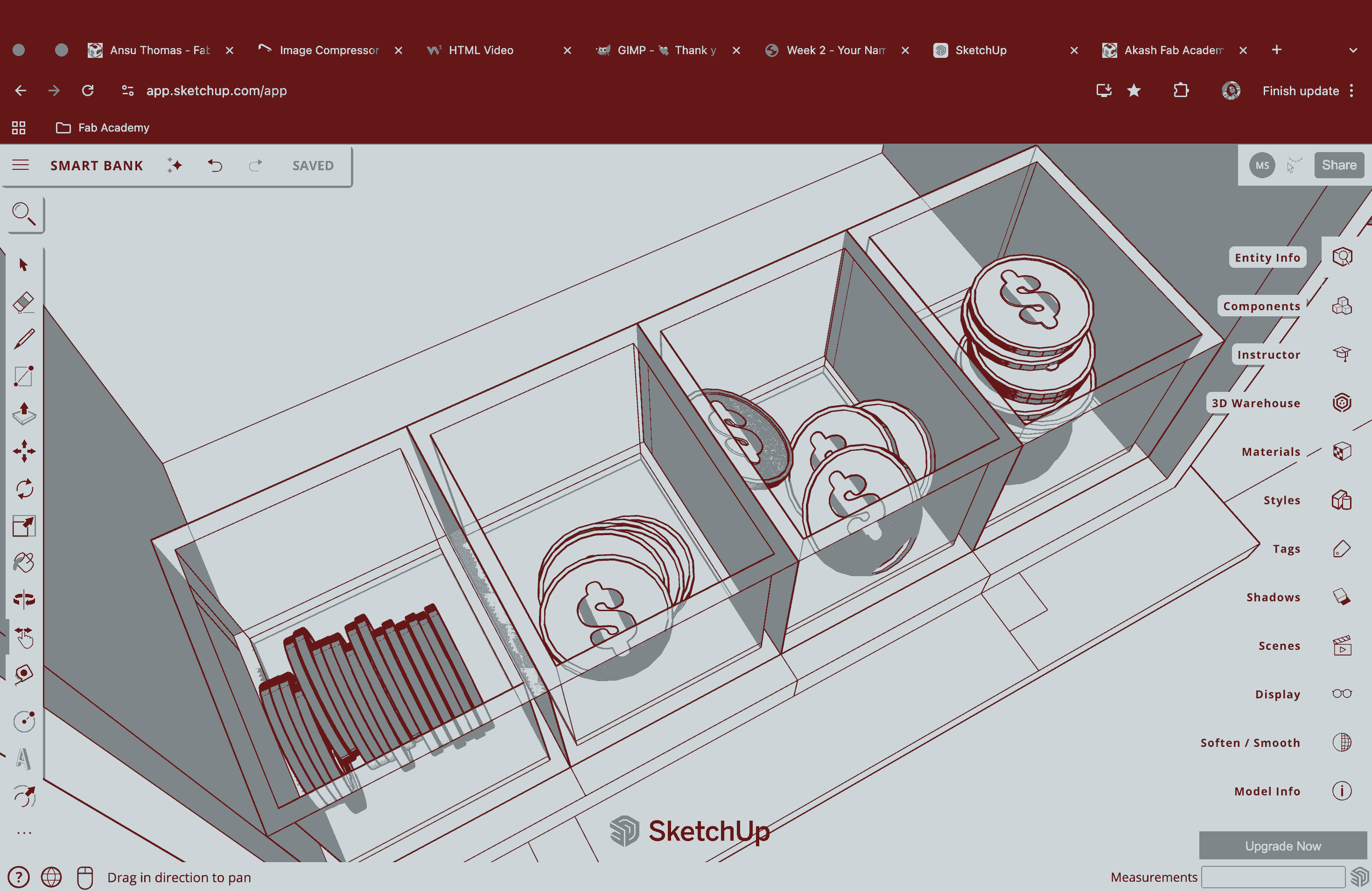 From the initial sketches I made, I had a rough idea of what the model should eventually look like. I started with a basic rectangle in SketchUp and extruded it to create a plinth, then used an offset to define the walls. I later extruded the walls on three sides, excluding the front. I made small containers to hold coins, which I created by extruding a circle. On top of the coins, I used the 3D Text Maker tool to add a dollar sign. I extruded the outer border of the circle with a slight offset to give it a more coin-like feel. Afterward, I made several copies of the same coin, adjusted their orientation using the Rotate tool, and stacked them in different ways in each container to show randomness.