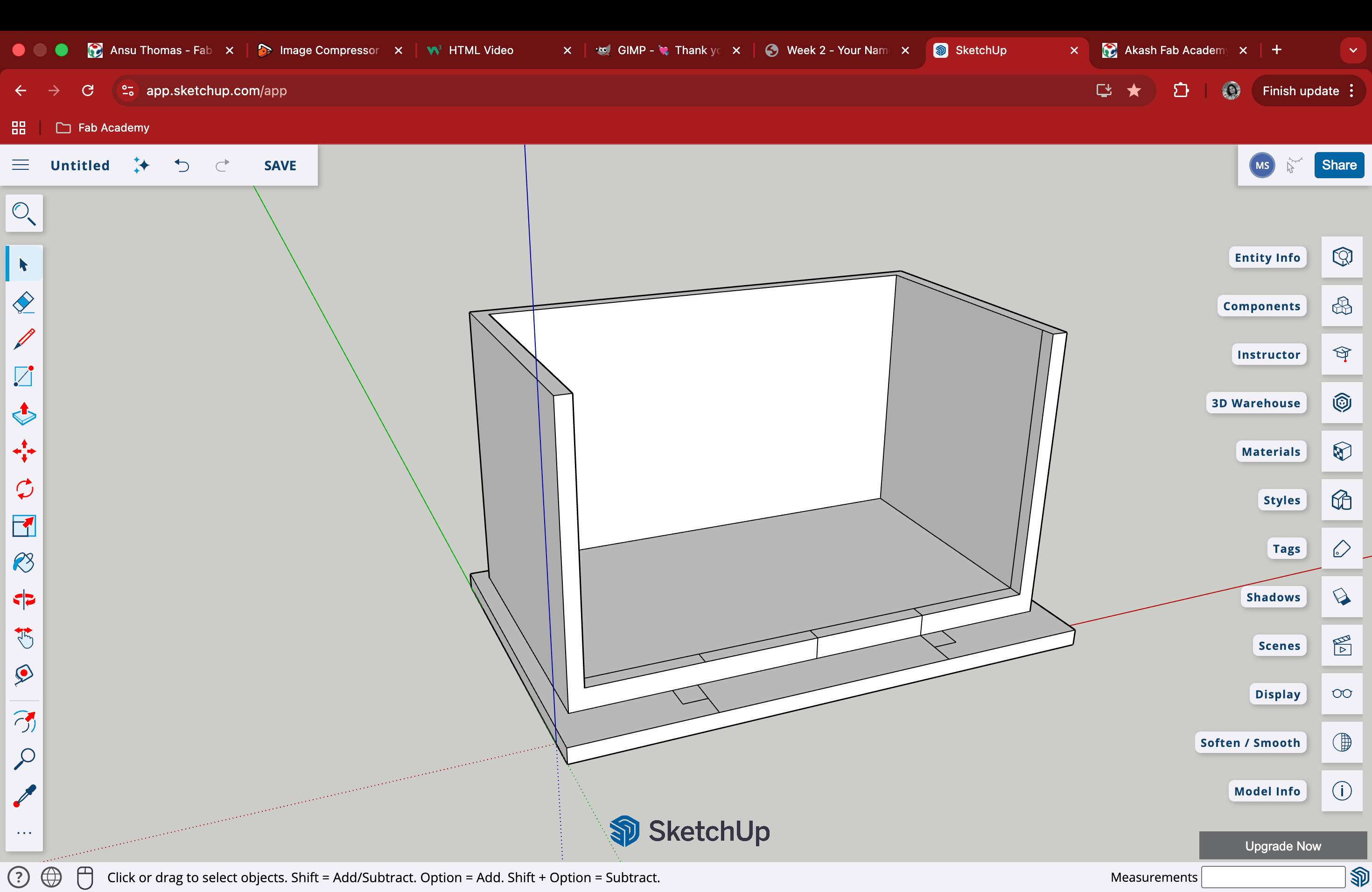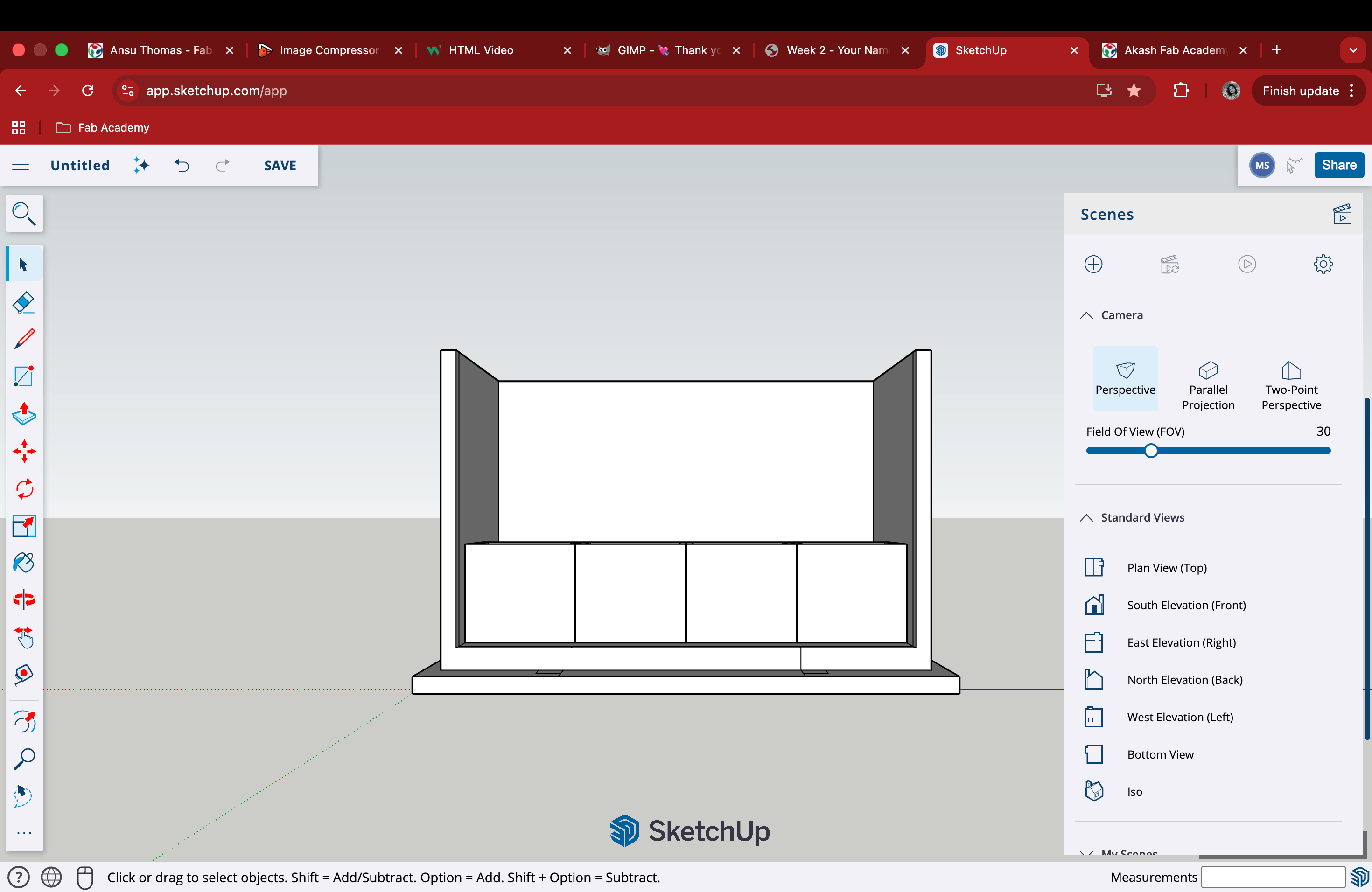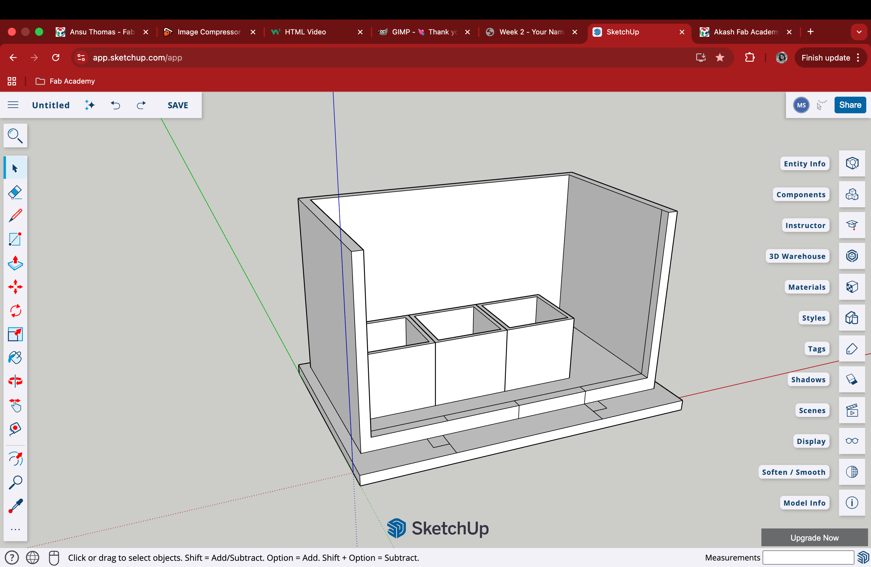 Since it was my first time using Fusion 360, I couldn’t figure out the basic functions or keep up with the pace of working within a day, which eventually became frustrating. Afterward, I decided to model my previous sketch using the free web version of SketchUp. For the time being, this is where I’m able to work faster, but in the coming weeks, I plan to try my hand at Fusion again for better results.