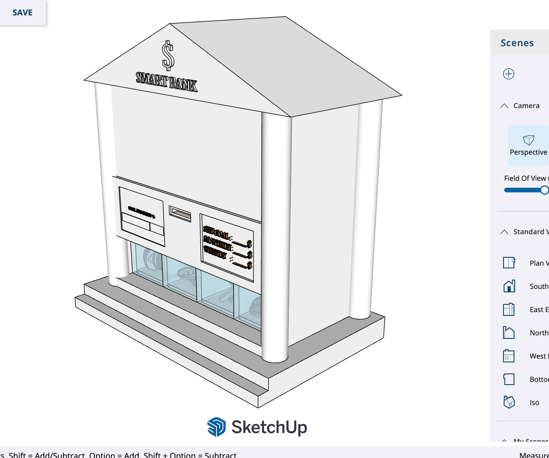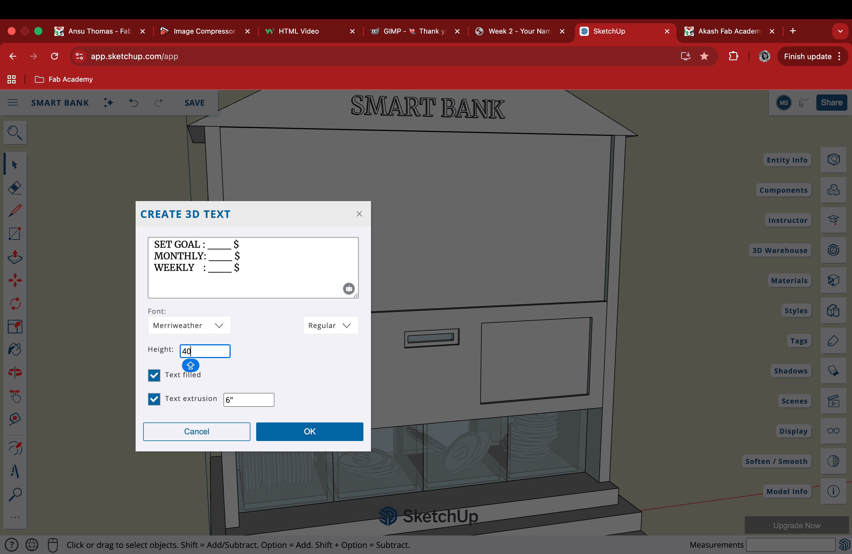 I created a simple triangular roof and extruded it into a prism to cover the area, then added a wall above the container to close off the structure. Once the façade of my little smart bank was ready, I went ahead and added small details using the 3D Text Maker tool. I tried different font options and played with size and scale to get a sense of the right placement. I also made a large dollar sign to place on top of the wall, just below the roof.