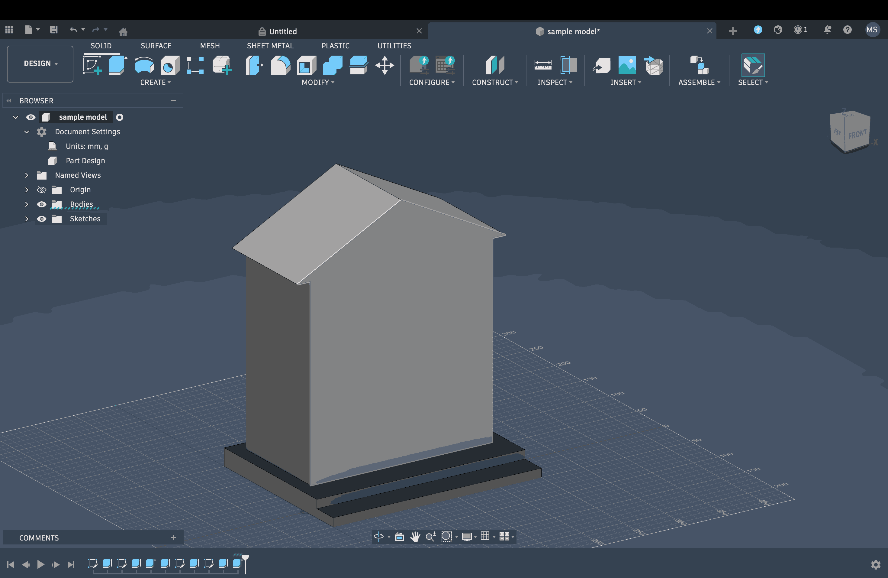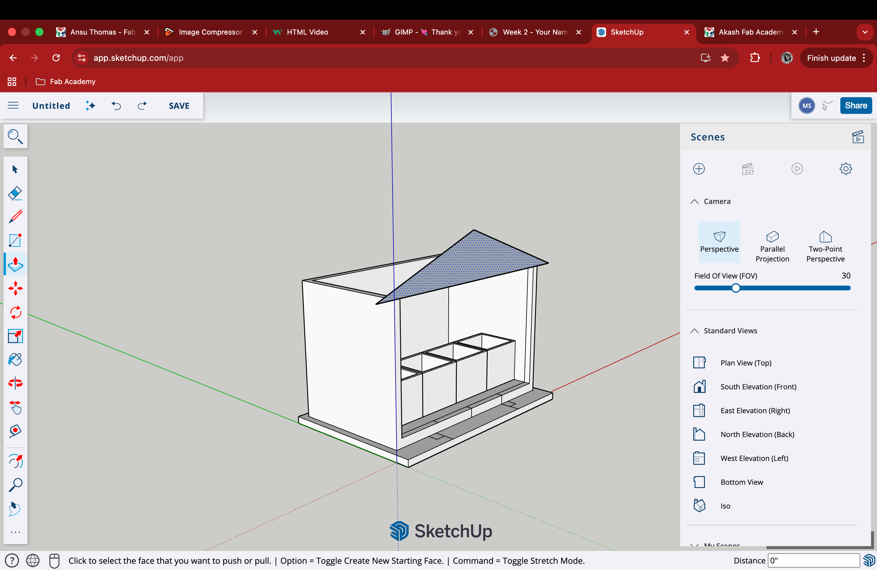 These steps were repeated to create the basic structure. Next, I needed to work on the roof. For this, I selected the Front view, as my plan was to draw a triangle in this view and then extrude it into a prism.