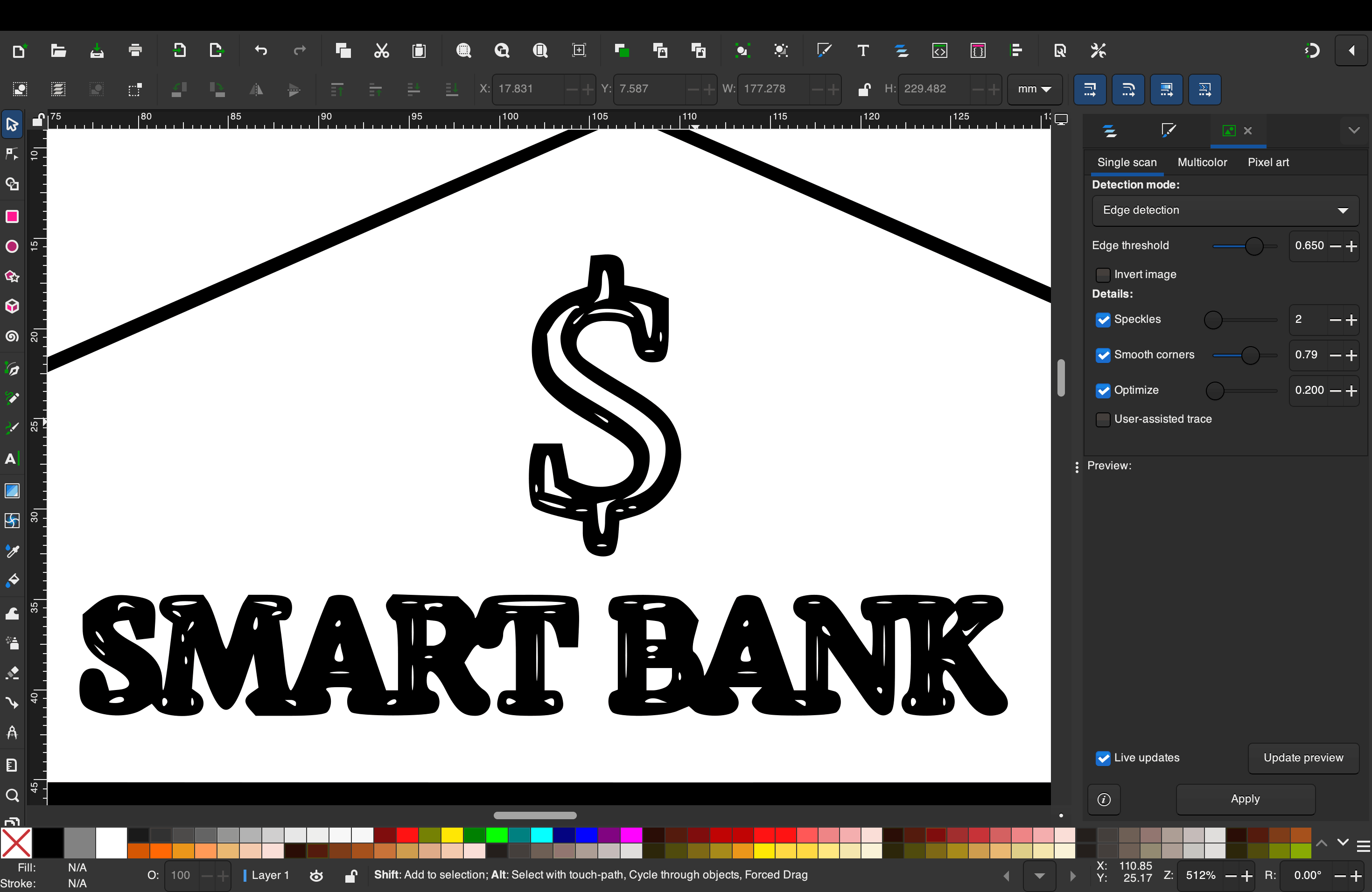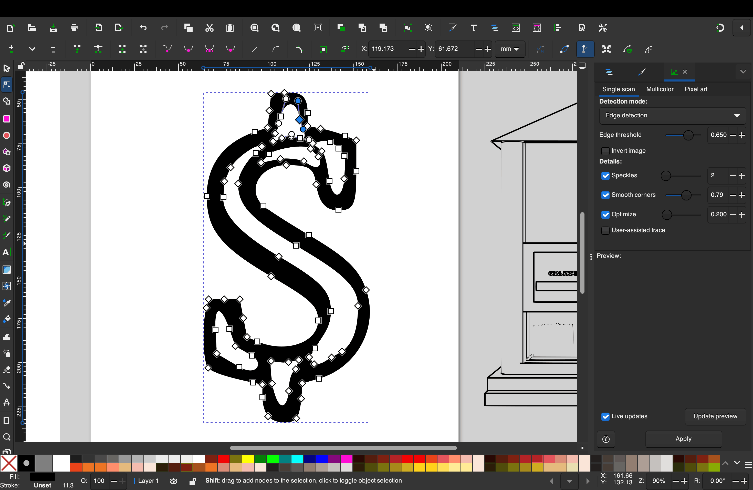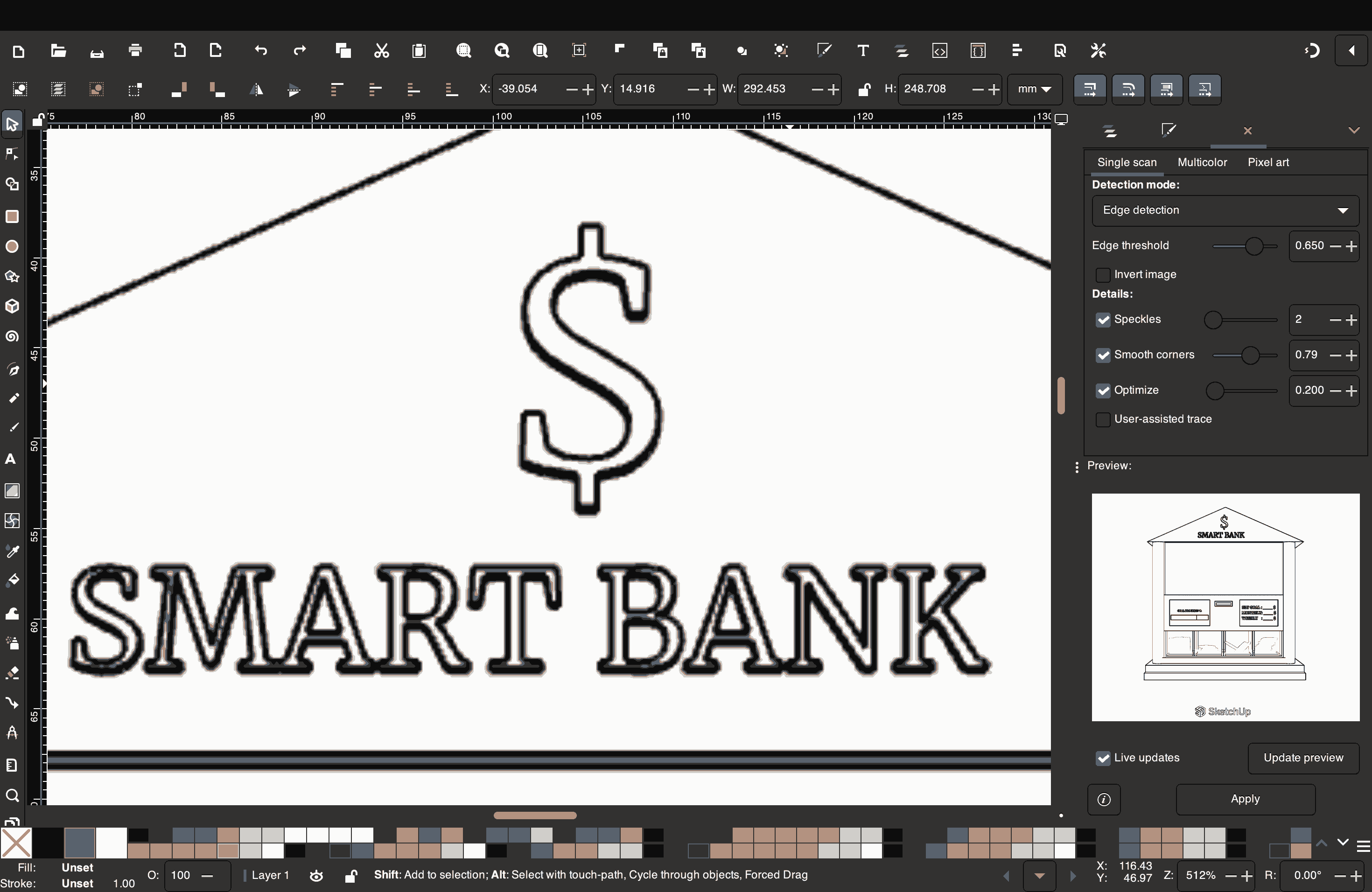 I used Inkscape and experimented with bitmap tracing using one of the screenshots from the SketchUp model I made. The dollar sign I created earlier was now a PNG raster image, and I applied the bitmap tracing function to convert it into a vector. I then manipulated the vector further to better suit my needs.
