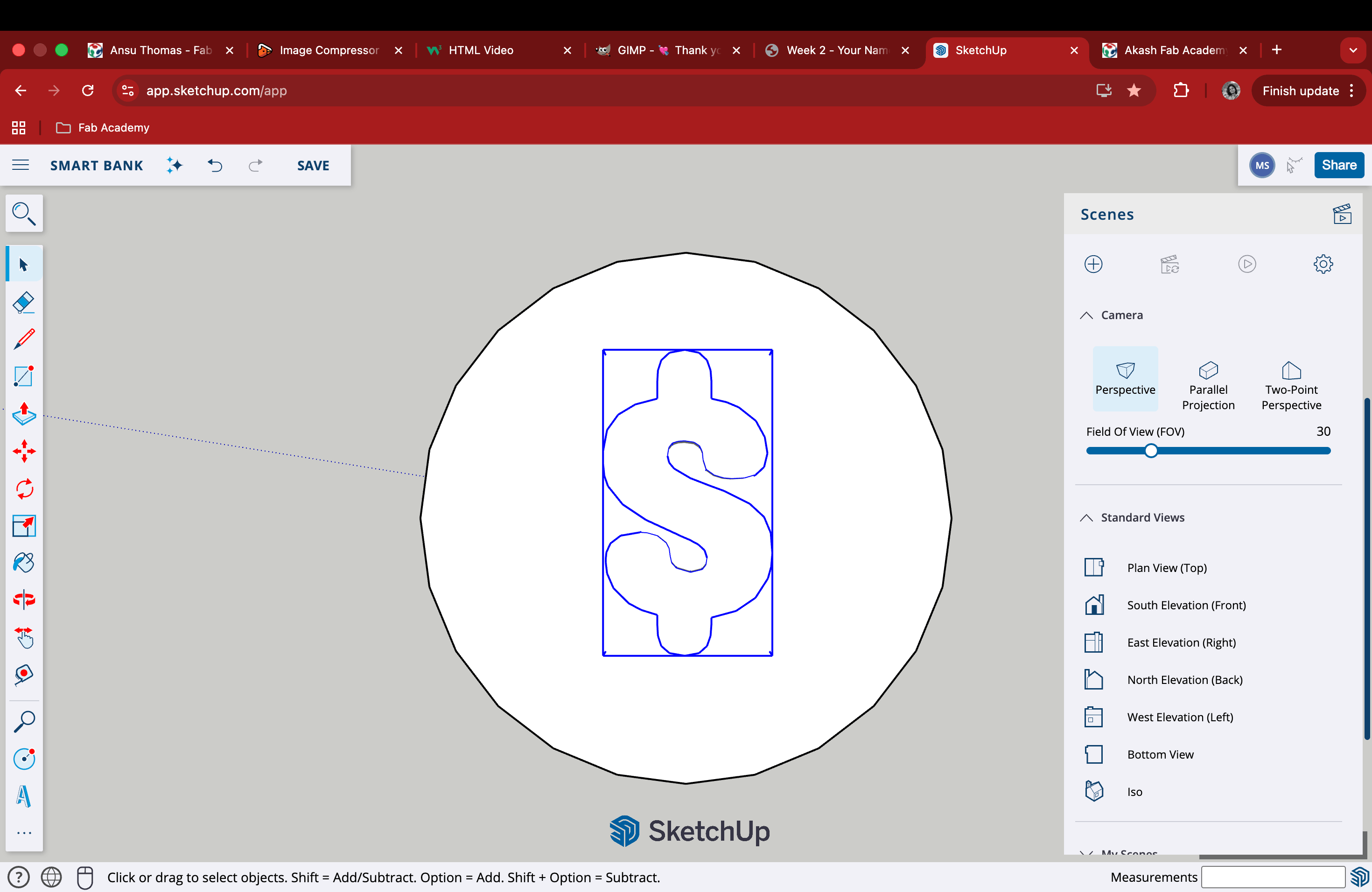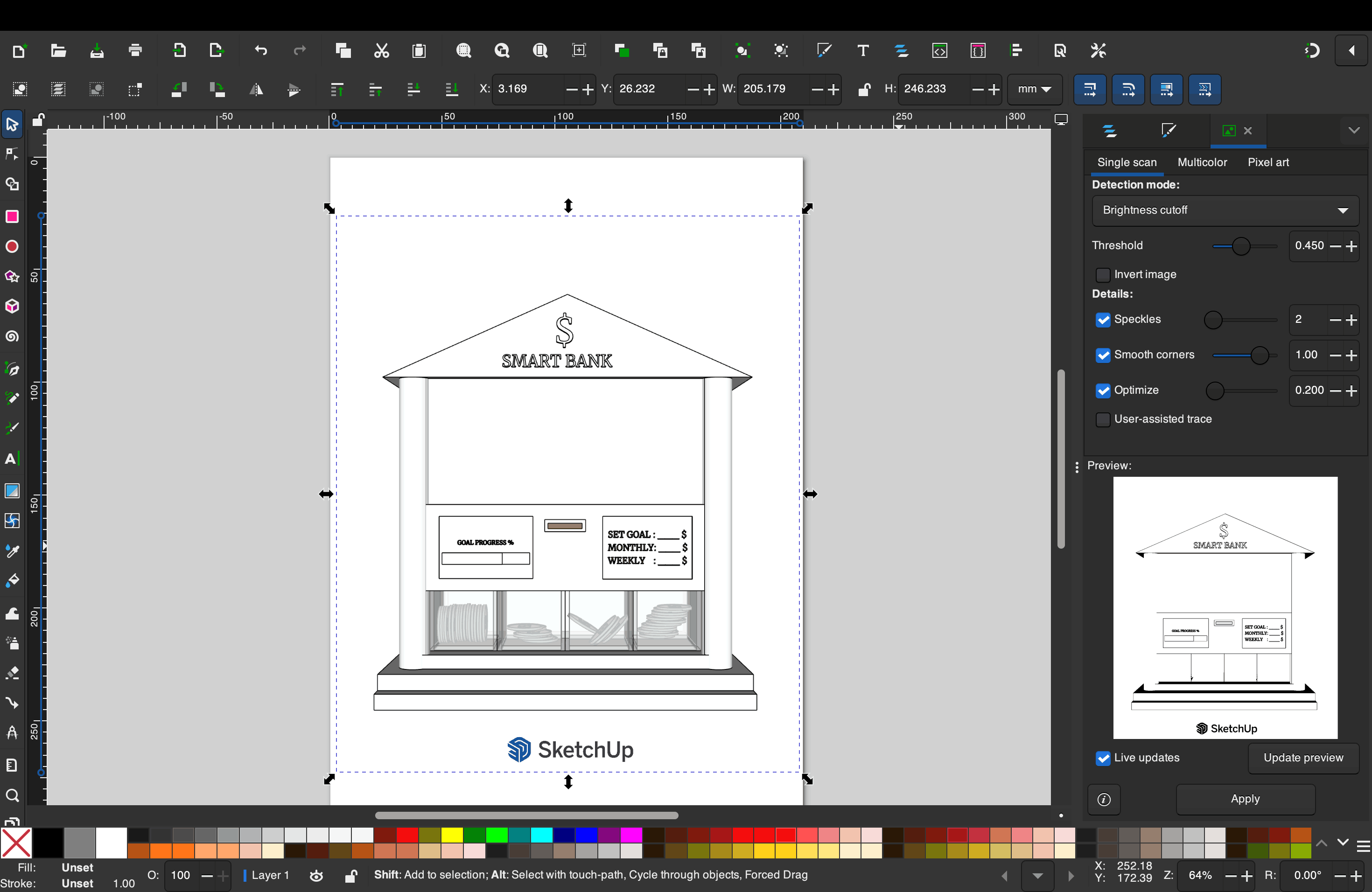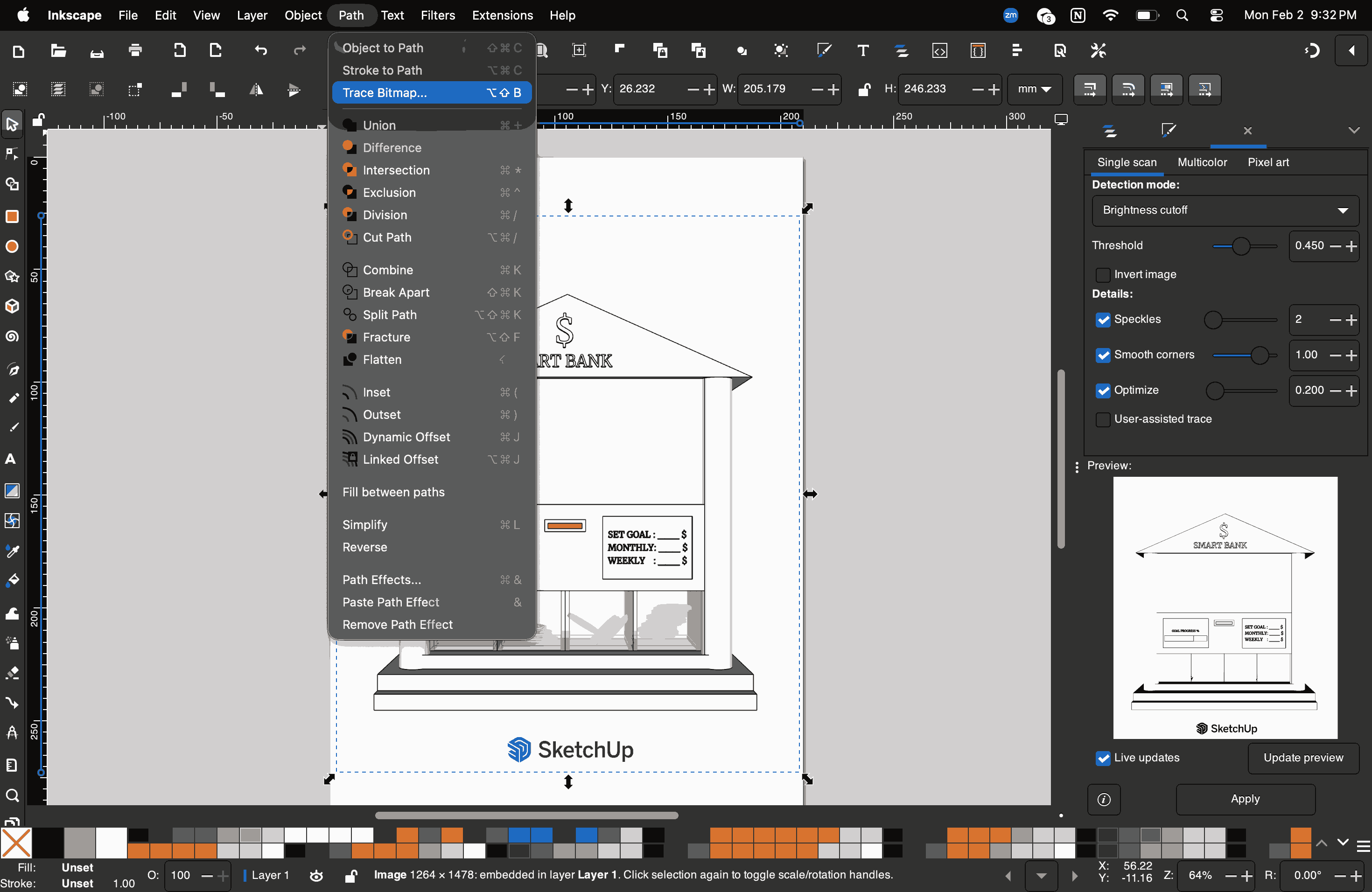 I used Inkscape and experimented with bitmap tracing using one of the screenshots from the SketchUp model I made. The dollar sign I created earlier was now a PNG raster image, and I applied the bitmap tracing function to convert it into a vector. I then manipulated the vector further to better suit my needs.