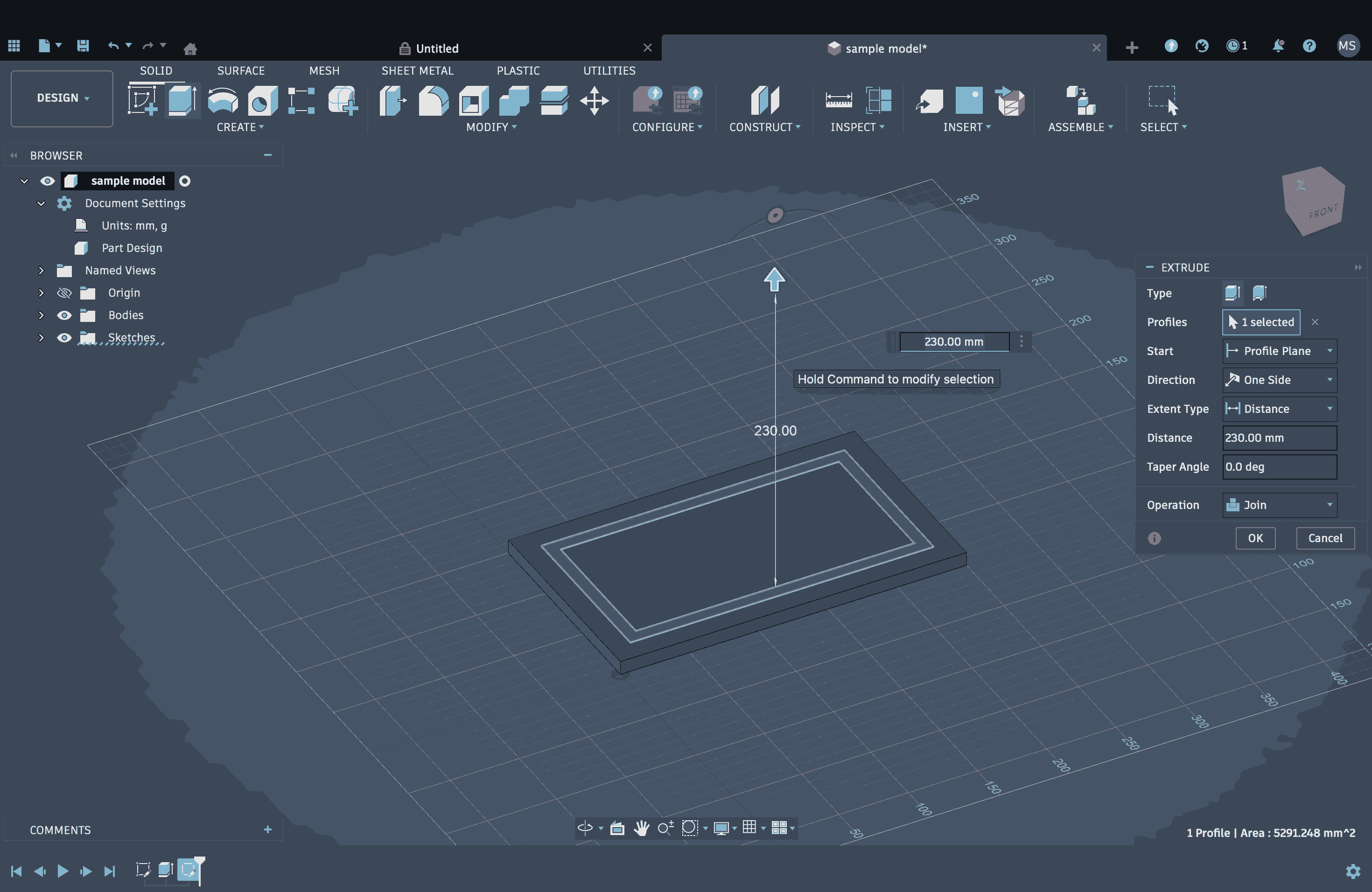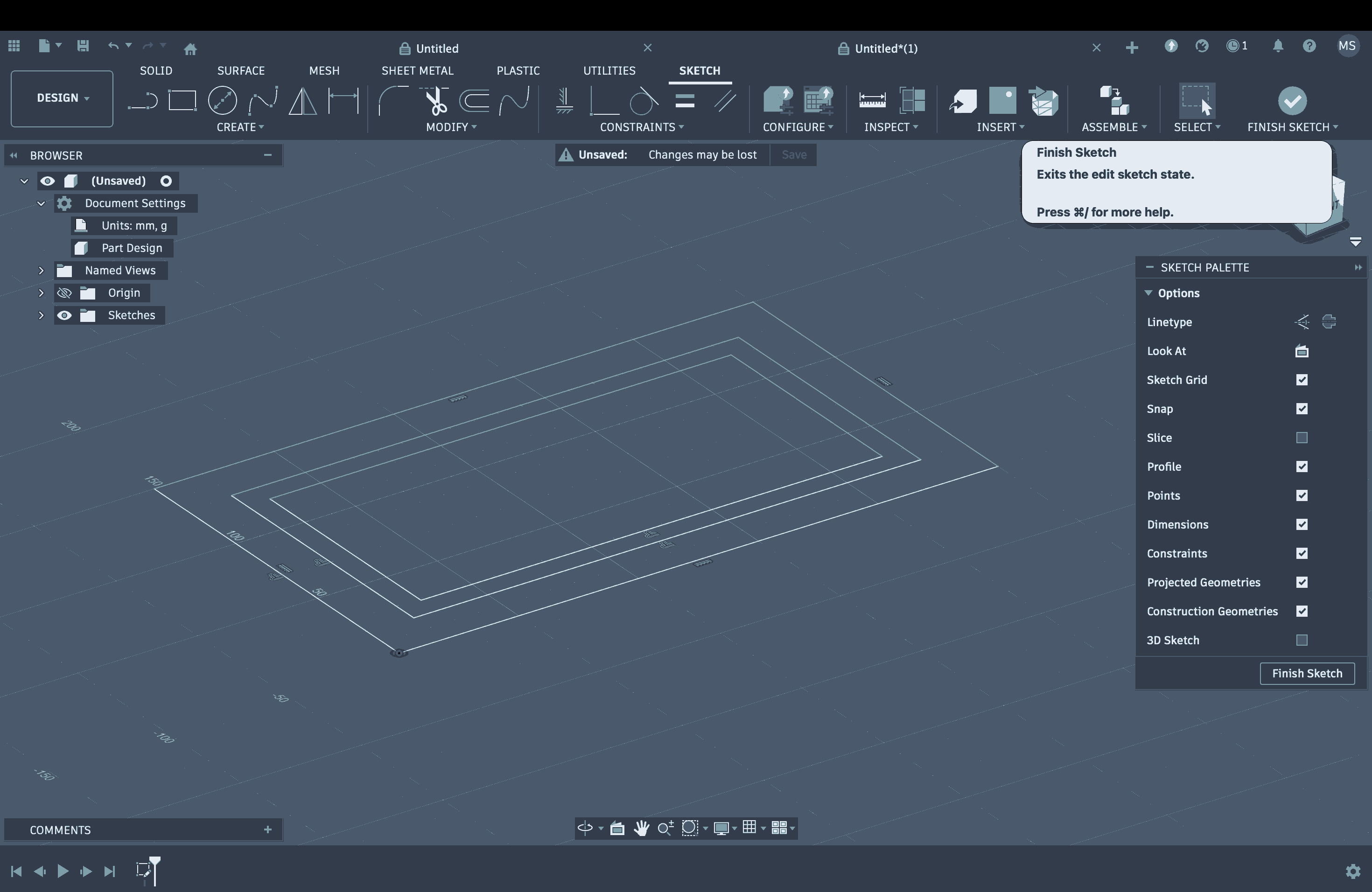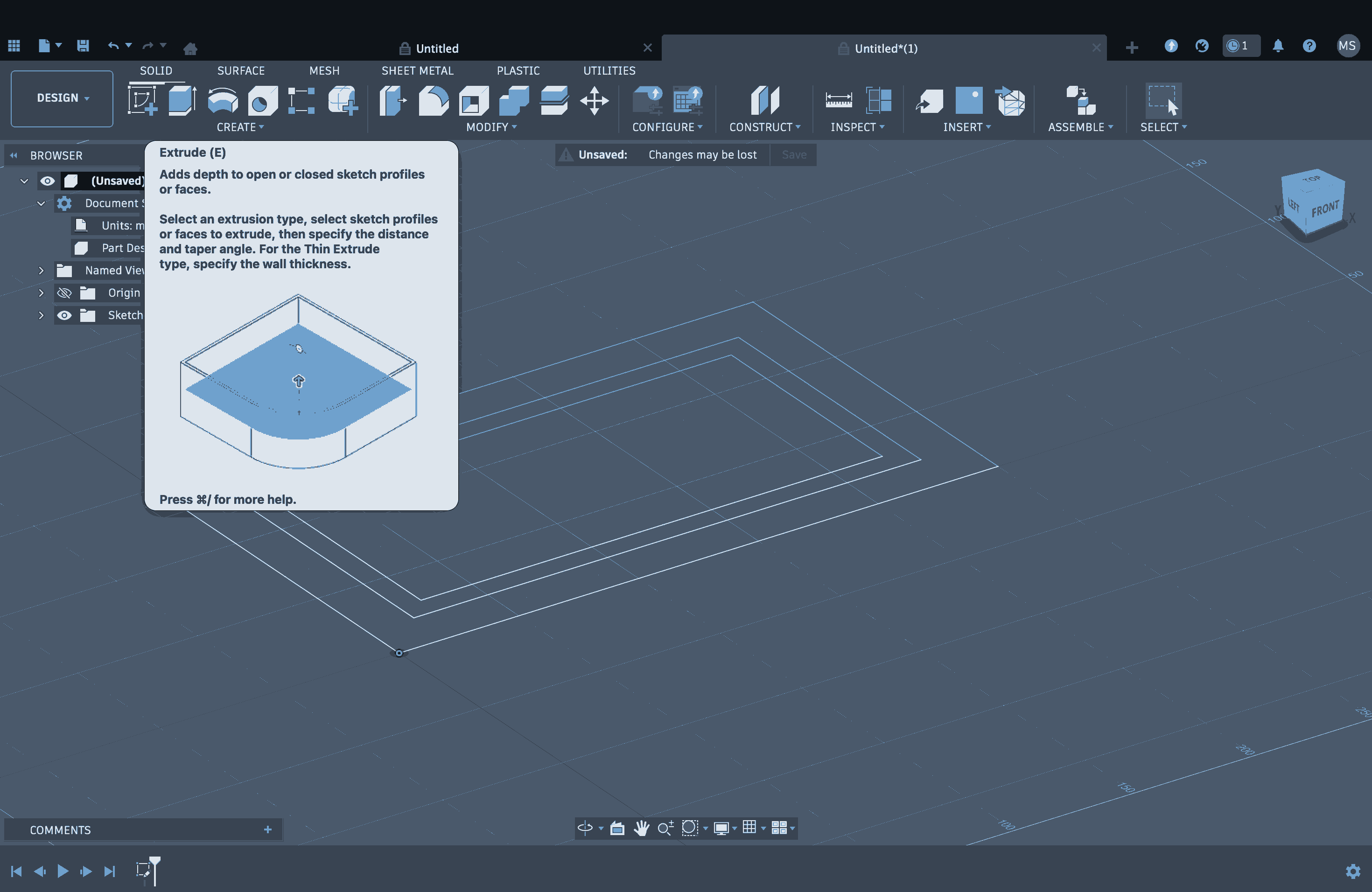 Fusion has various modes such as Design, Render, Animation, and Manufacturing. I worked in Design mode, which begins with creating a sketch, essentially basic 2D drafting. I started with a rectangle for the base of my model, and this is where it got slightly irritating. To extrude the rectangle, you first have to finish the sketch by clicking the tick mark in the top-right corner, and only then are you allowed to extrude it. But I got used to this fairly quickly.