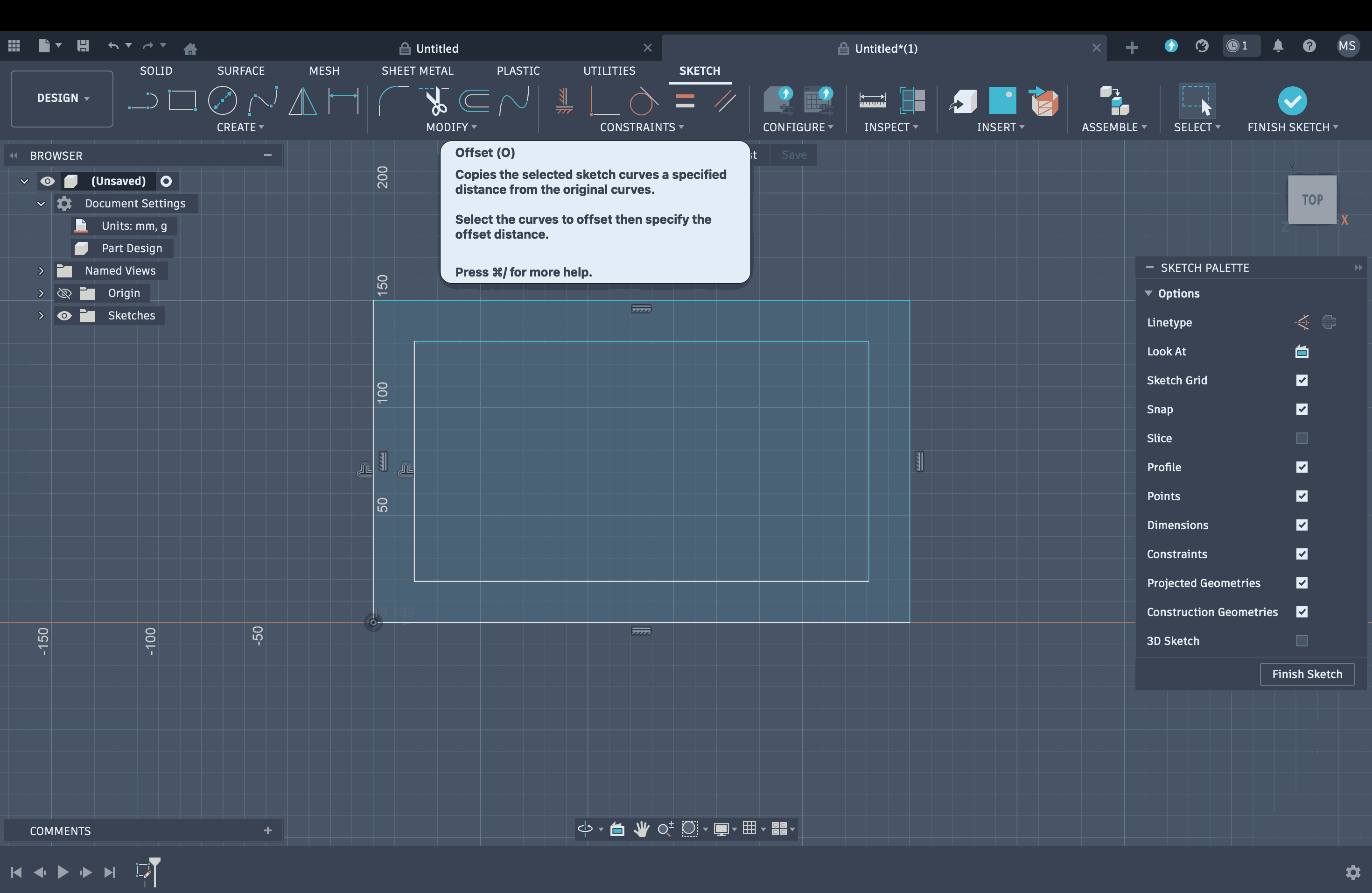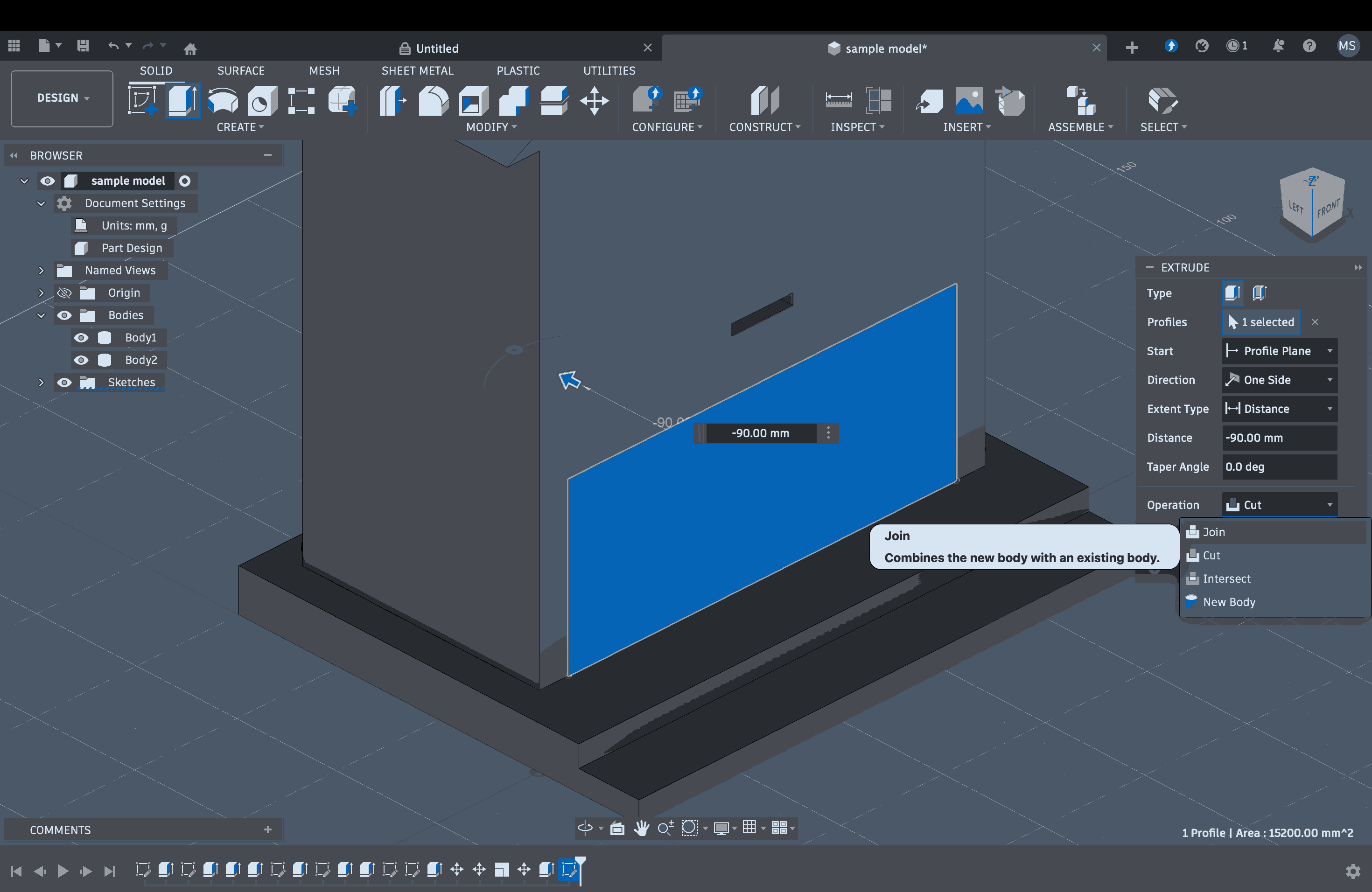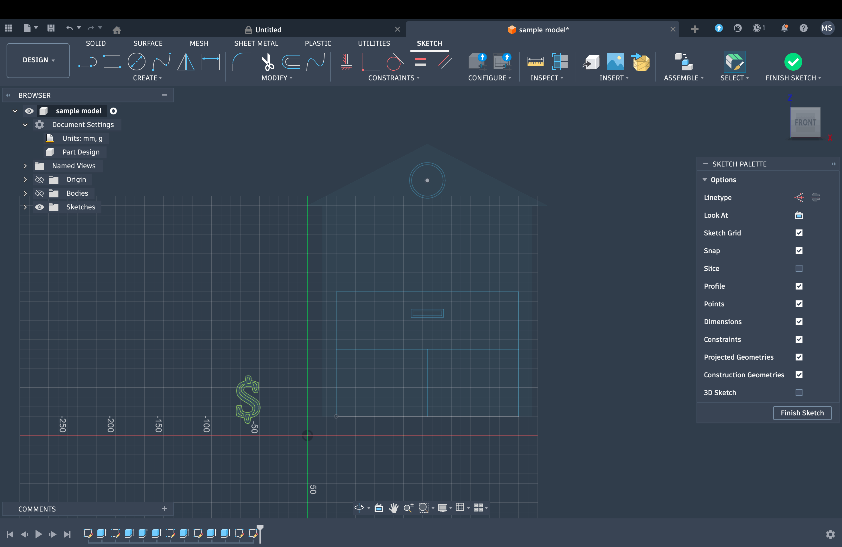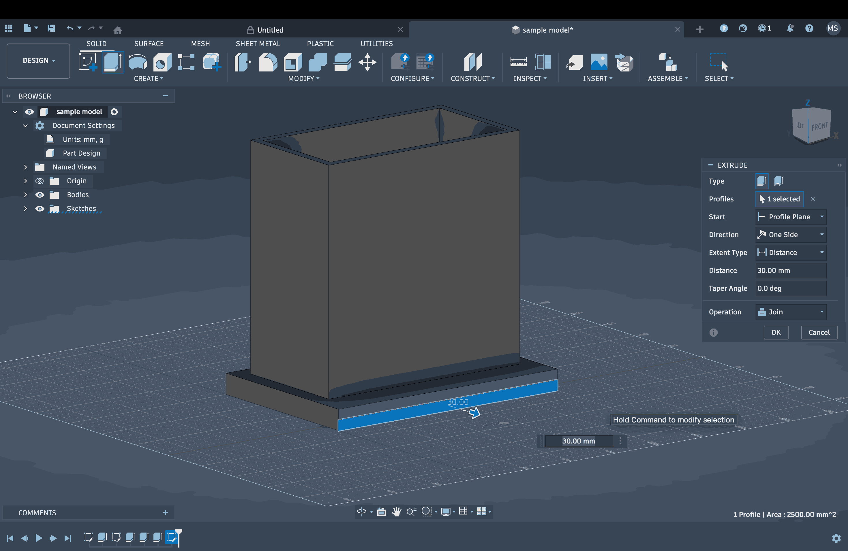 Fusion has various modes such as Design, Render, Animation, and Manufacturing. I worked in Design mode, which begins with creating a sketch, essentially basic 2D drafting. I started with a rectangle for the base of my model, and this is where it got slightly irritating. To extrude the rectangle, you first have to finish the sketch by clicking the tick mark in the top-right corner, and only then are you allowed to extrude it. But I got used to this fairly quickly.