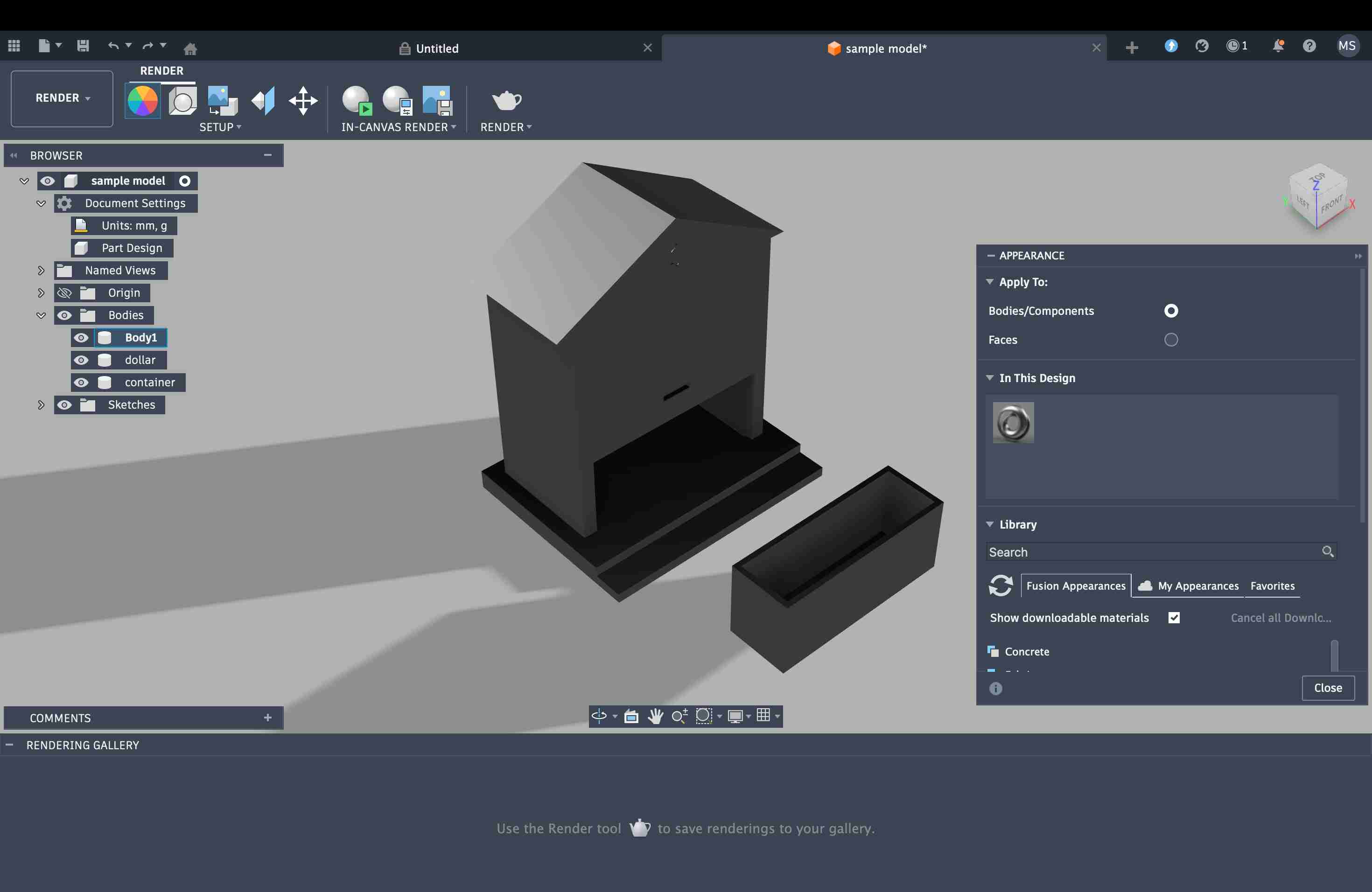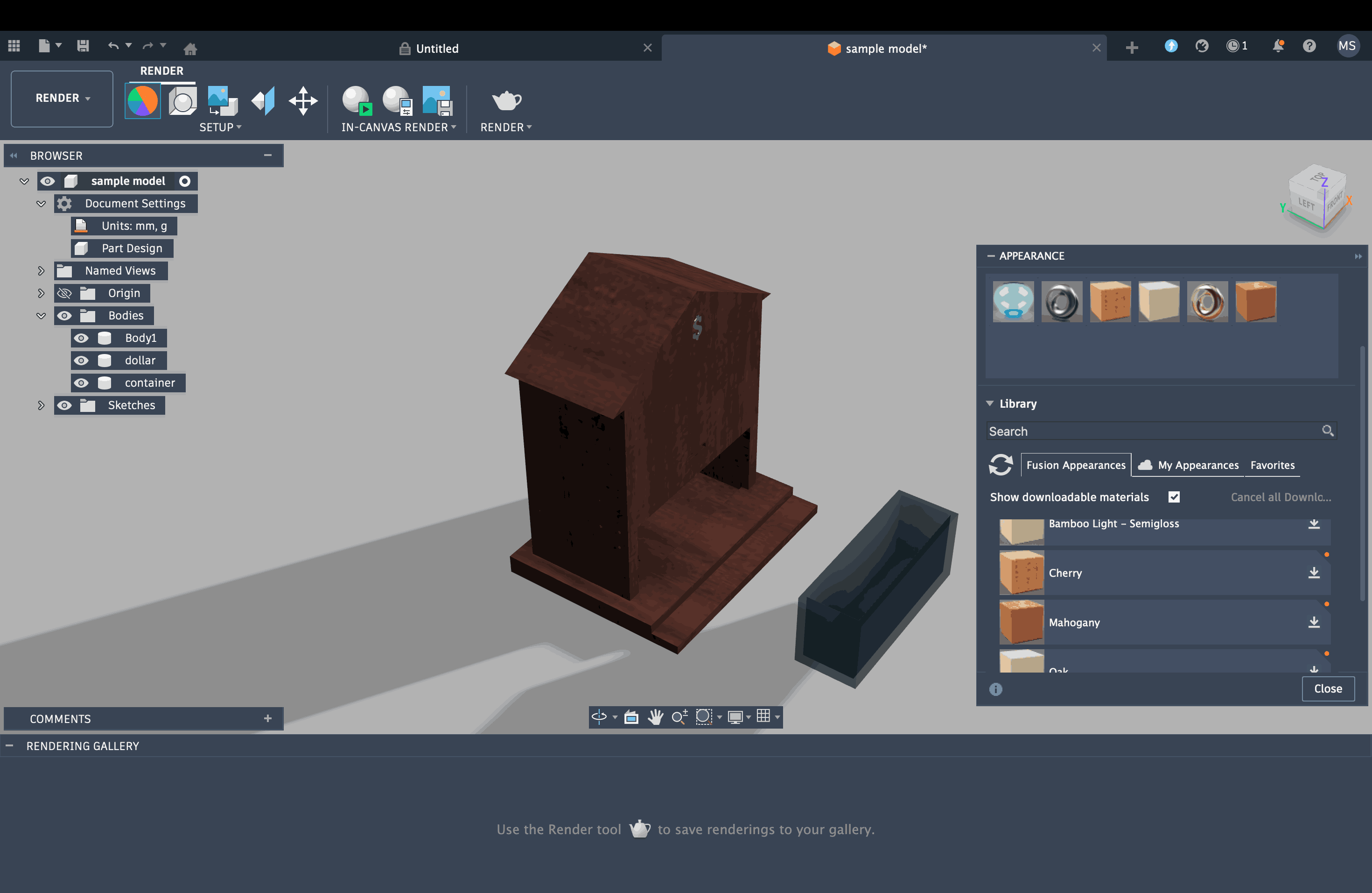 To apply materials, I switched to Render mode and selected Appearance. In this mode, materials can be applied and previewed, and the environment can also be changed. For example, I tried using soft light. I applied glass material to the transparent tray and a wood finish to the rest of the model, while keeping the dollar sign in a metallic copper finish.