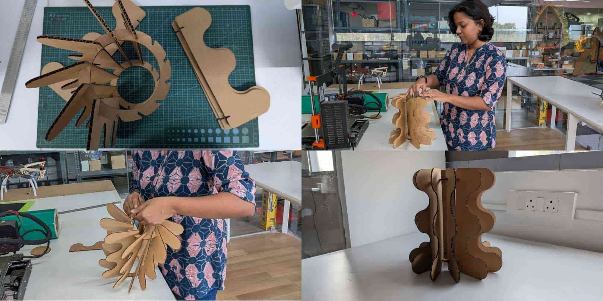 To obtain the kerf value, we laser-cut a 40 × 40 mm square with a 20 × 20 mm inner cutout from cardboard. After cutting, we measured the inner dimension of the larger square and the outer dimension of the smaller square. The difference between these two measured values gave the total kerf, which was then divided by two to calculate the kerf for the material. We also experimented with engraving settings, observing that lower power produced lighter surface marks, while higher power and slower speeds resulted in deeper engravings. This helped in understanding how to balance power and speed to achieve desired engraving effects on different materials. These tests were then repeated on birch wood and acrylic sheet as well. The detailed documentation can be viewed on the group's page.