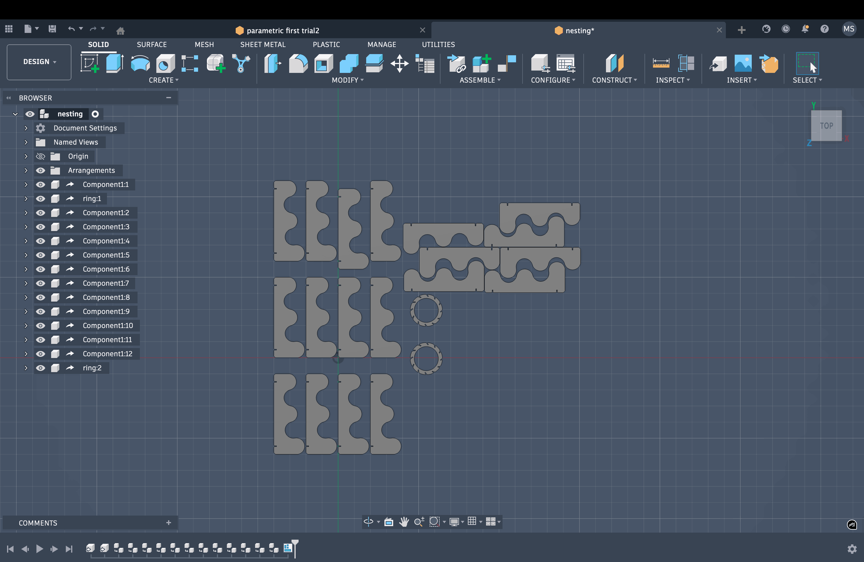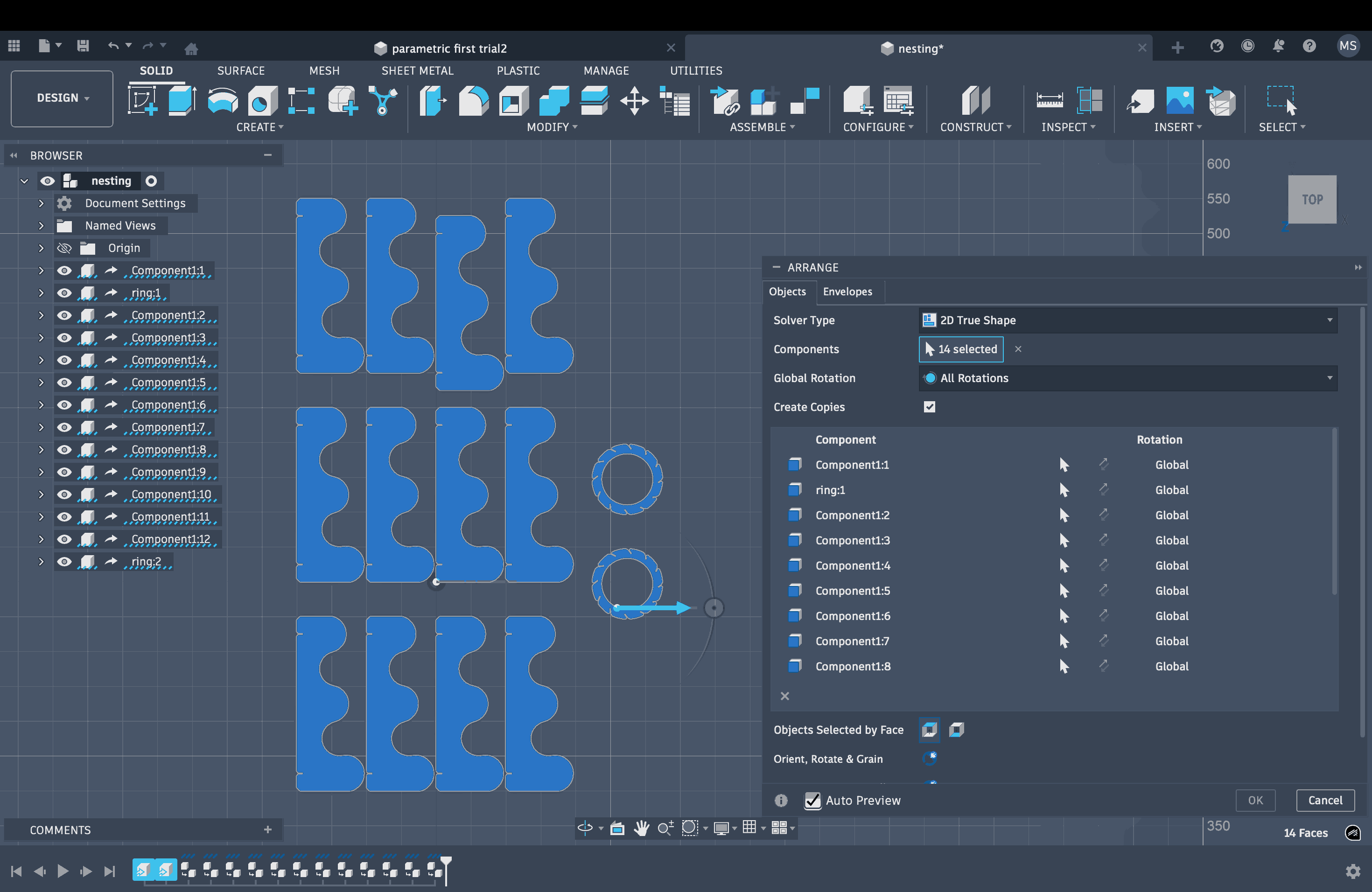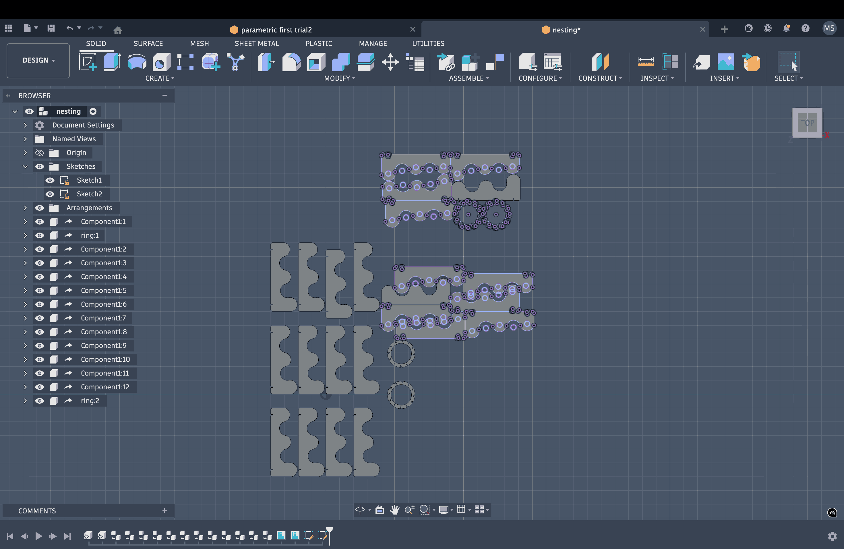 Now because I had 12 copies of my curved components and 2 copies of my circular component, not everything will fit it on one cardboard, so I repeat the steps with the rest of my components and created another nesting. Once that was ready, I selected one of the component, created a new sketch and projected the rest of the components, exported the sketch as dxf file. Repeated this with then other layout too.