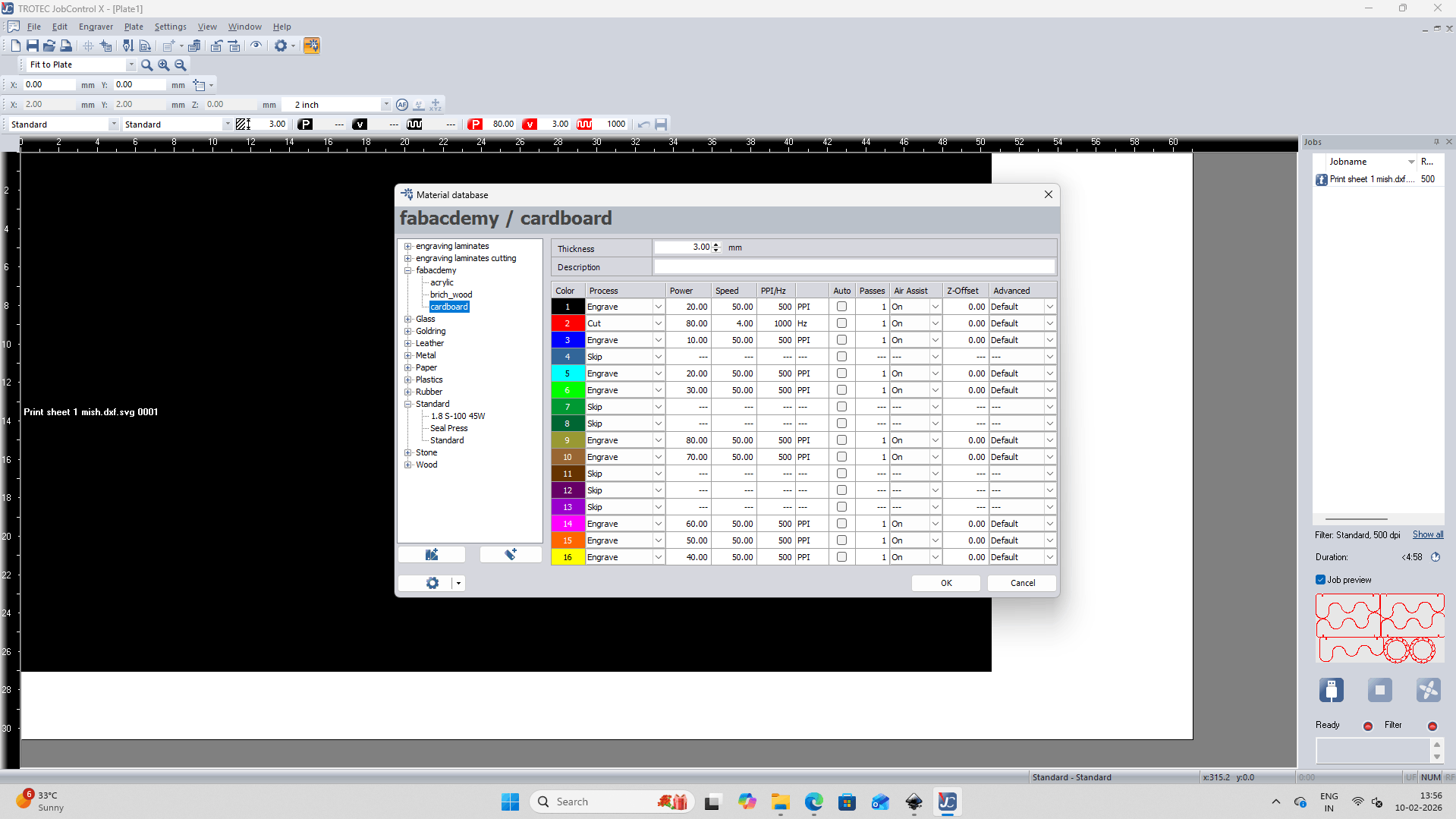 We had already set up the values for cardboard laser cutting when we did our group project.
