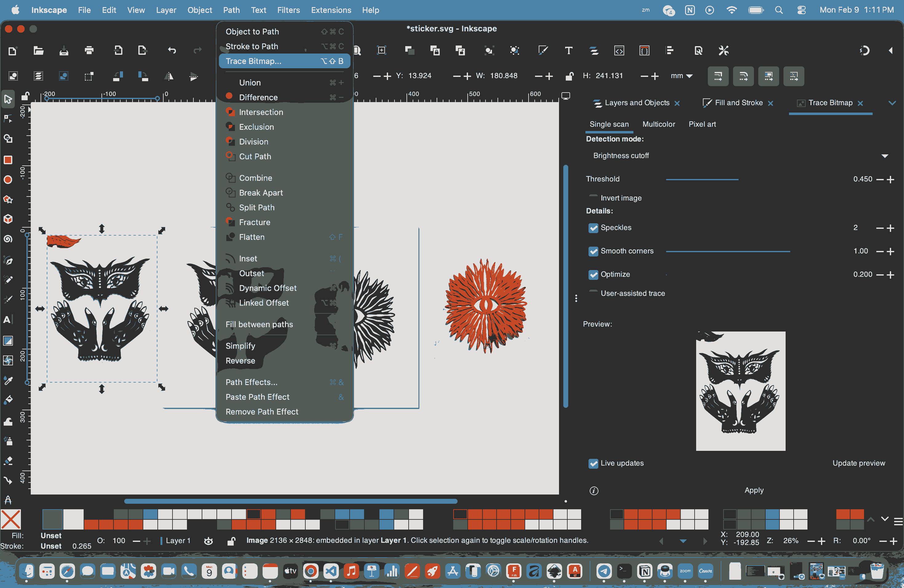 To do the assignment, I first imported the original image into Inkscape and used bitmap tracing to obtain an SVG file. I made sure the stroke was kept blank and the fill was turned on. These steps were repeated for the other images as well.