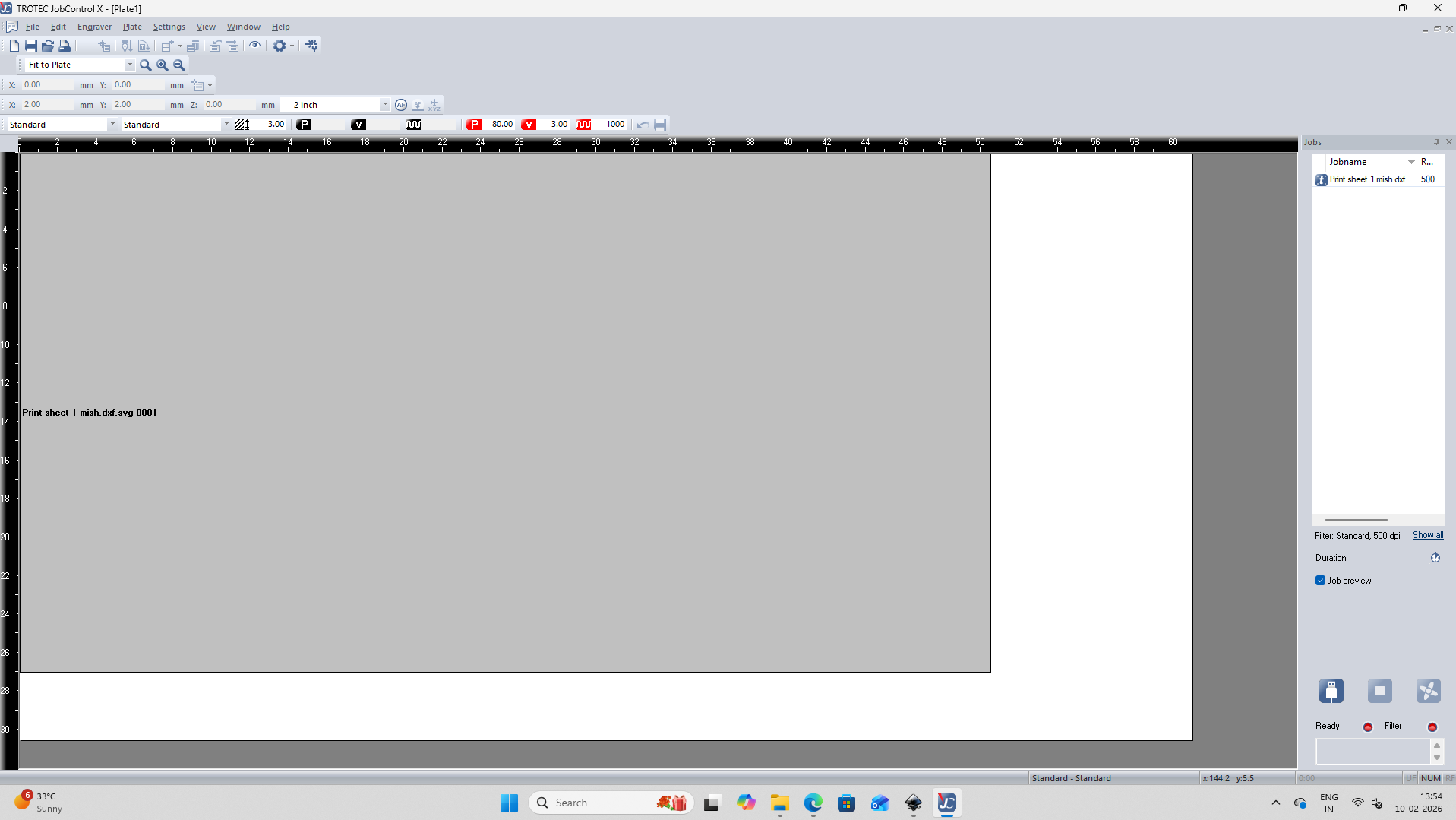 Using the Send Anywhere web application, I sent the SVG file to the computer connected to the laser cutter, where it was received and downloaded. The file was then opened in Inkscape and sent to print, which opened it in Trotec Job Control. At this stage, the following parameters were set for cardboard material: 80 power, 3 speed, 100 Hz/PPI, and Air ON. A pop-up dialog box then appears to confirm that the exhaust is on. Once approved, the play button can be clicked to begin the laser cutting process