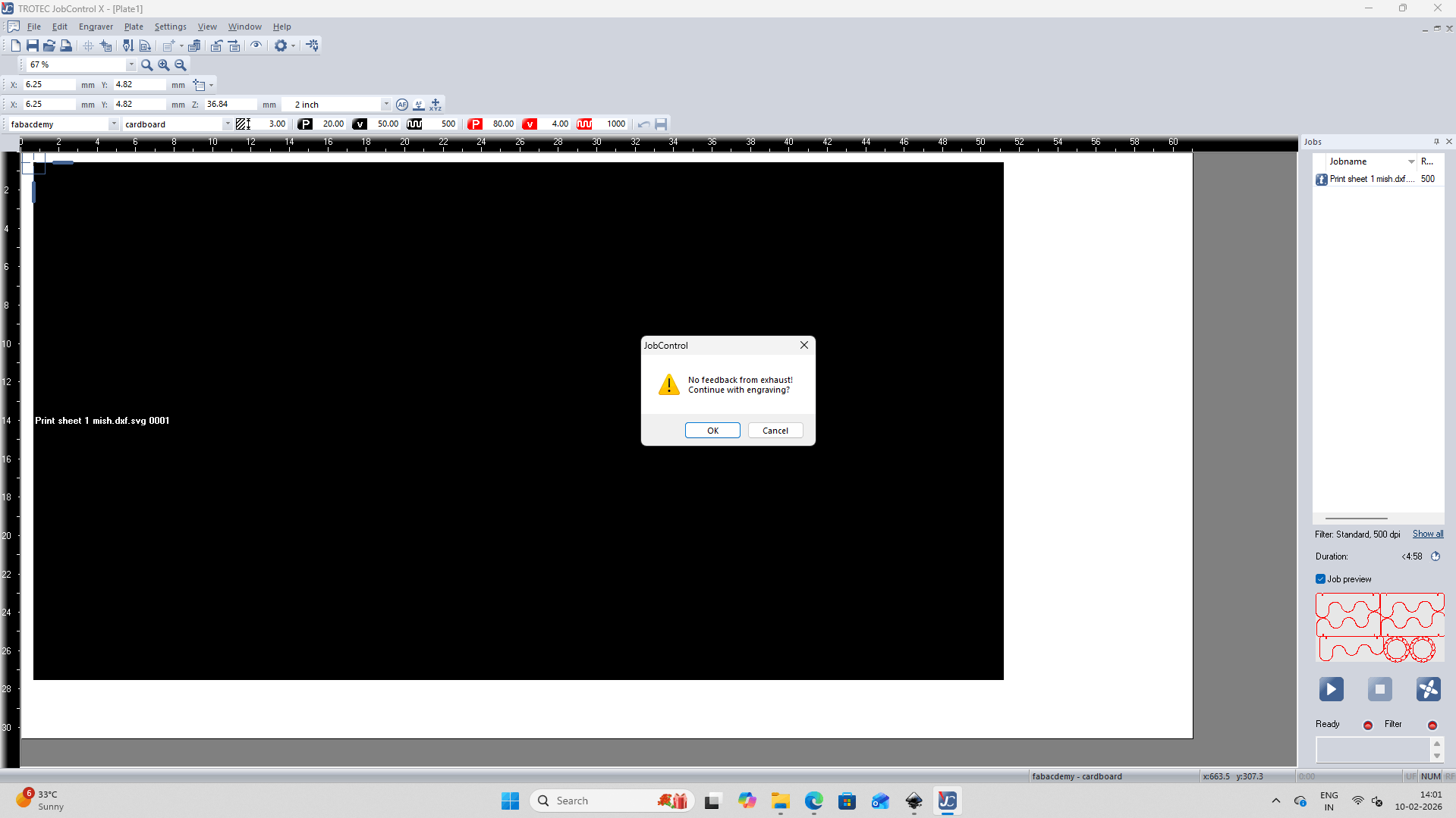 Once the specifications are set and we press the play button to start cutting, a pop-up appears asking whether the exhaust is turned on.