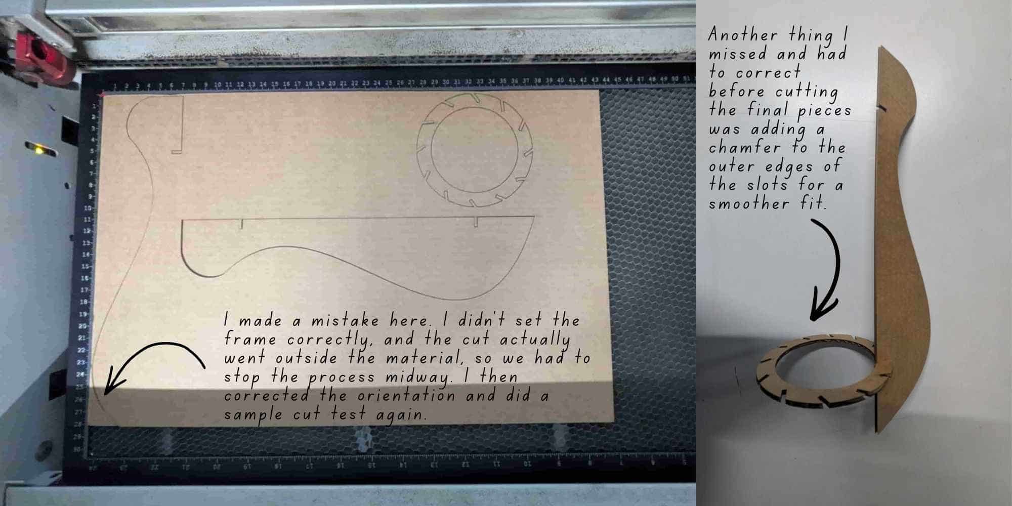 Now that I had my test piece ready, I moved on to making a few corrections. I added chamfers to the outer slot edges to ensure a smoother fit. I also wanted to try a different curve for the final piece. Last time, I used a spline to draw the curves, but it didn’t show up in the Inkscape file. Because of that, I had to open the file in Affinity, save it again as an SVG, and then open it in Inkscape to get it cut.
