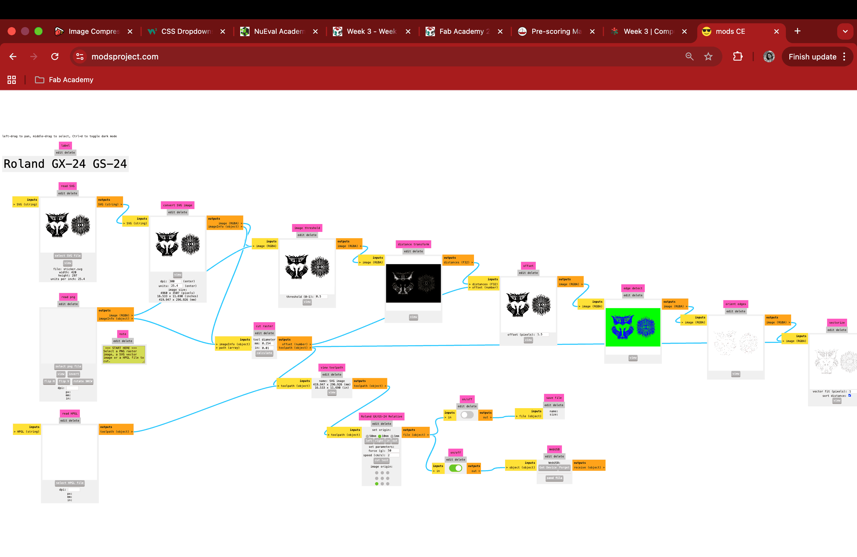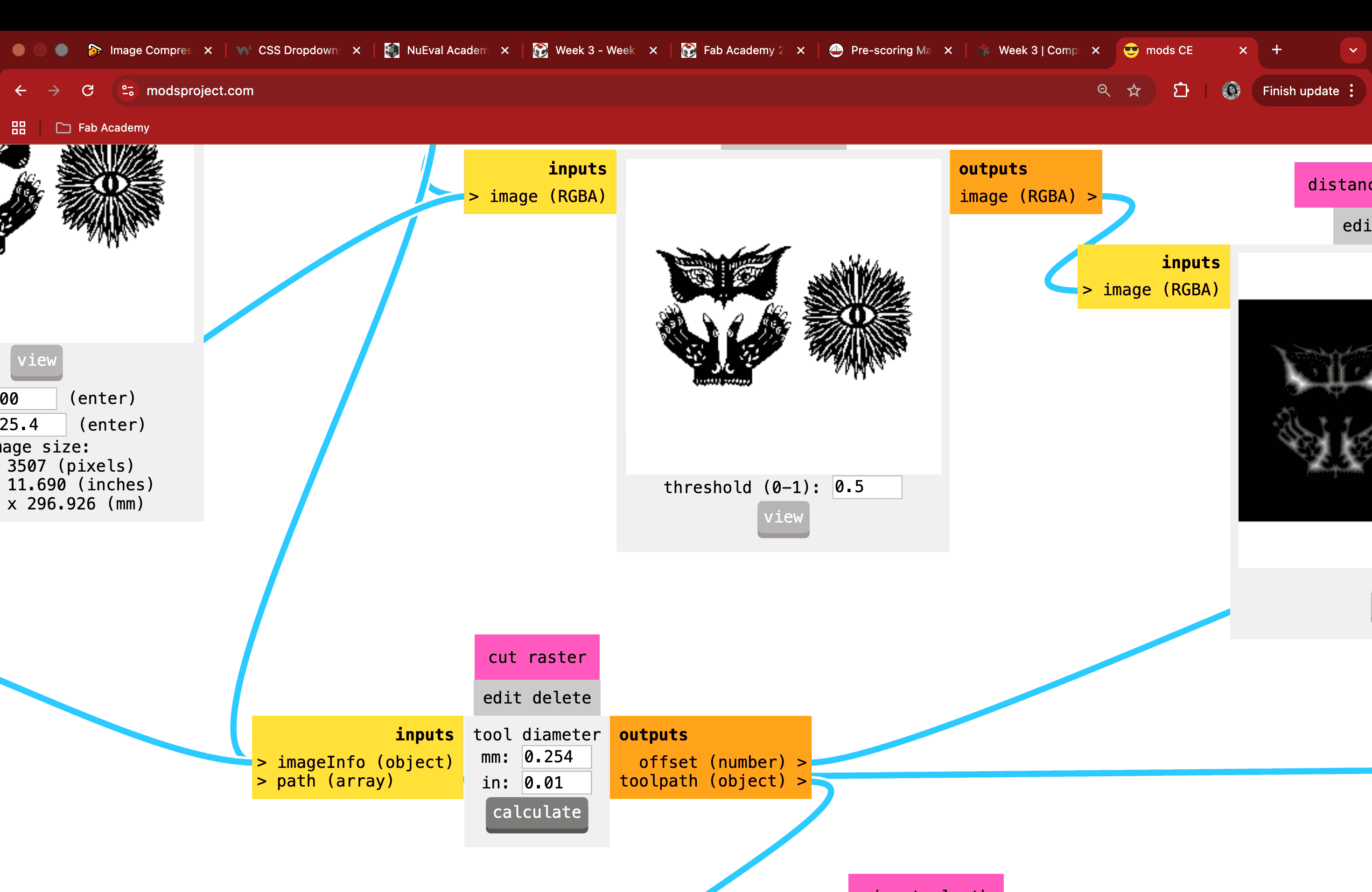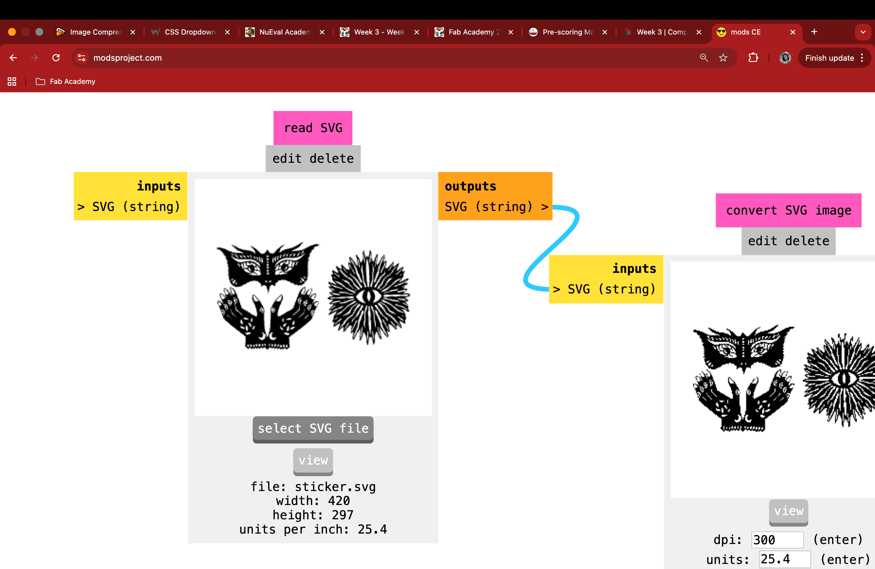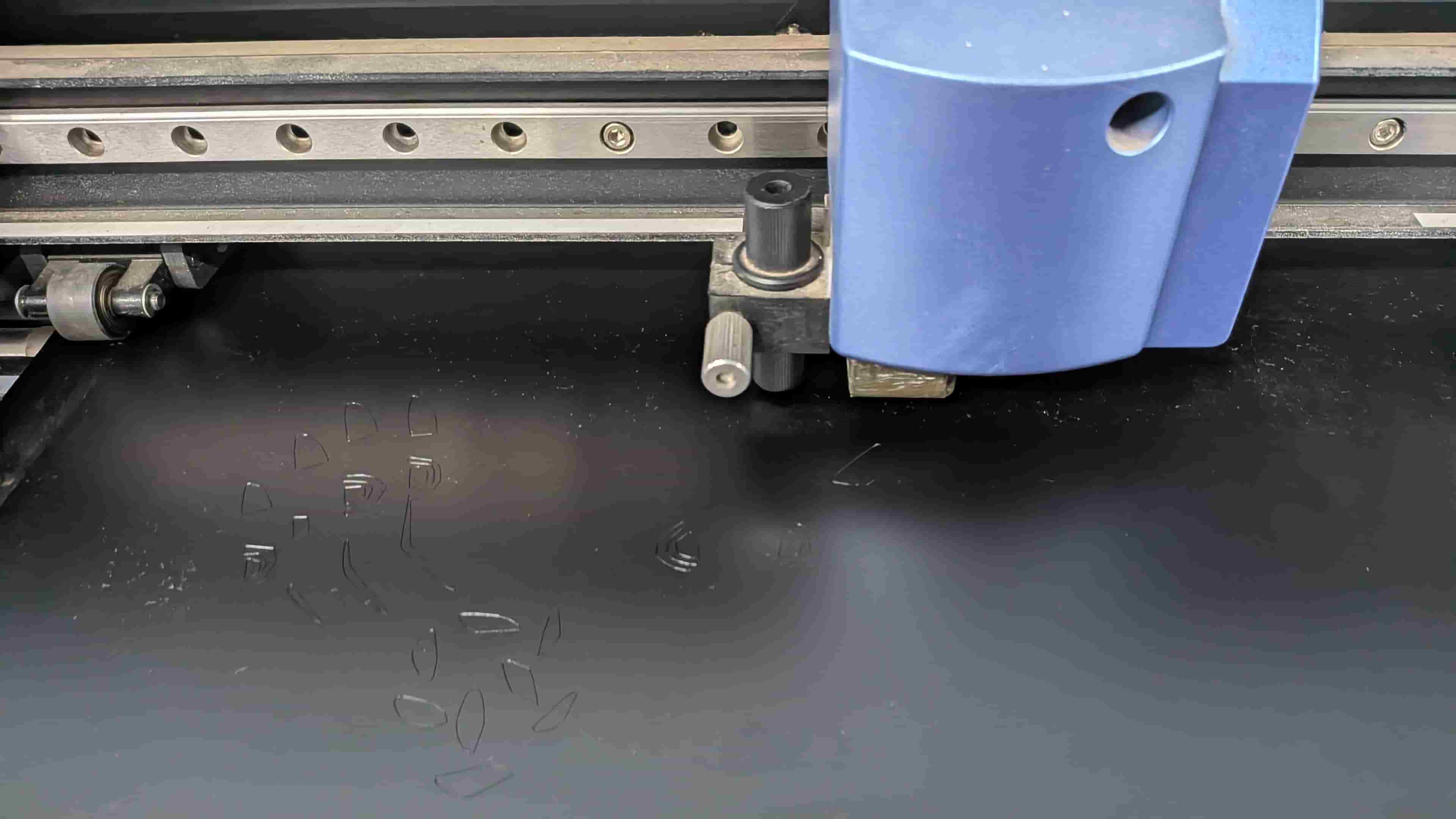 Once I had satisfactory SVG files, I opened them in Mods, calculated and previewed the toolpath, ensured there was enough clearance space within the border, and then sent the file to the vinyl cutter.