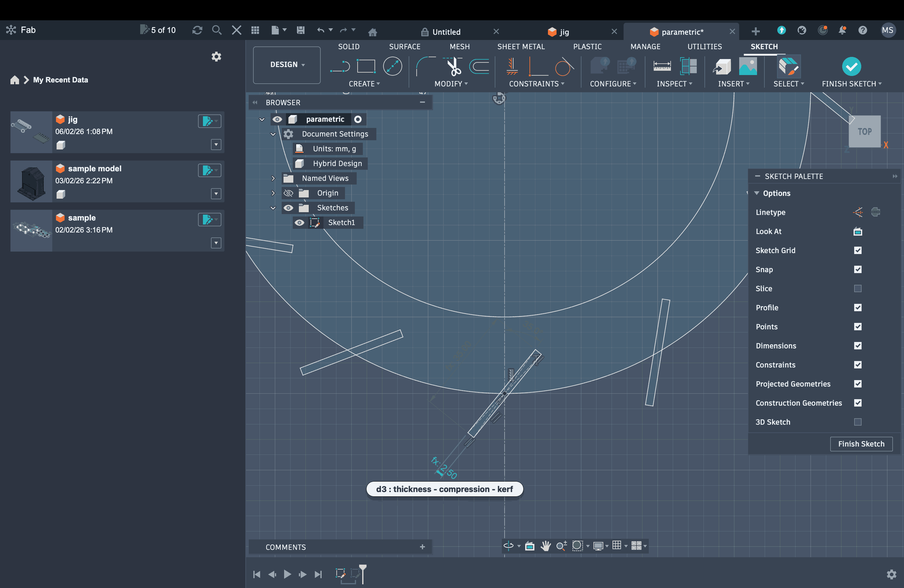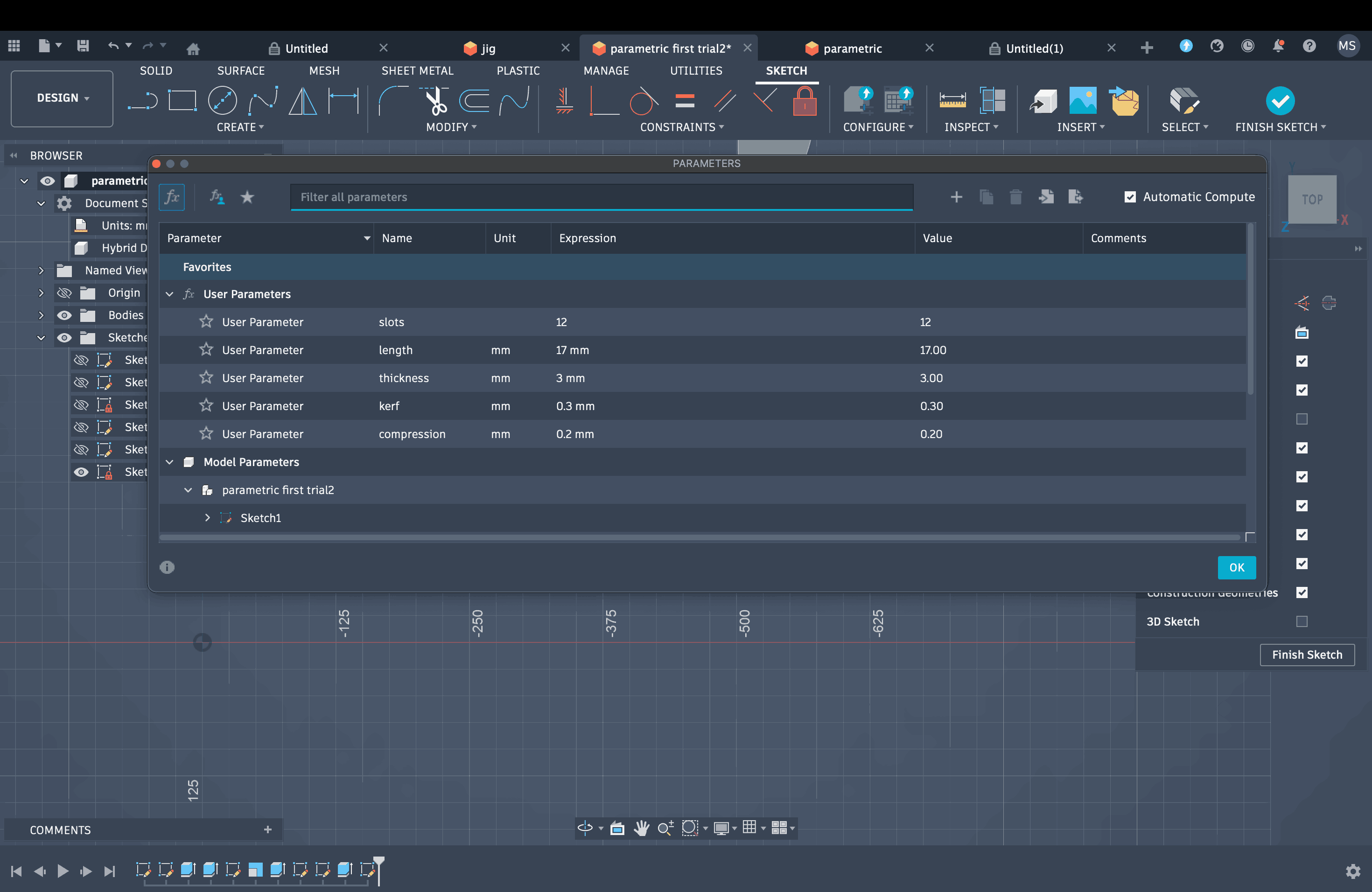 I am planning to make a press-fit lamp. Before drawing the slots, I added a few parameters: slot length set to 17 mm, material thickness to 3 mm, kerf to 0.3 mm, and compression to 0.2 mm.