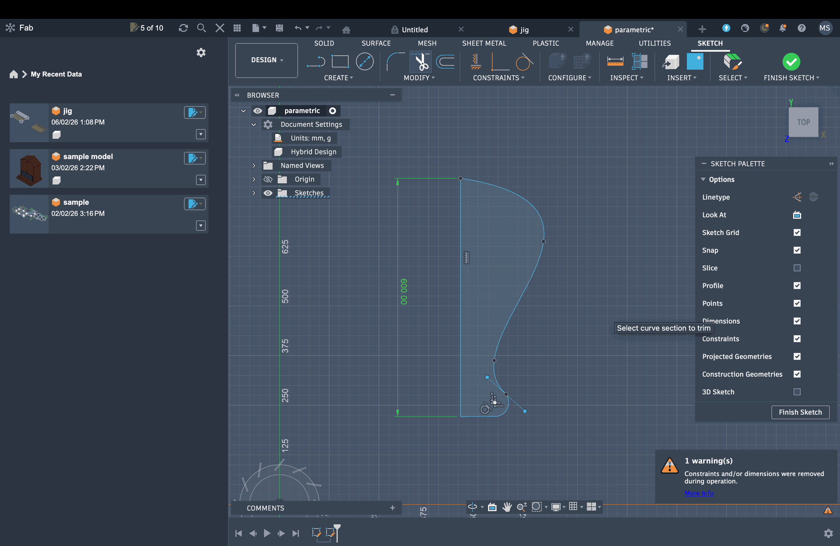 This time, I used arcs to create the curves, and all of them were visible when opened in Inkscape. Another thing I really had a hard time figuring out was how to properly set constraints for all these curves I had just created. I used the radius as a parameter for the arcs and applied dimensional constraints from the origin to the center of each arc. I also added equal constraints between the arcs and a perpendicular constraint between the base and the longest edge. I am not entirely sure how many of these constraints were actually required. There might have been a simpler or more efficient way to achieve the same result with fewer steps and less hassle. But I kept adding constraints and refining the sketch until the final drawing turned fully white and stopped moving, which meant it was fully constrained. The same parameters were applied since I was working on the same Fusion file.