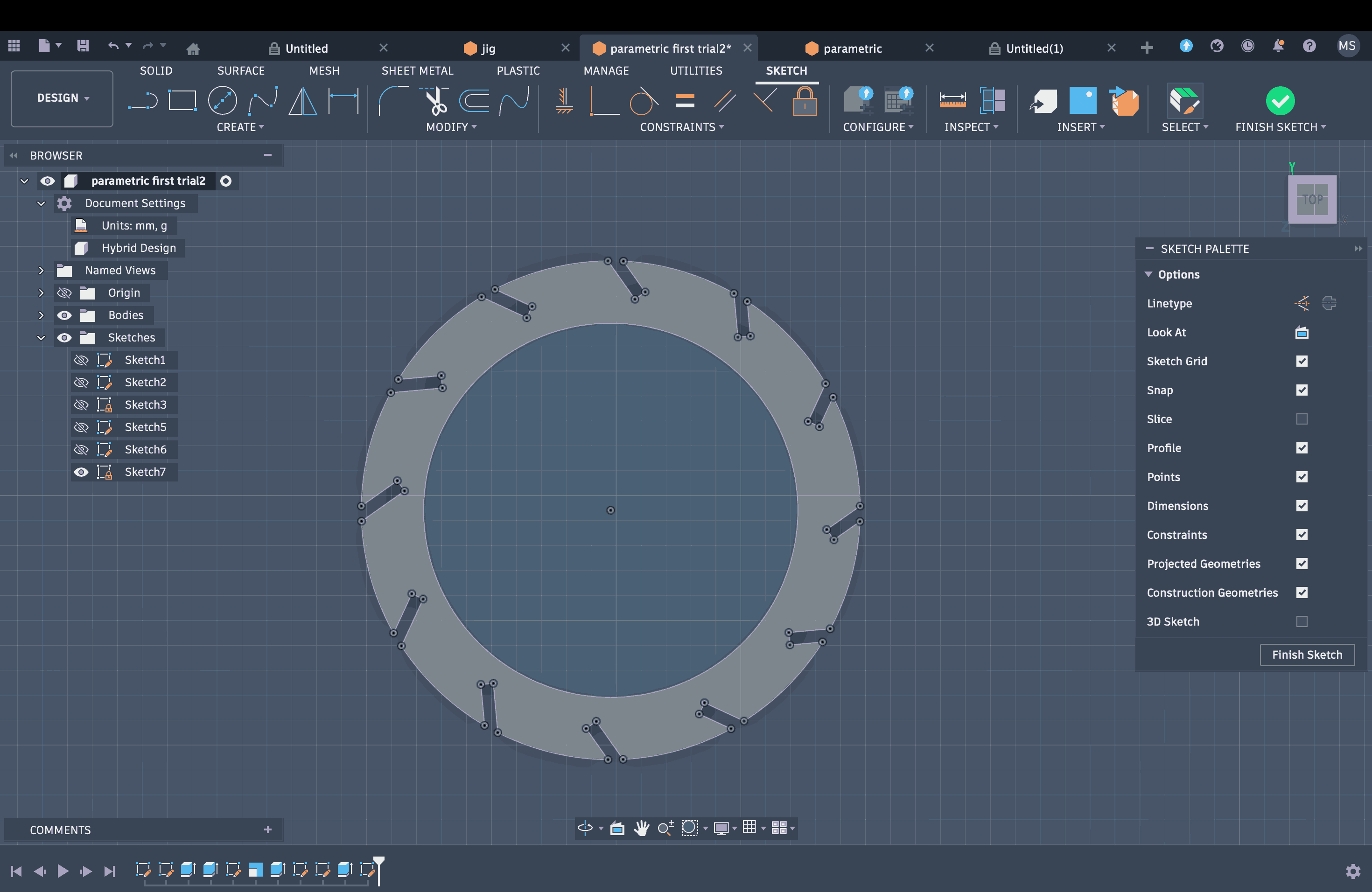 After that, I added another constraint for the number of slots, which was set to 12. I then drew a single slot, applied the parameters, and used the circular pattern tool along with the slot number parameter to create the remaining slots around the original circle.