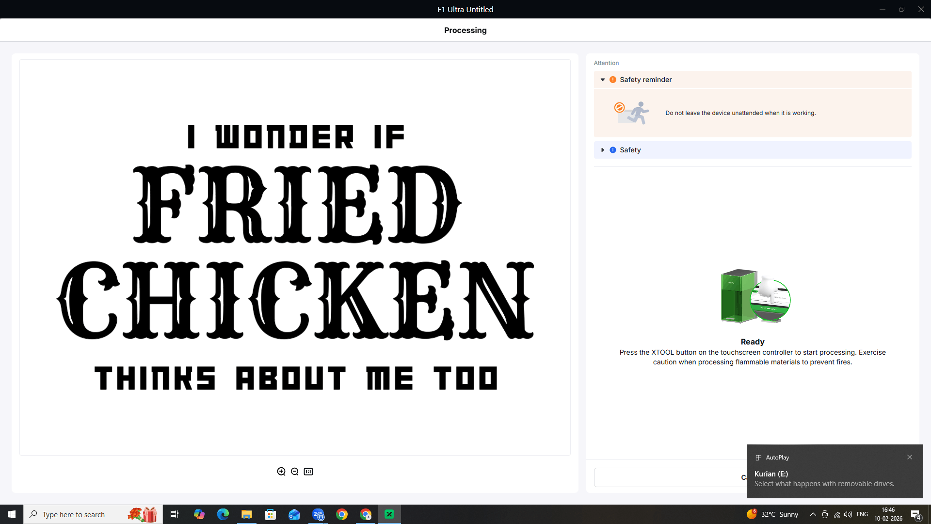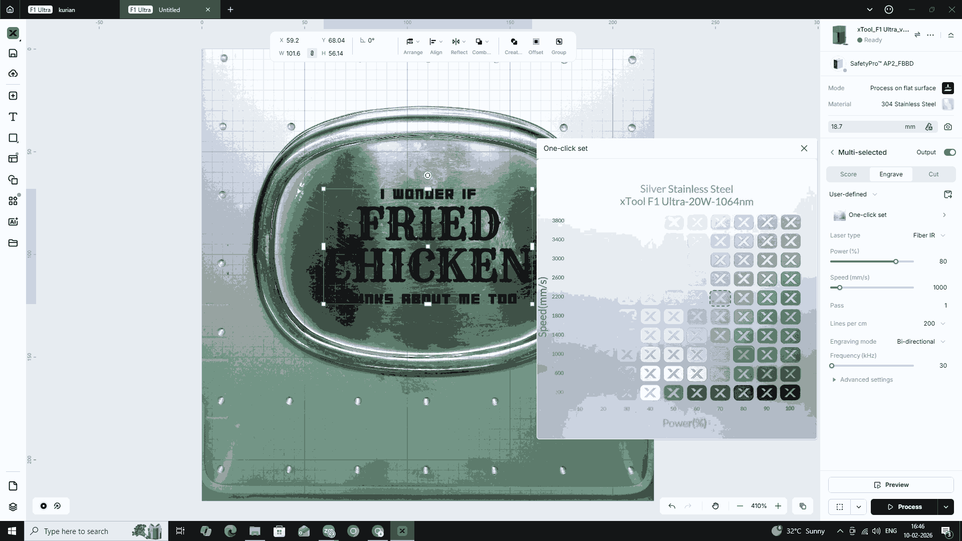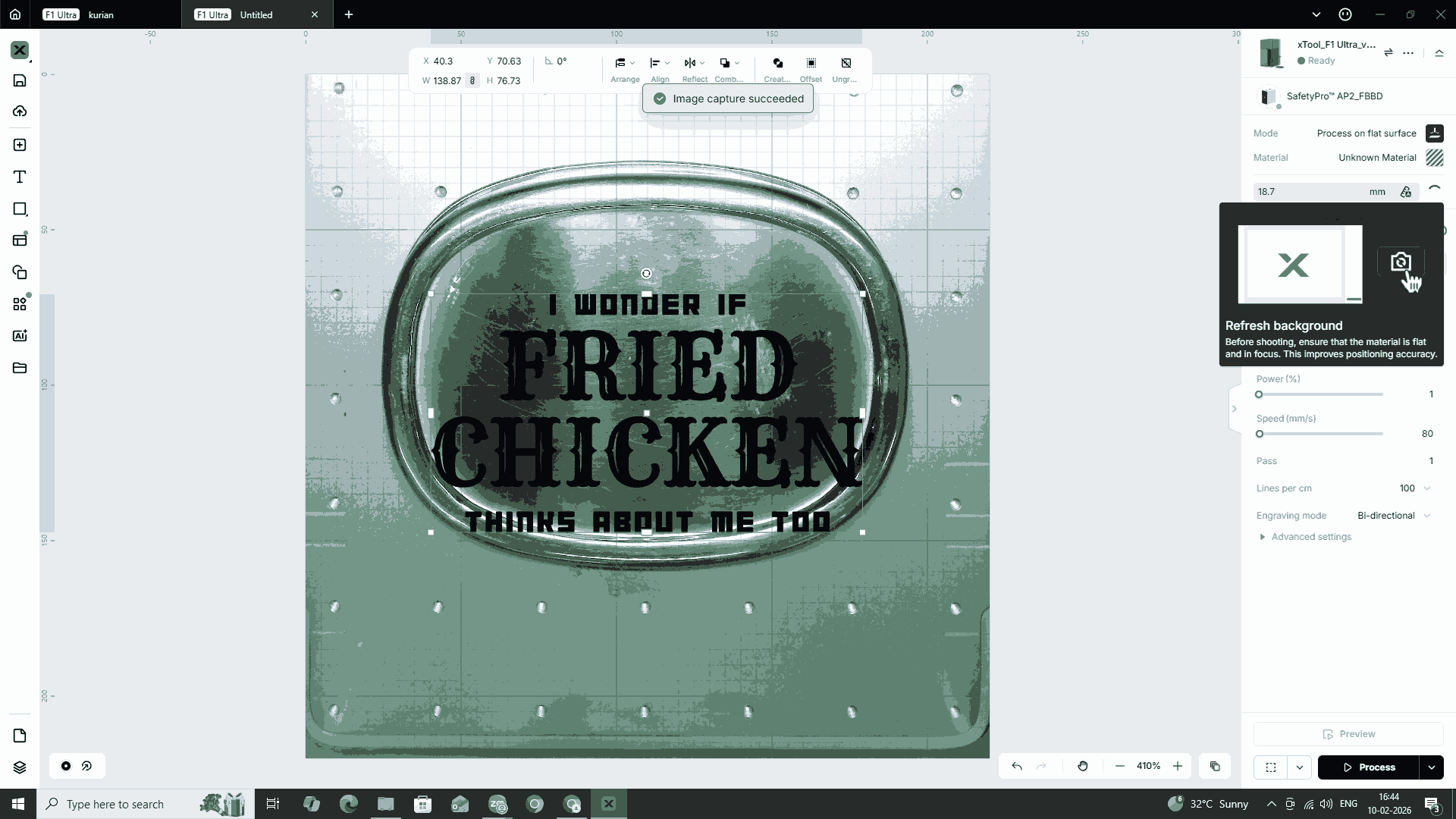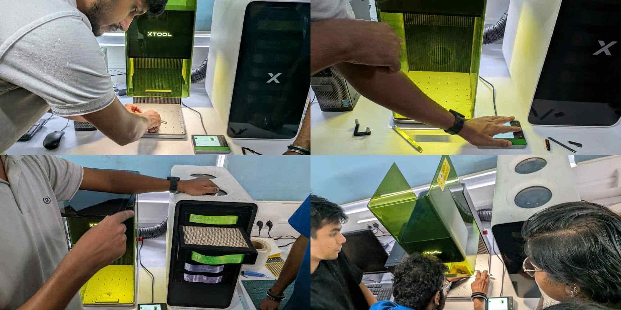 I placed the object, the lid of my tiffin box, on the XTool base. I then sent the prepared SVG file to the system connected to the machine using Send Anywhere and opened it in the XTool software. Since the lid was made of stainless steel, which is a reflective material, I had to manually adjust the focus on the XTool machine. The machine has an internal camera that captures the placement of the object, allowing precise digital positioning of the engraving file on the surface.