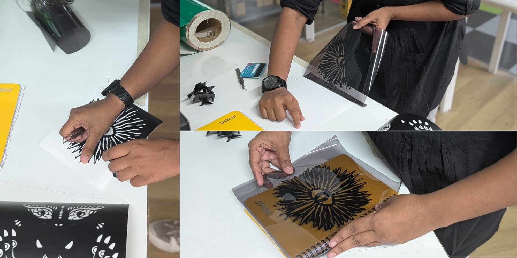 Later, I used a transfer sheet to lift the required part of the sticker from the vinyl sheet and pasted it onto the notebook cover of my classmate, Ashtami. She wanted the sticker on her cover.