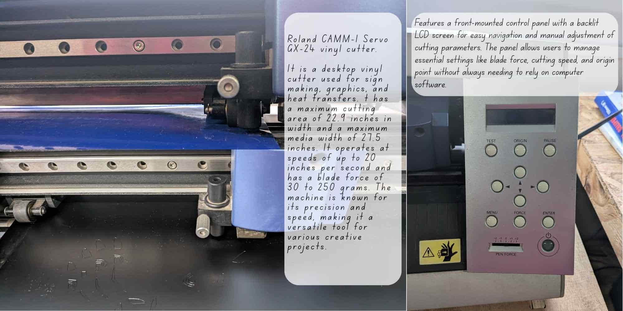 Vinyl cutting is a fabrication process used to cut patterns and shapes into vinyl sheets for producing stickers and decals of various sizes. The machine used is a Roland GX-24 / GS-24, equipped with an adjustable blade holder that allows control over cutting depth and blade replacement. Cutting is achieved through the coordinated motion of the blade along the X-axis and the movement of the vinyl sheet along the Y-axis, enabling precise cutting in the XY plane.