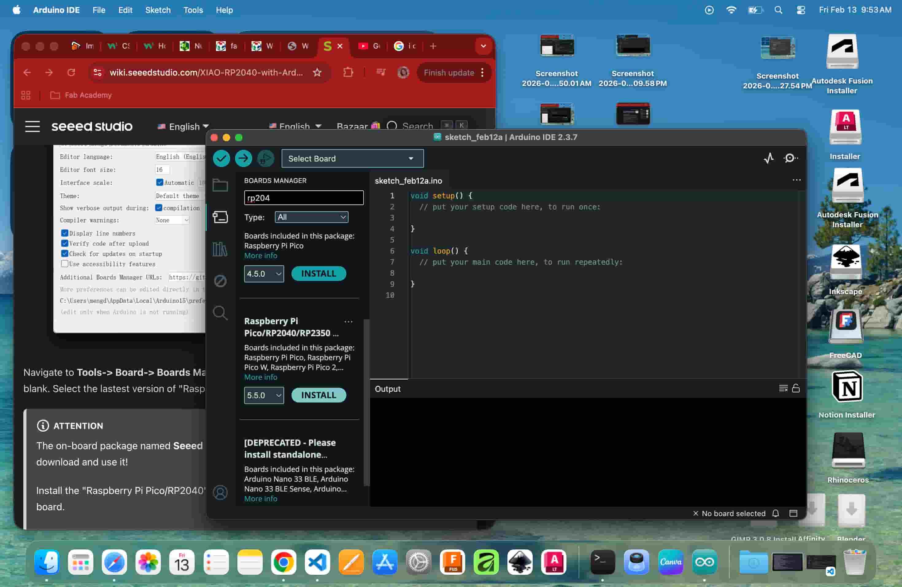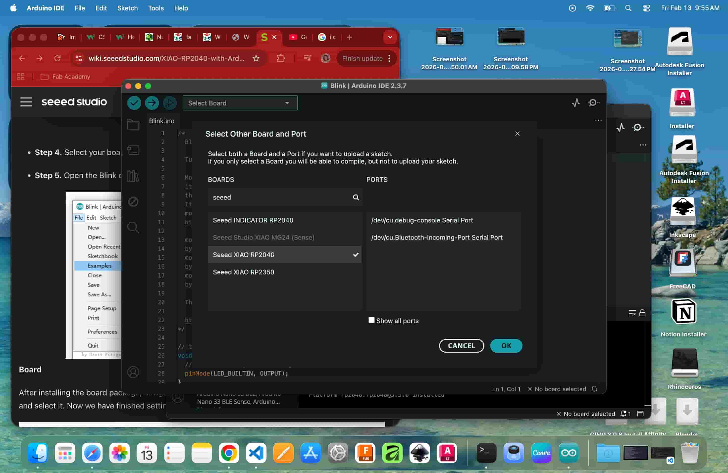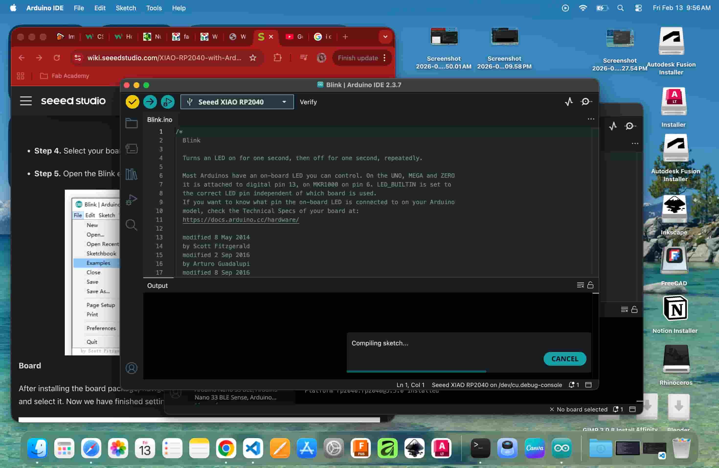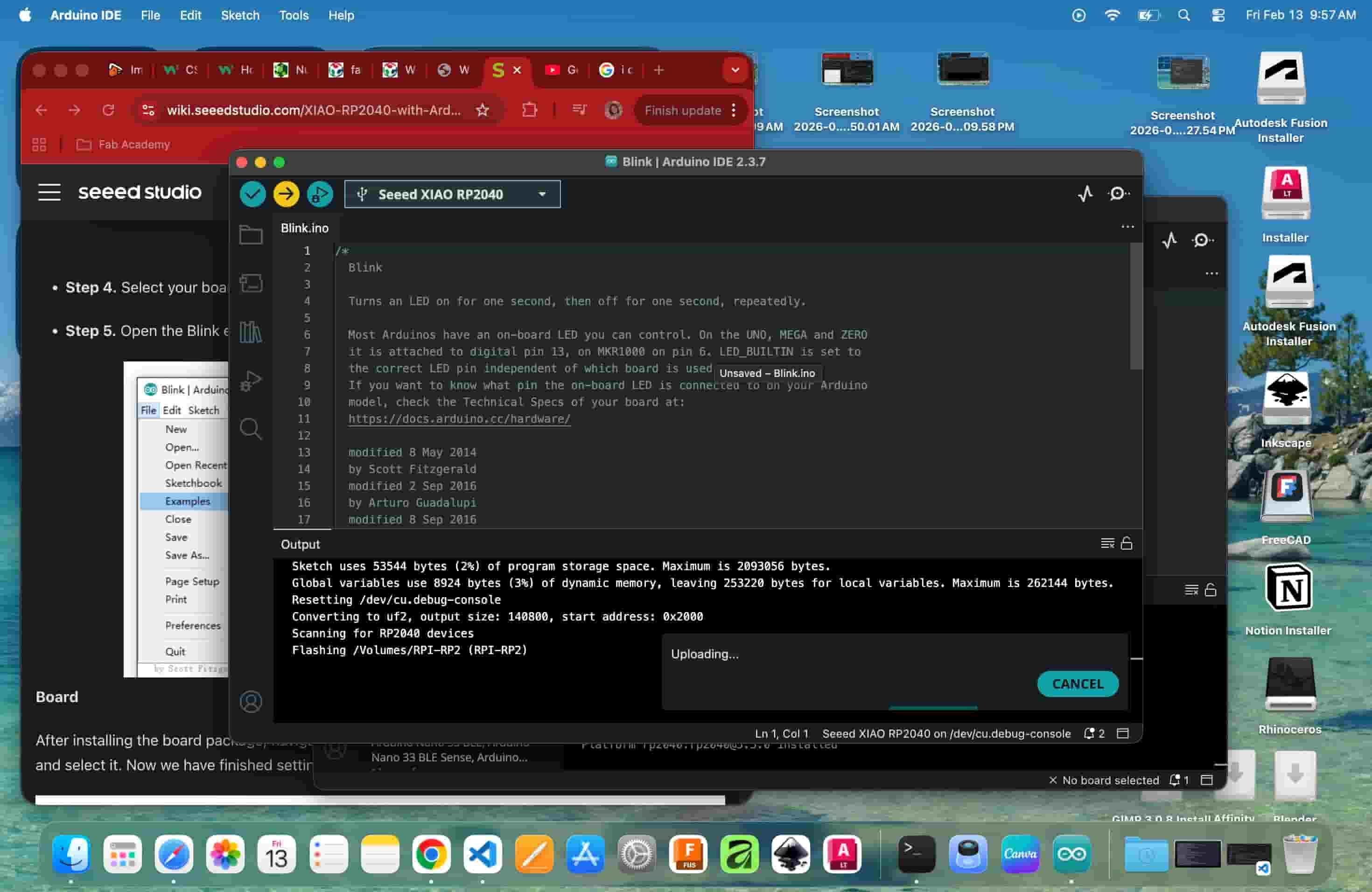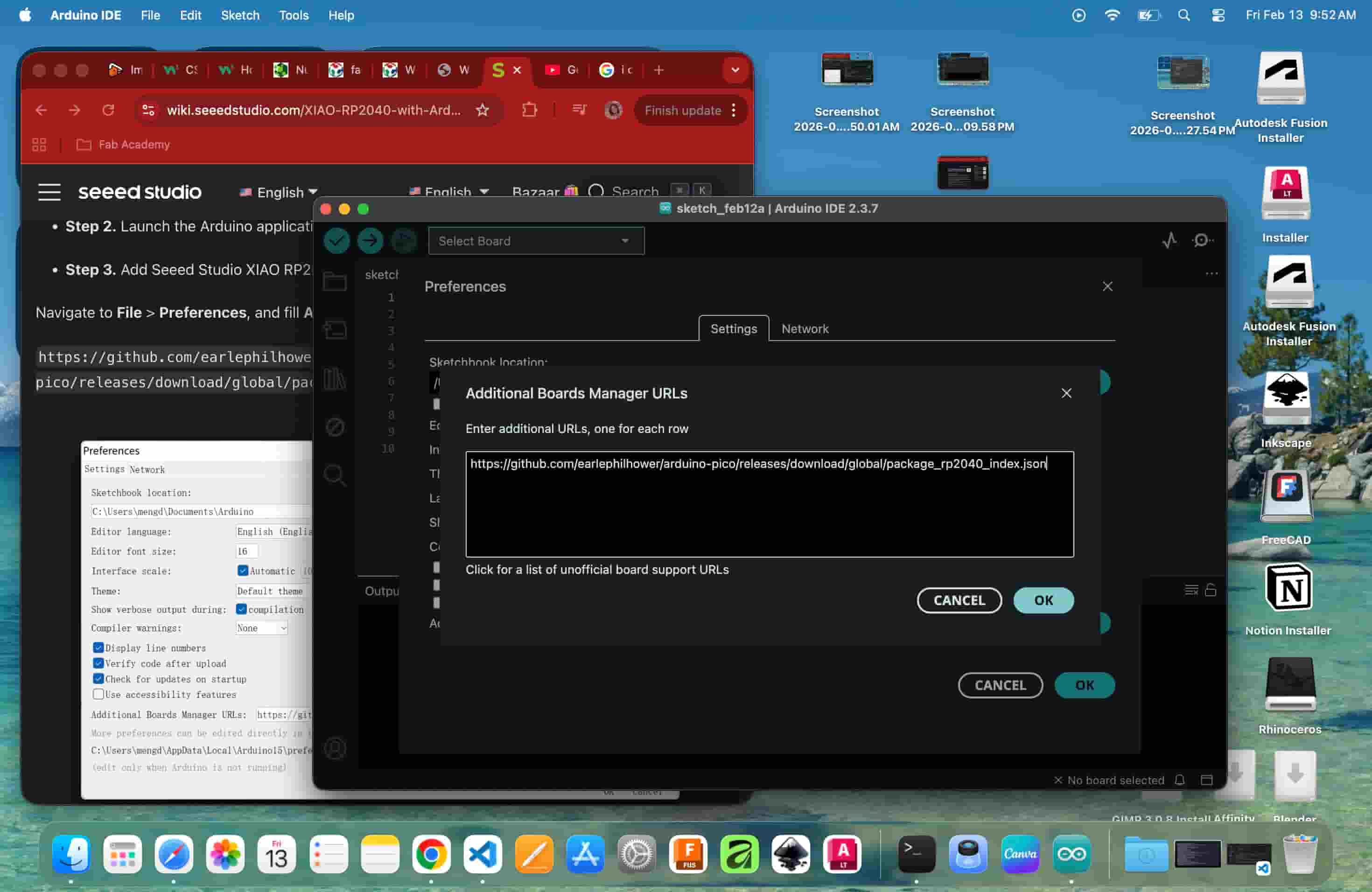 I connected the XIAO RP2040 to my MacBook using a USB-C cable and installed Arduino IDE. The setup was done by following the instruction from https://wiki.seeedstudio.com/. There was one change though, for mac, the preferences is not under the File menu but the Arduino IDE menu. I had a hard time figuring the very first step but the rest were according to the website.