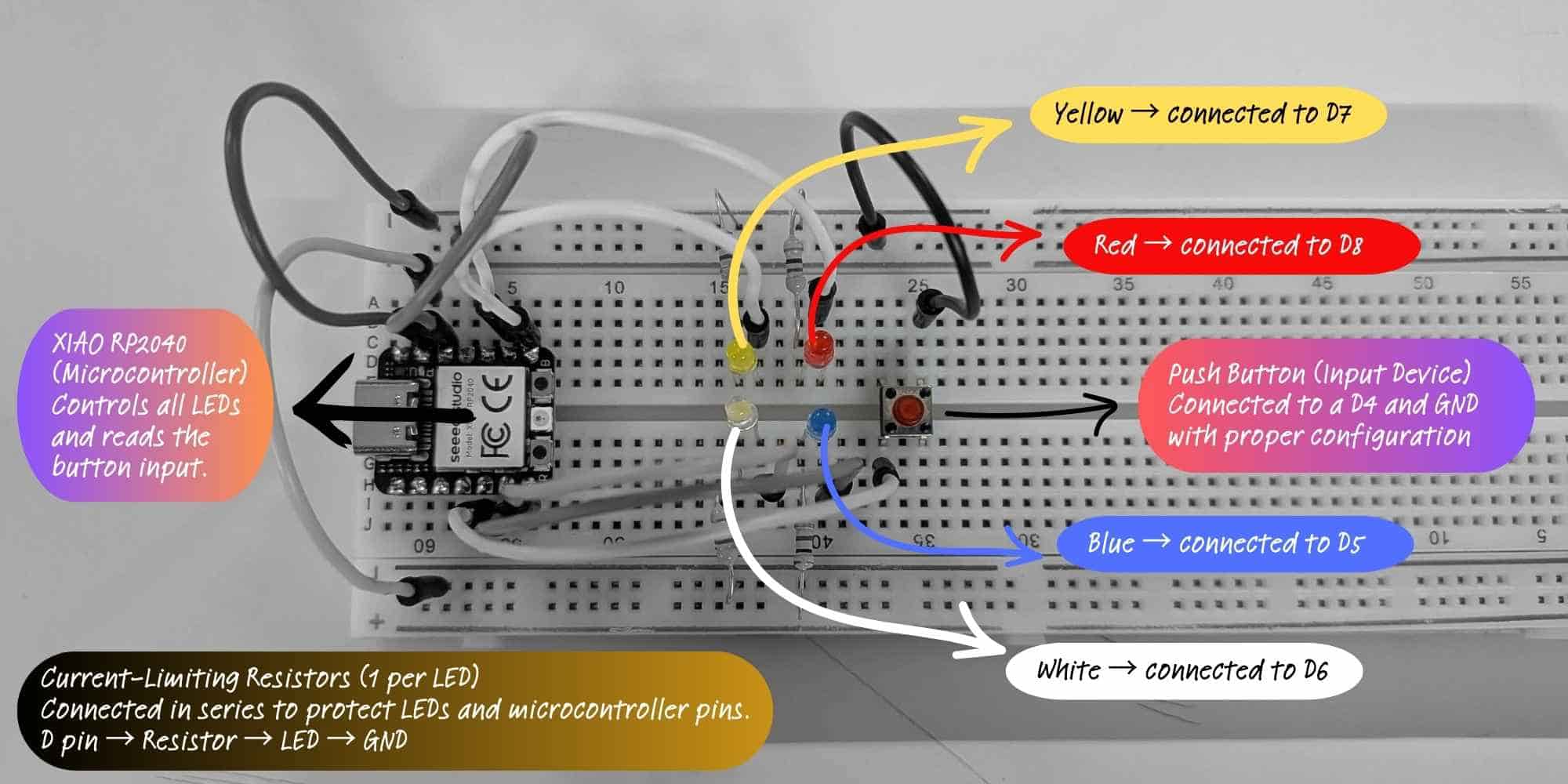 This is the completed circuit after correcting grounding issues. Each LED (yellow, white, blue, red) is connected to a separate D pin on the XIAO RP2040, with an individual current-limiting resistor connected in series. All LEDs share a common ground rail connected to the XIAO’s GND pin. The push button is connected to D4 and GND and configured as an input device in the program. When pressed, it triggers the LED chase sequence. This setup represents a complete input-output embedded system: