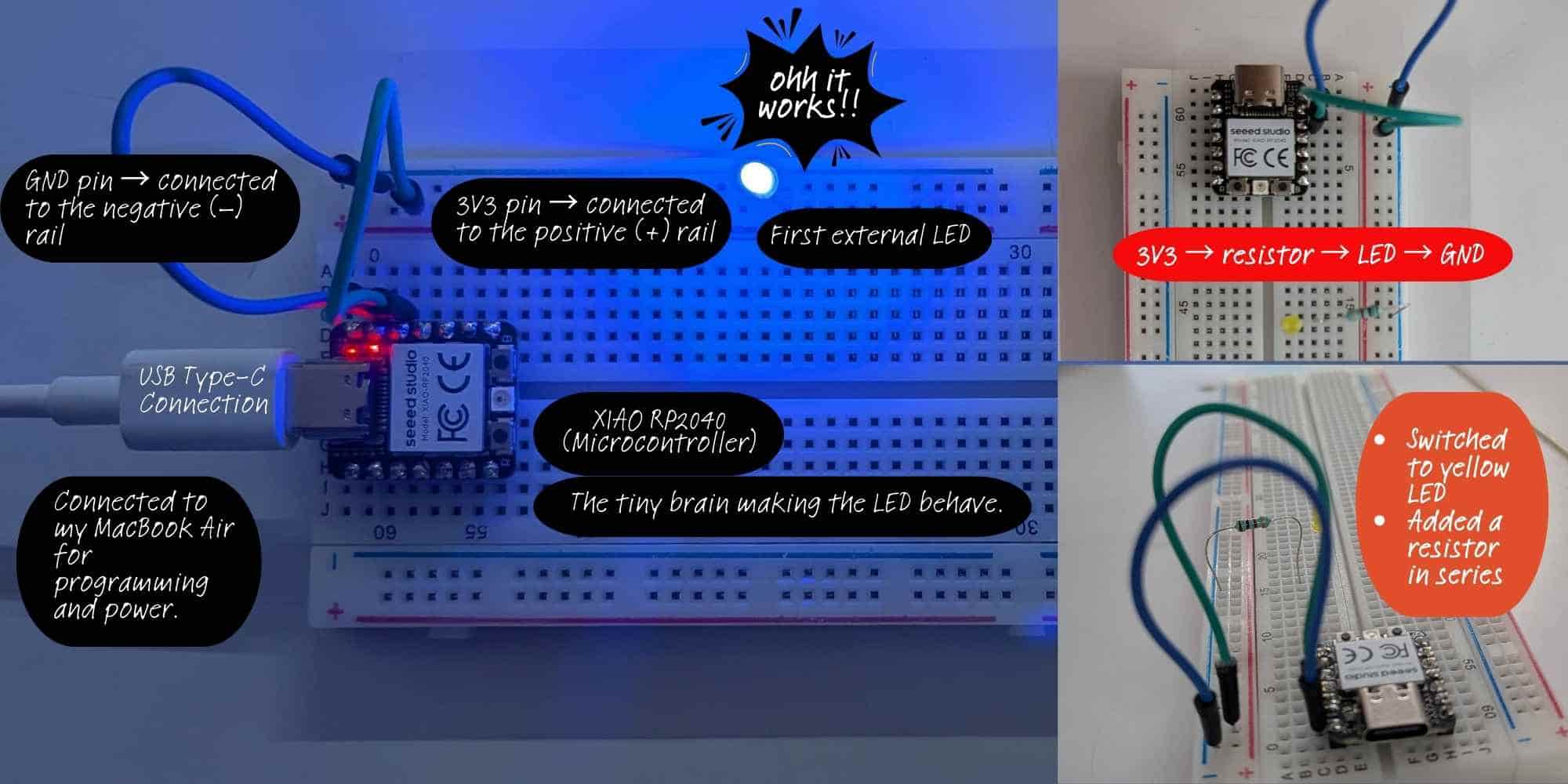 In this setup, I powered my first external LED directly using the 3V3 and GND pins of the XIAO RP2040.