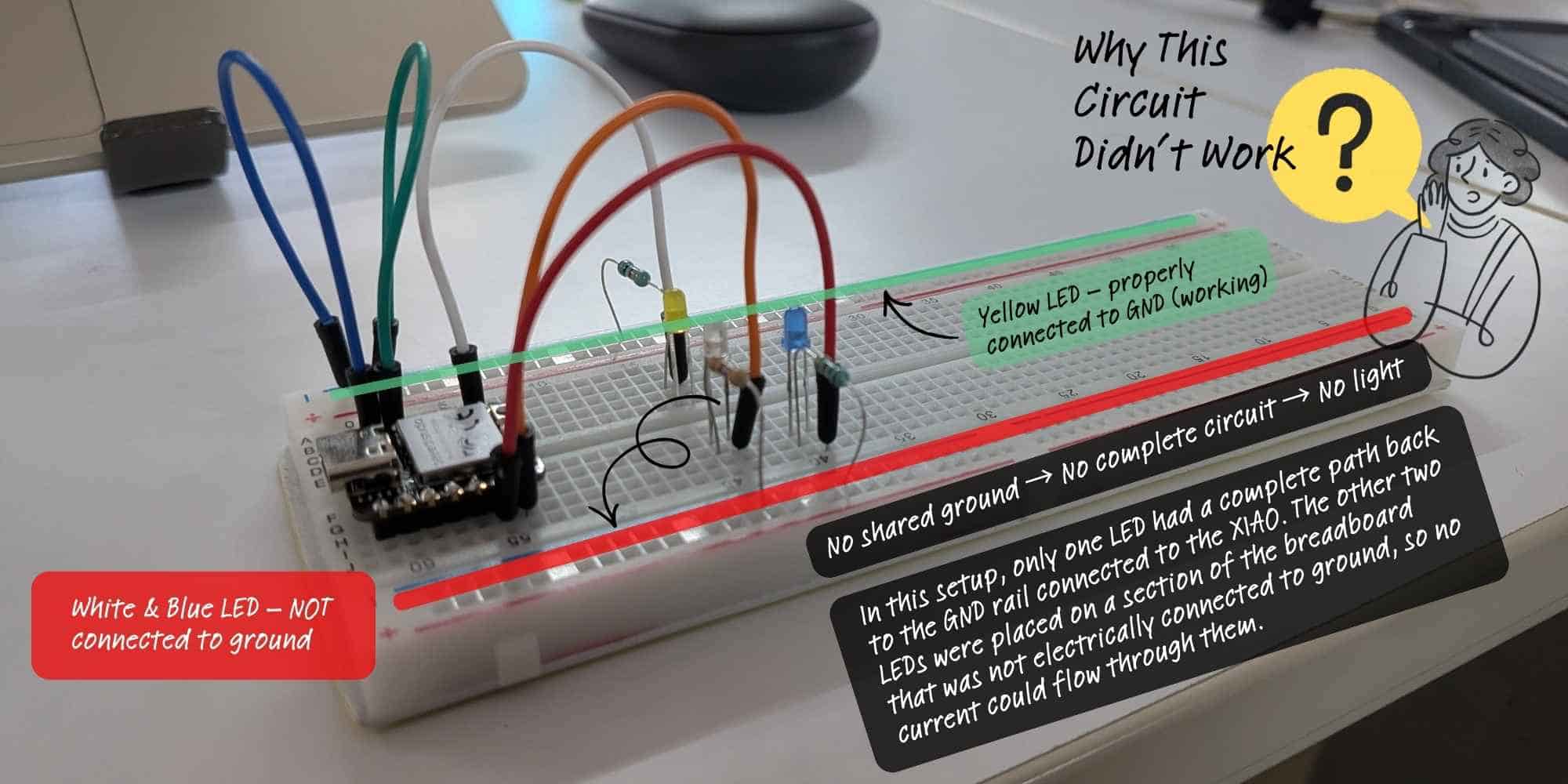 When I moved from lighting a single LED to connecting multiple LEDs for the chase sequence, I assumed I had wired everything correctly because each LED had its own resistor and was connected to a D pin. However, the circuit did not work as expected. The issue was not in the code, it was in the grounding. Only one LED had a proper connection back to the GND rail linked to the XIAO RP2040. The other LEDs were placed on a section of the breadboard that was not electrically connected to the ground line. Even though the wiring looked correct visually, the circuit was incomplete for two of the LEDs, so no current could flow through them. This mistake helped me understand that every component must share a common ground, and that breadboard power rails are not automatically connected across sections.